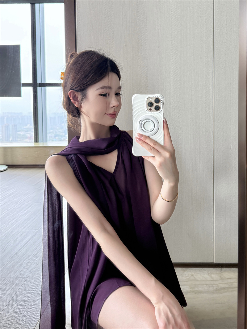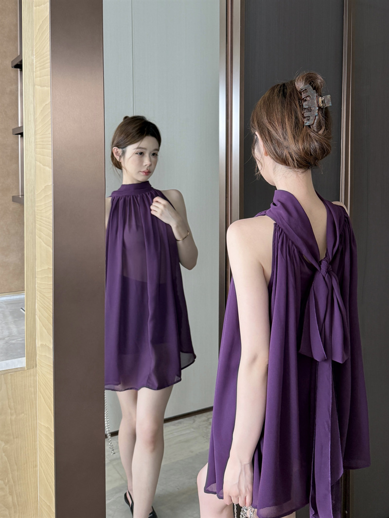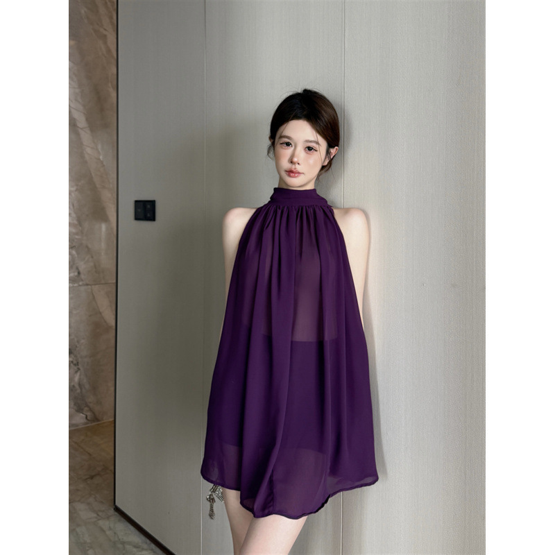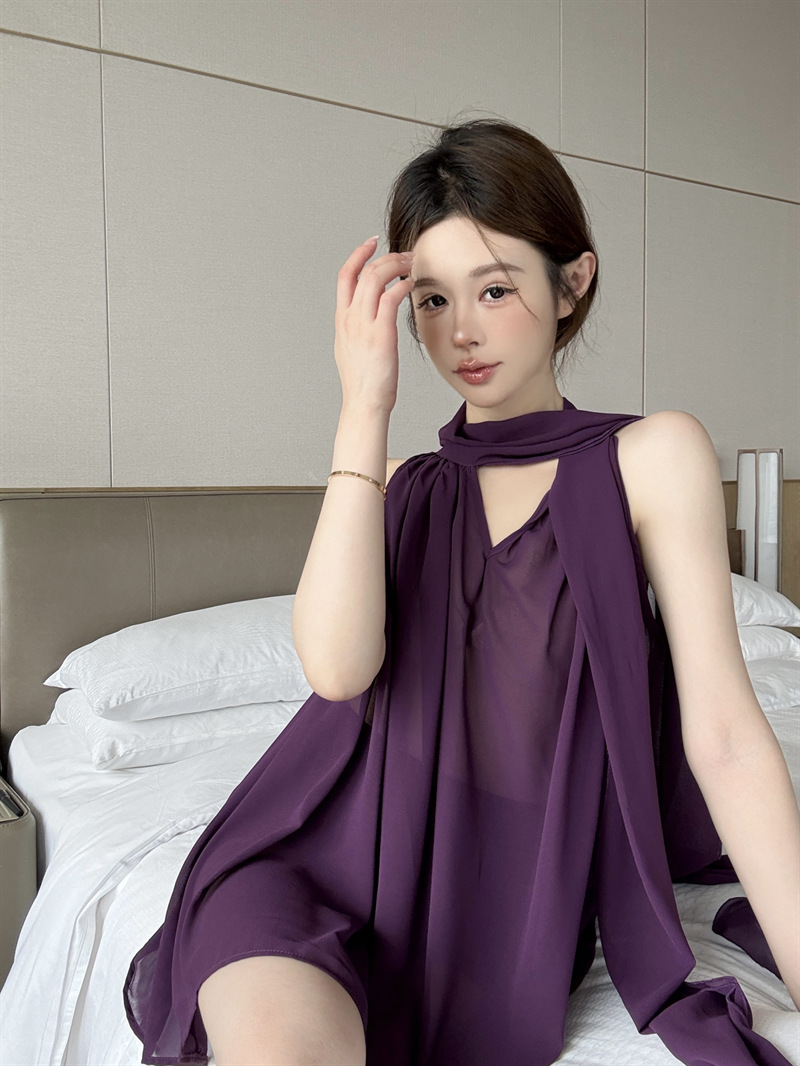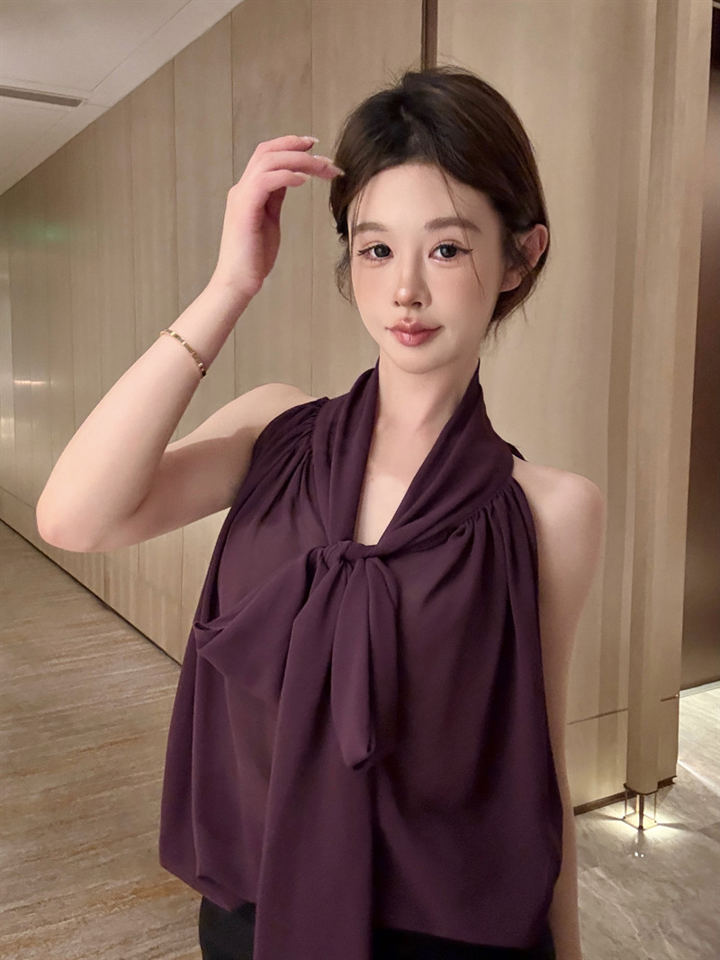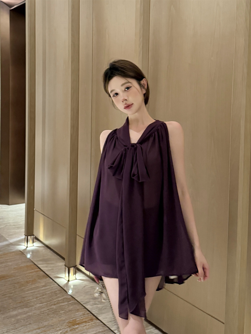 리얼 샷 여름 순수한 욕망 크루 넥 바느질 느슨한 중간 길이 웨스턴 스타일 민소매 양면 풀오버 시폰 셔츠스토어 가기