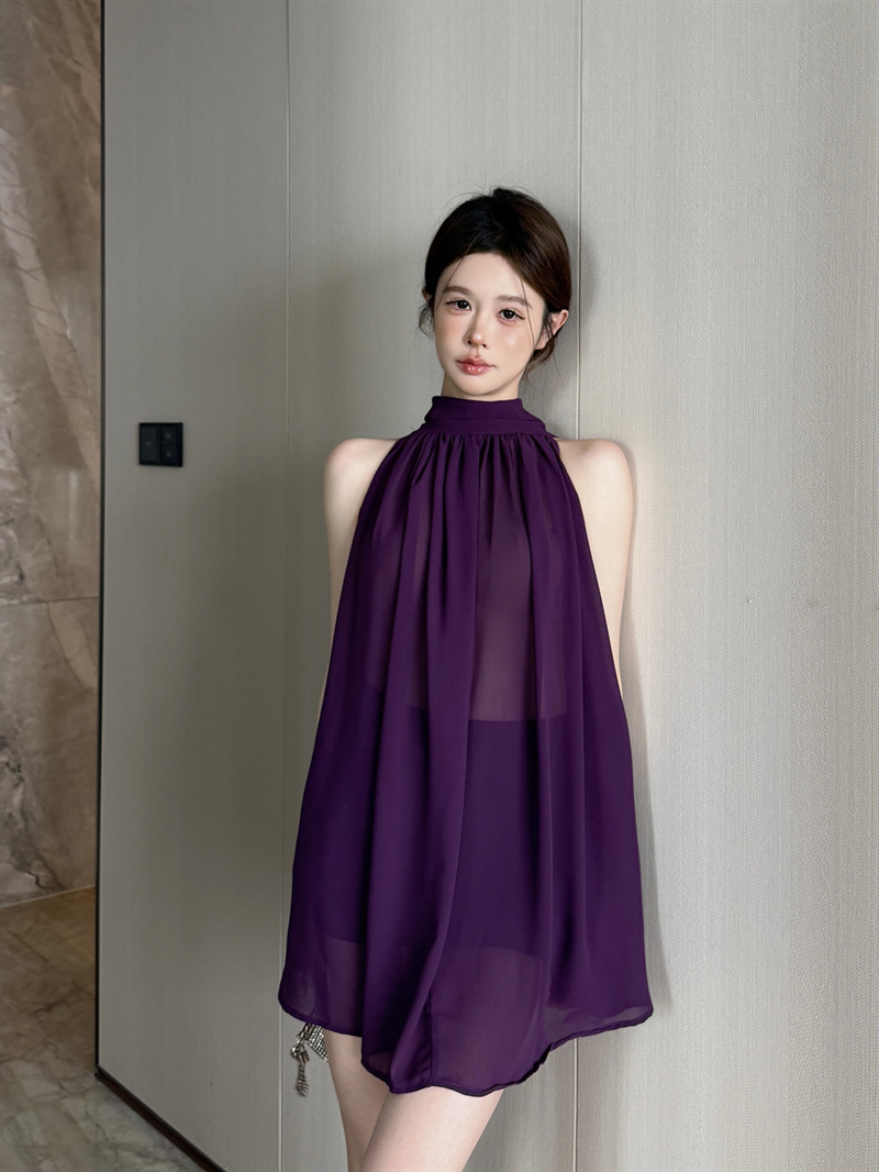 리얼 샷 여름 순수한 욕망 크루 넥 바느질 느슨한 중간 길이 웨스턴 스타일 민소매 양면 풀오버 시폰 셔츠