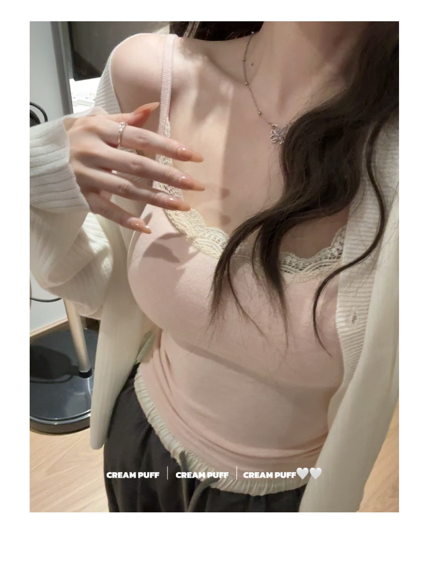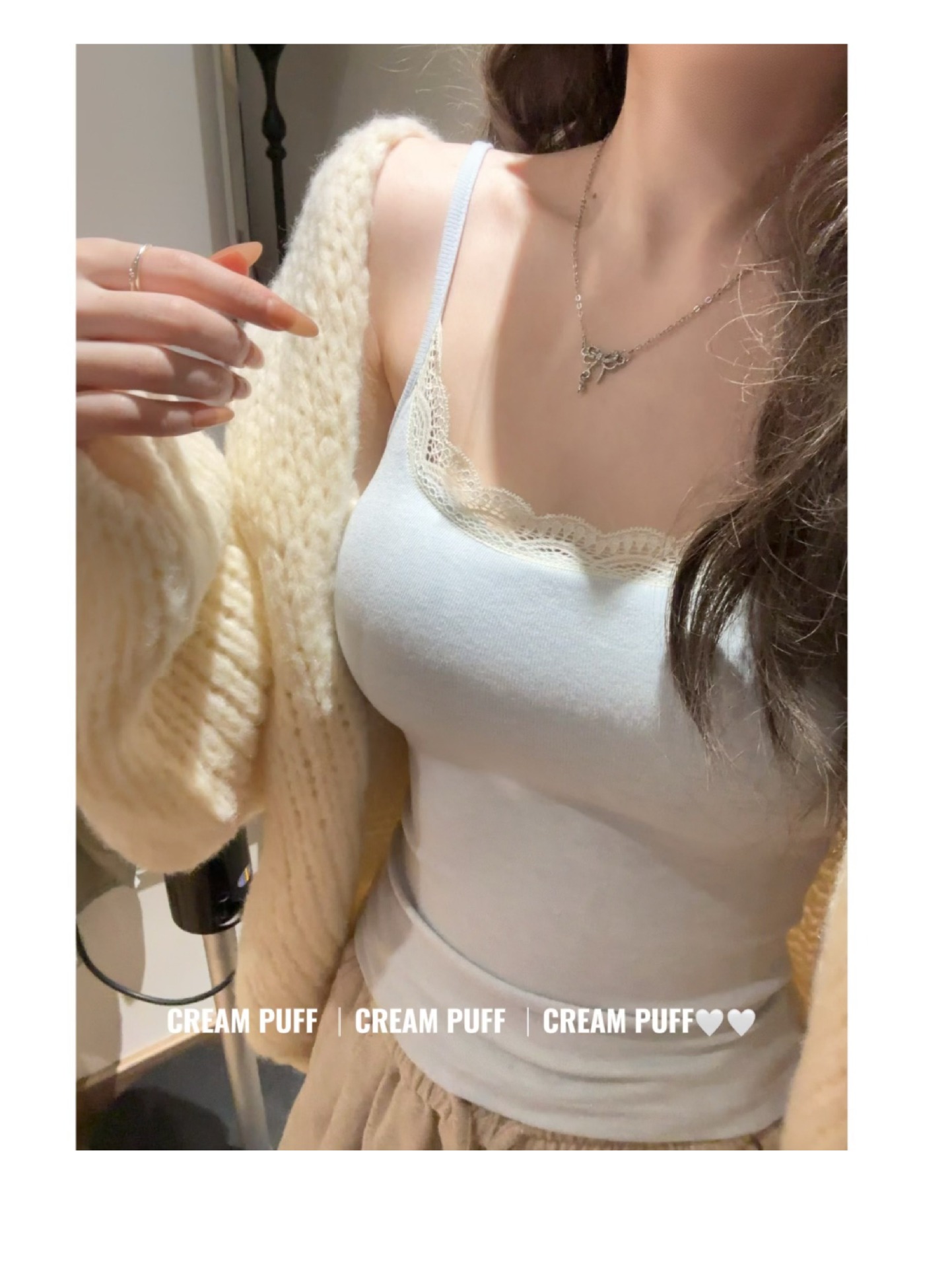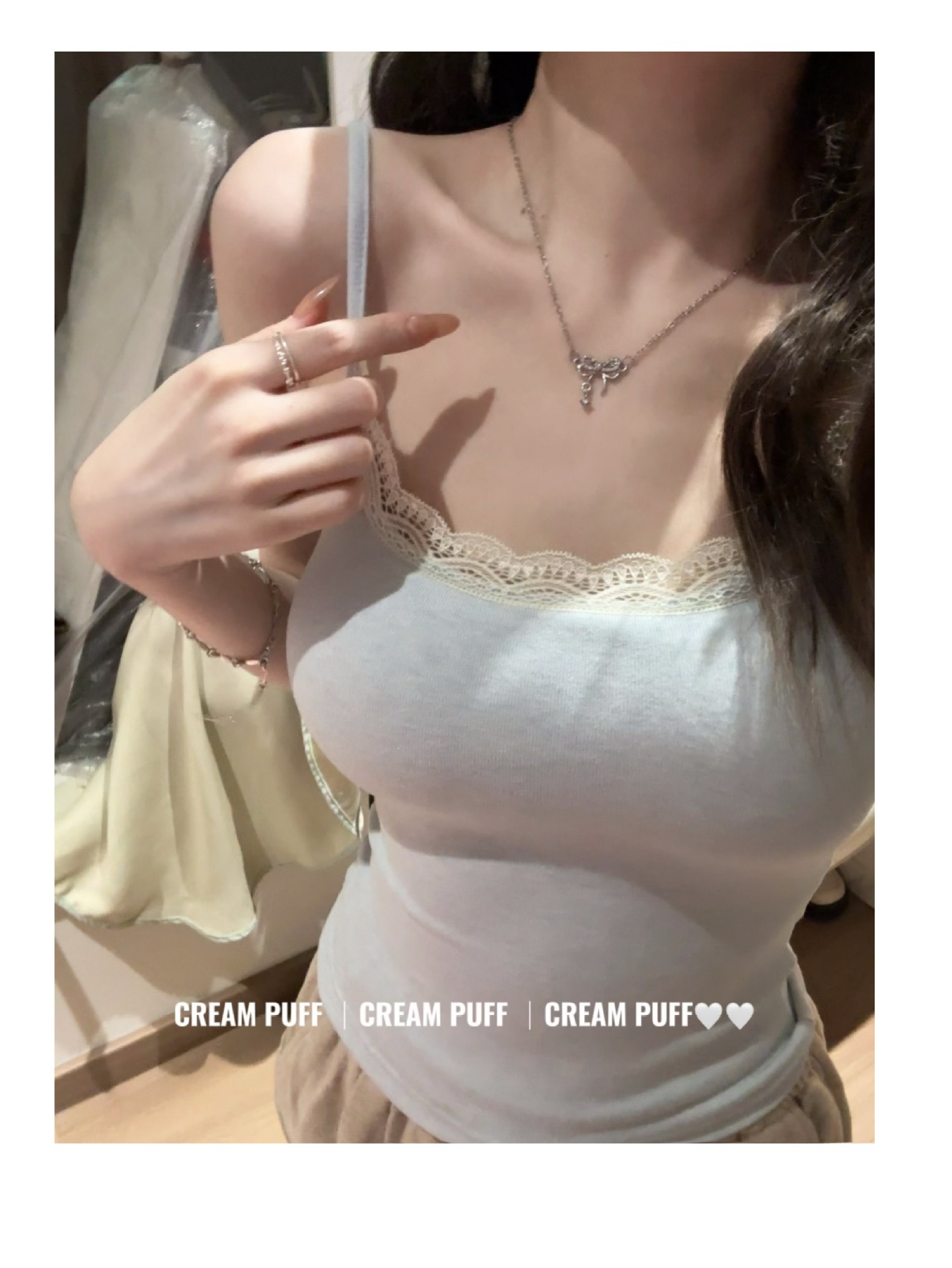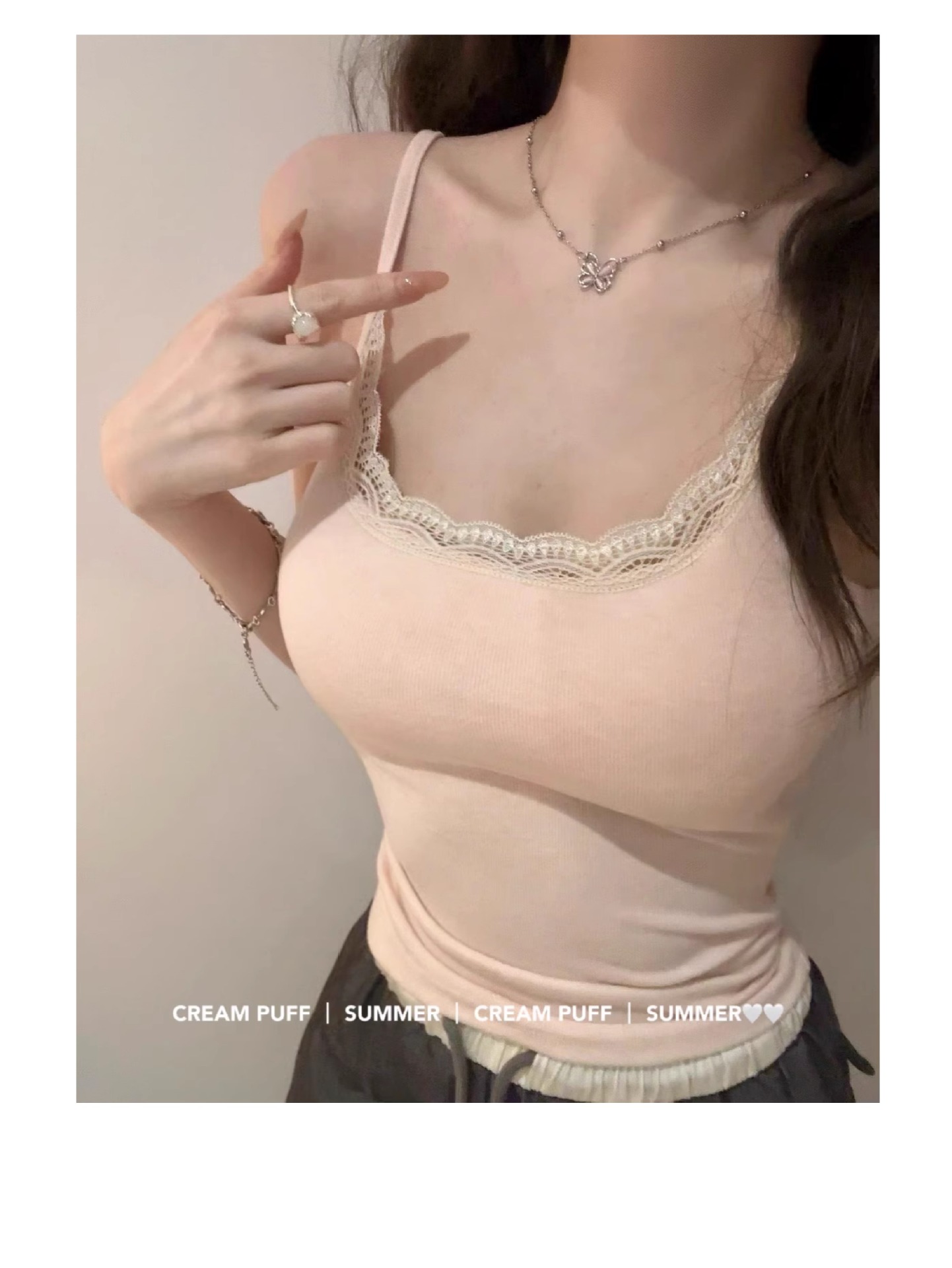 봄 여름 신상 달콤하고 매콤한 여성용 작은 서스펜더 조끼, 가슴 패드와 레이스 밑단 셔츠, 분위기 있는 슬림핏 탑