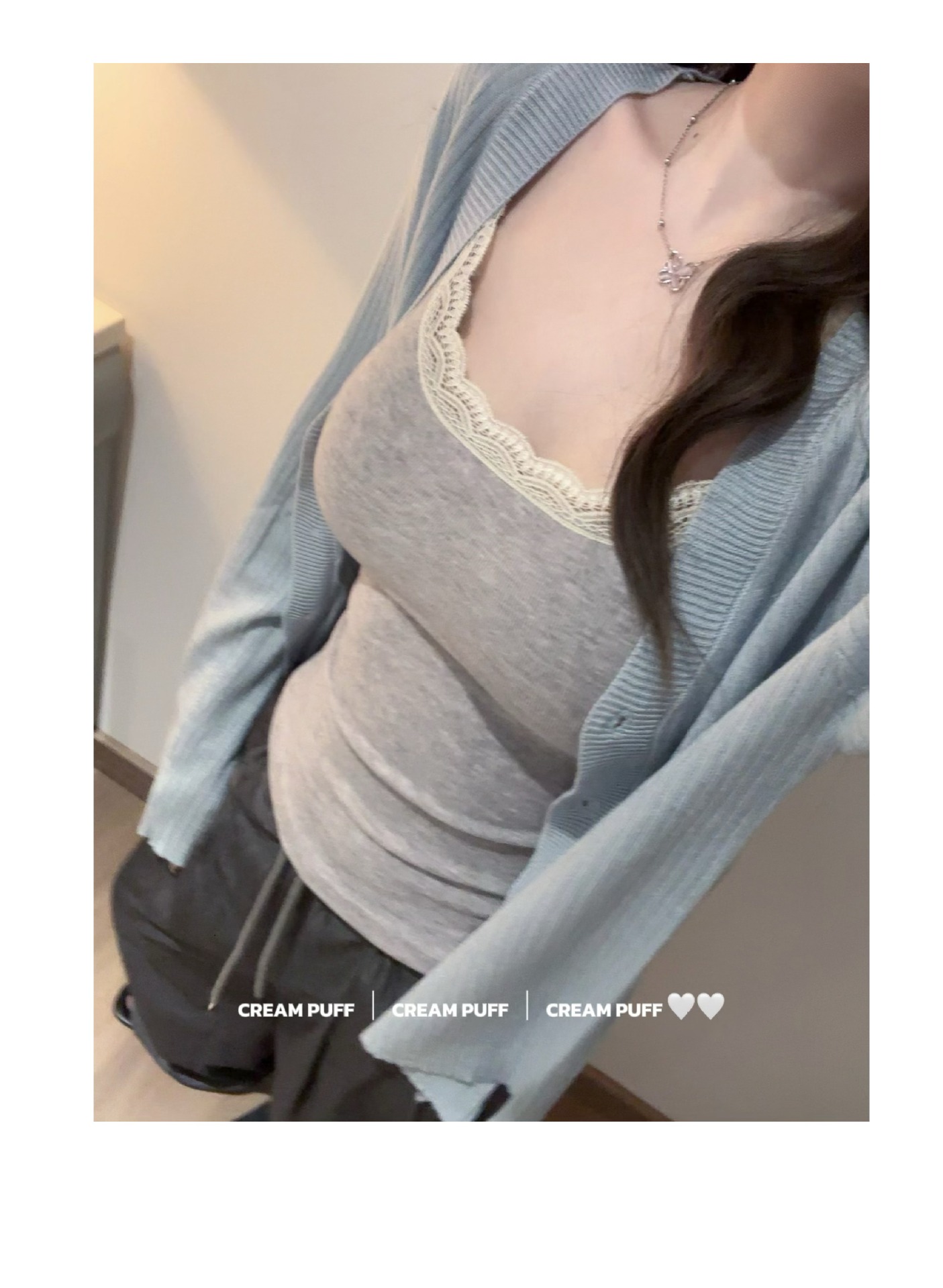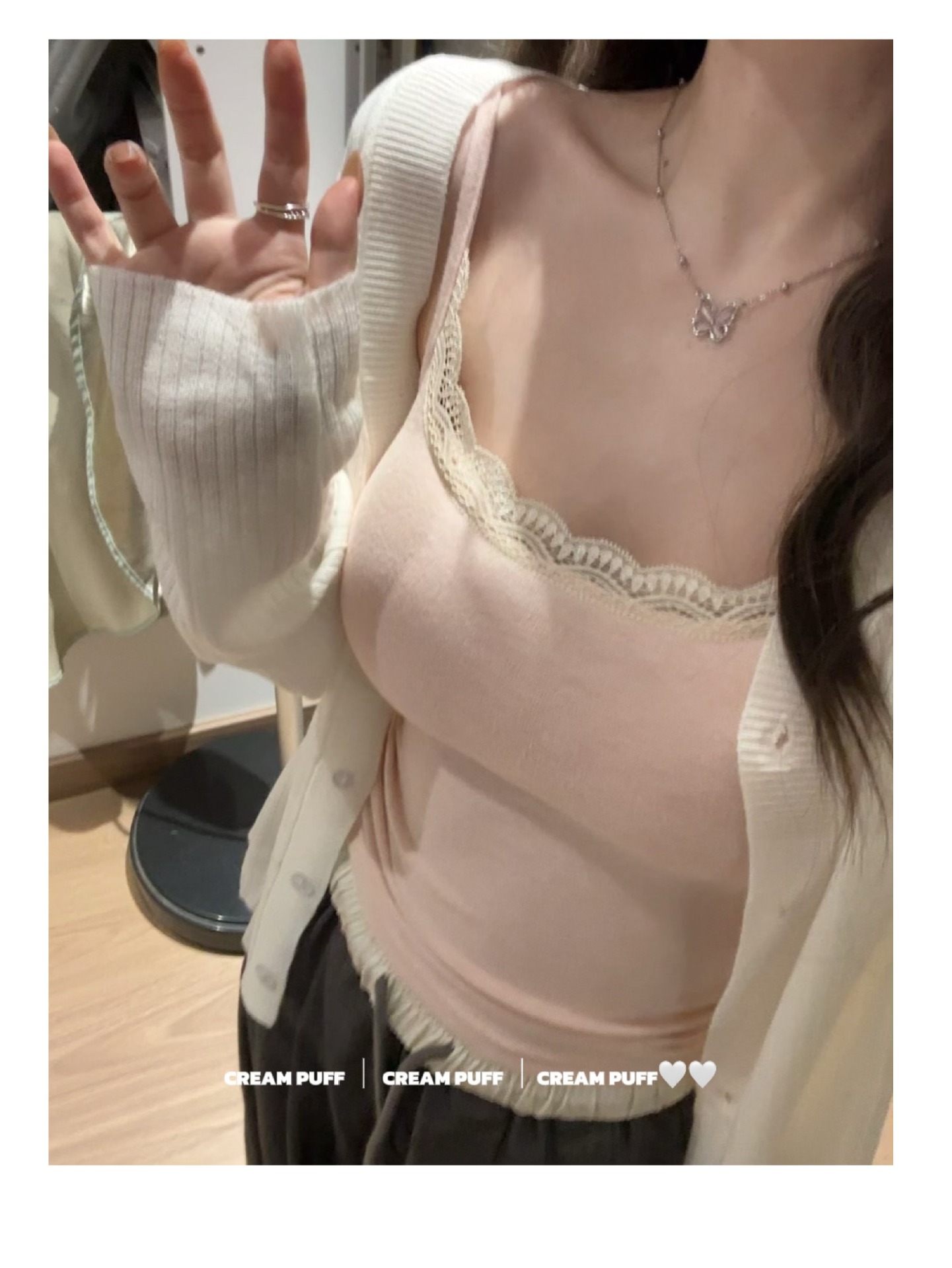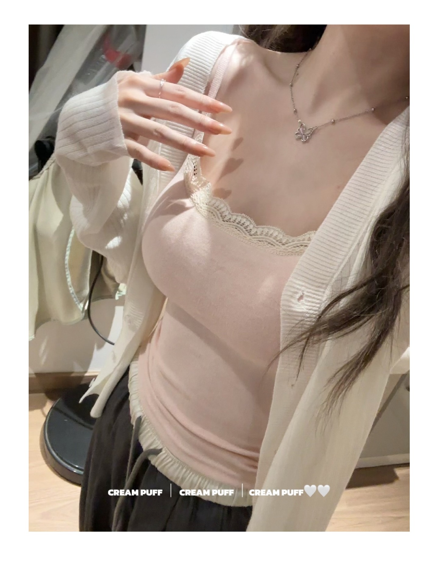 봄 여름 신상 달콤하고 매콤한 여성용 작은 서스펜더 조끼, 가슴 패드와 레이스 밑단 셔츠, 분위기 있는 슬림핏 탑