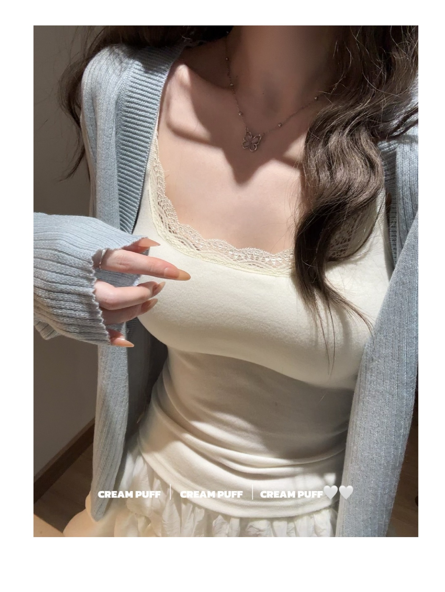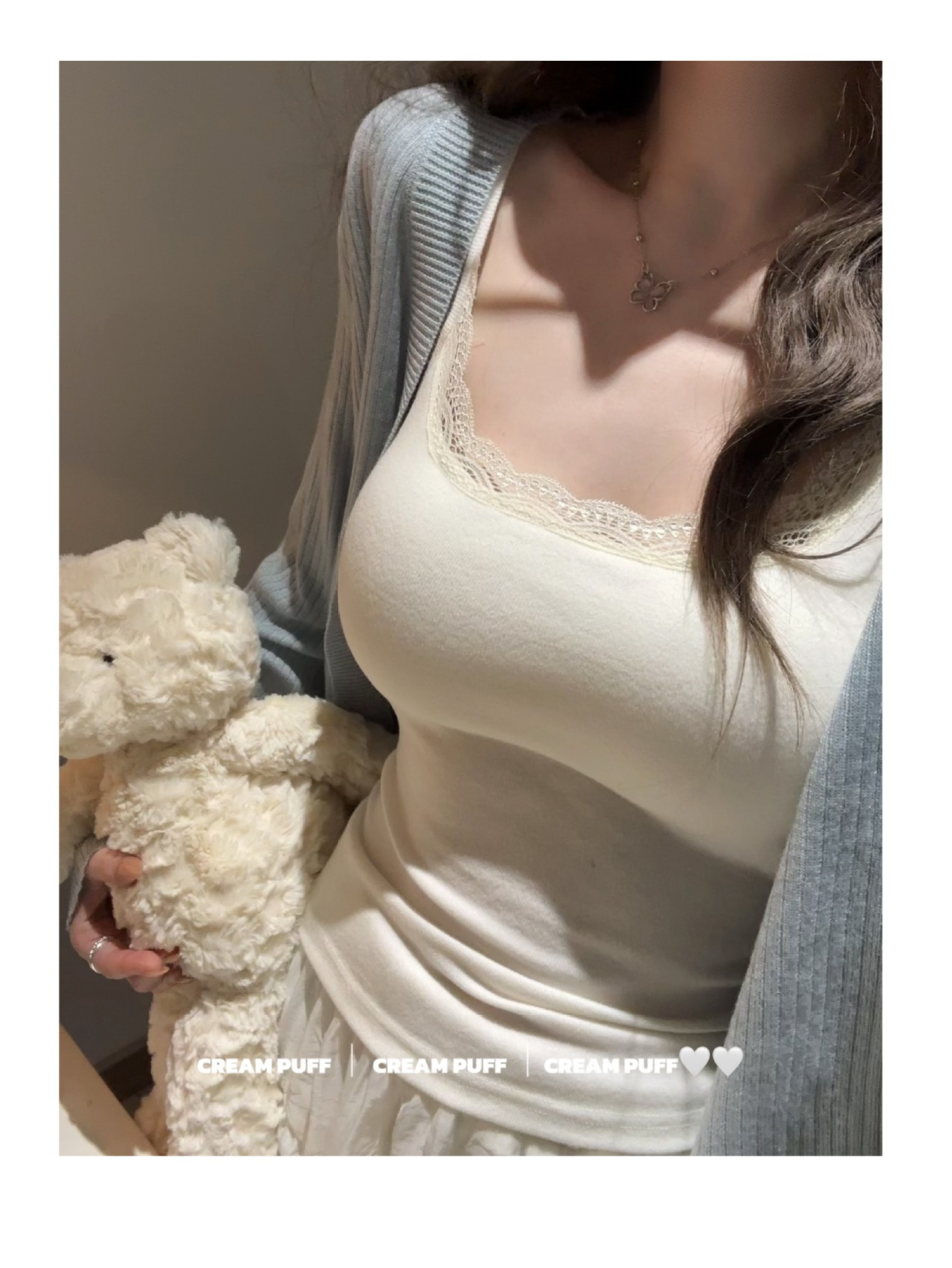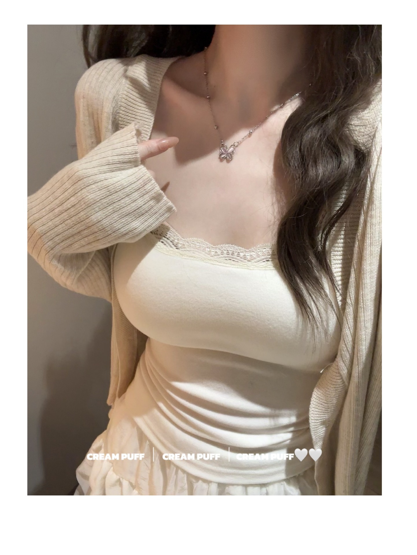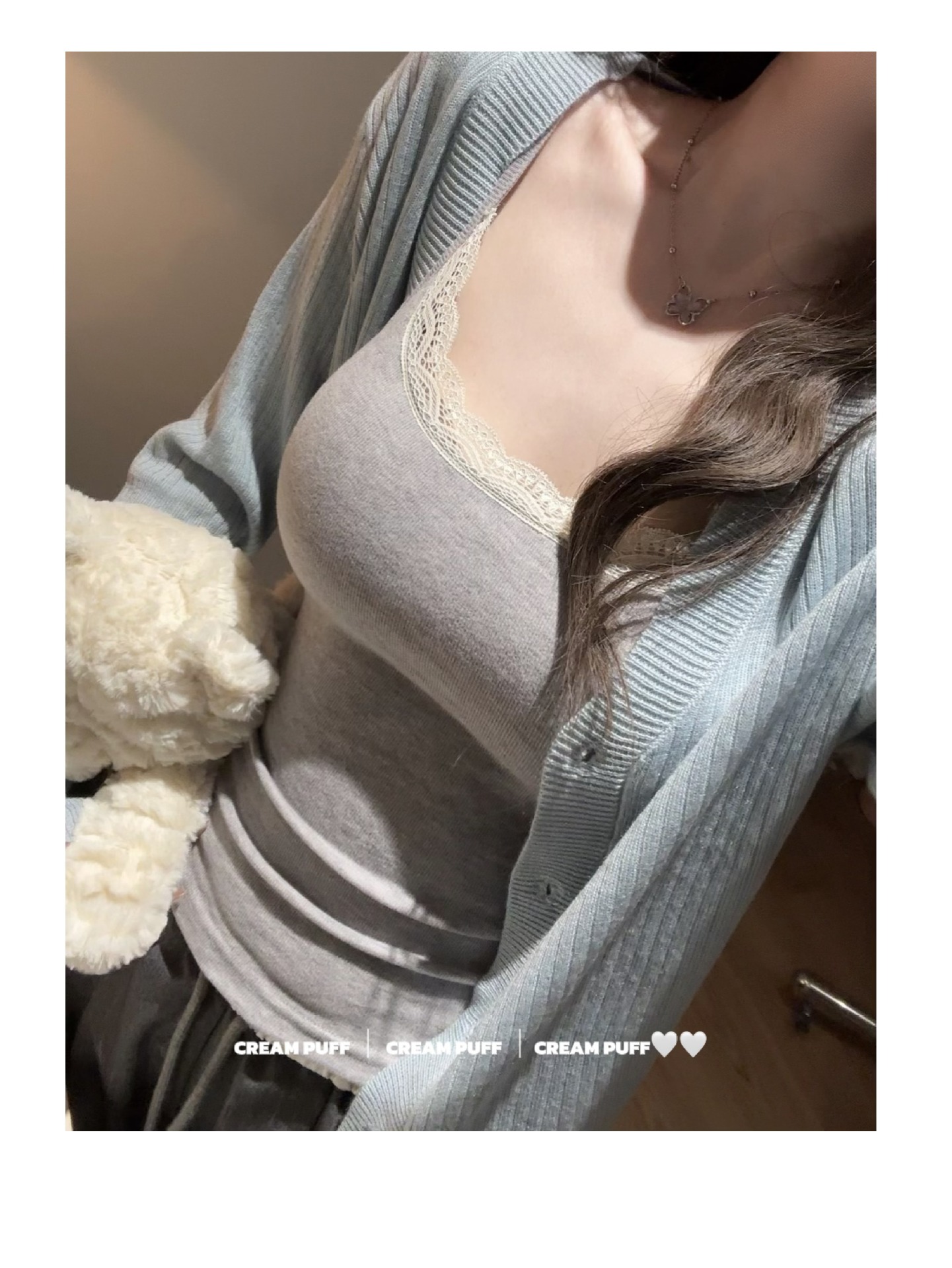 봄 여름 신상 달콤하고 매콤한 여성용 작은 서스펜더 조끼, 가슴 패드와 레이스 밑단 셔츠, 분위기 있는 슬림핏 탑