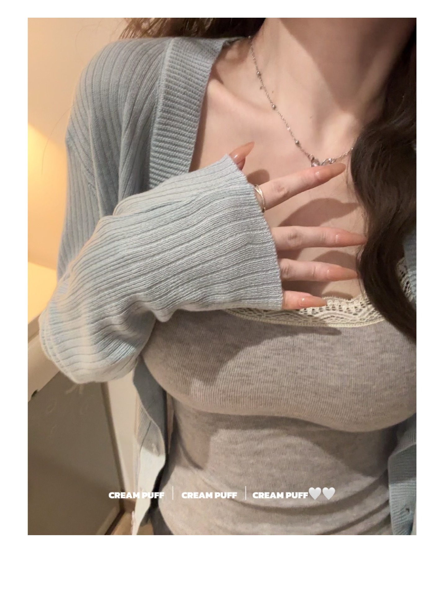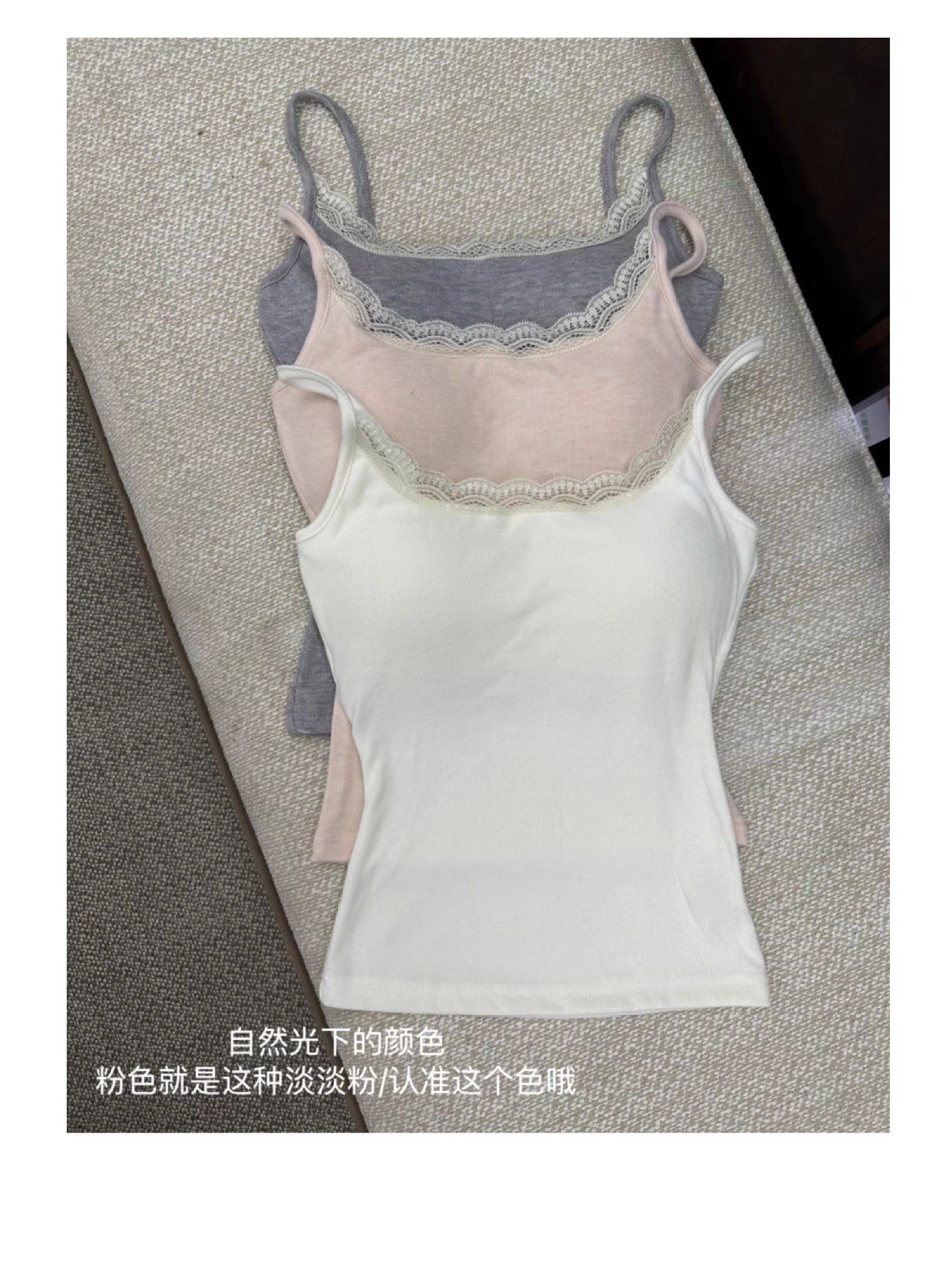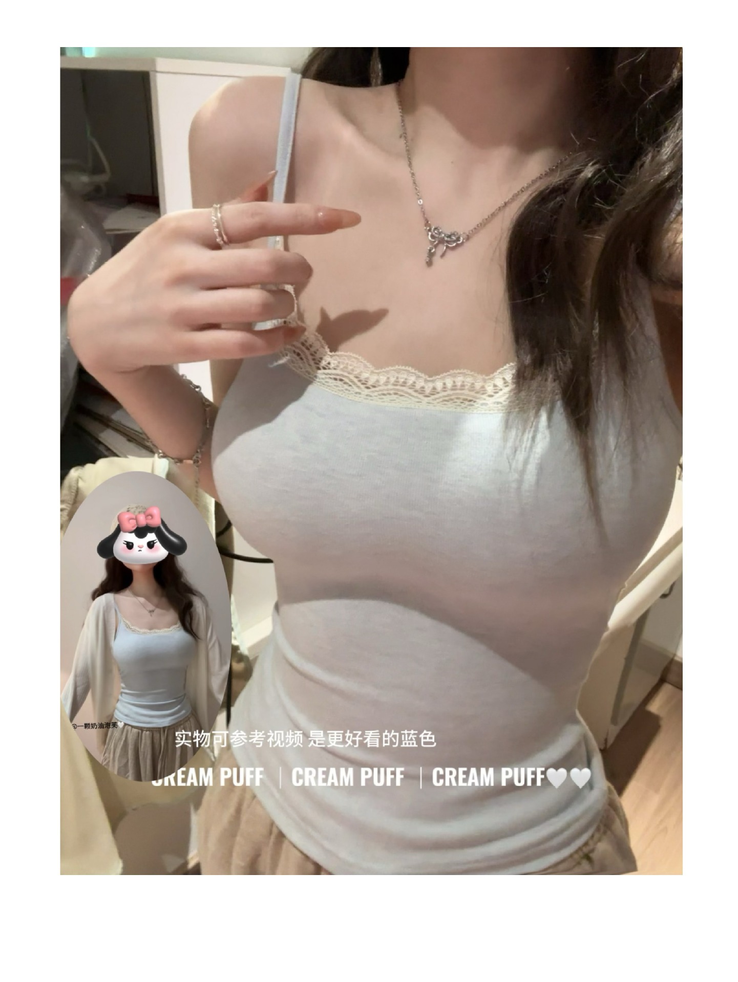 봄 여름 신상 달콤하고 매콤한 여성용 작은 서스펜더 조끼, 가슴 패드와 레이스 밑단 셔츠, 분위기 있는 슬림핏 탑스토어 가기