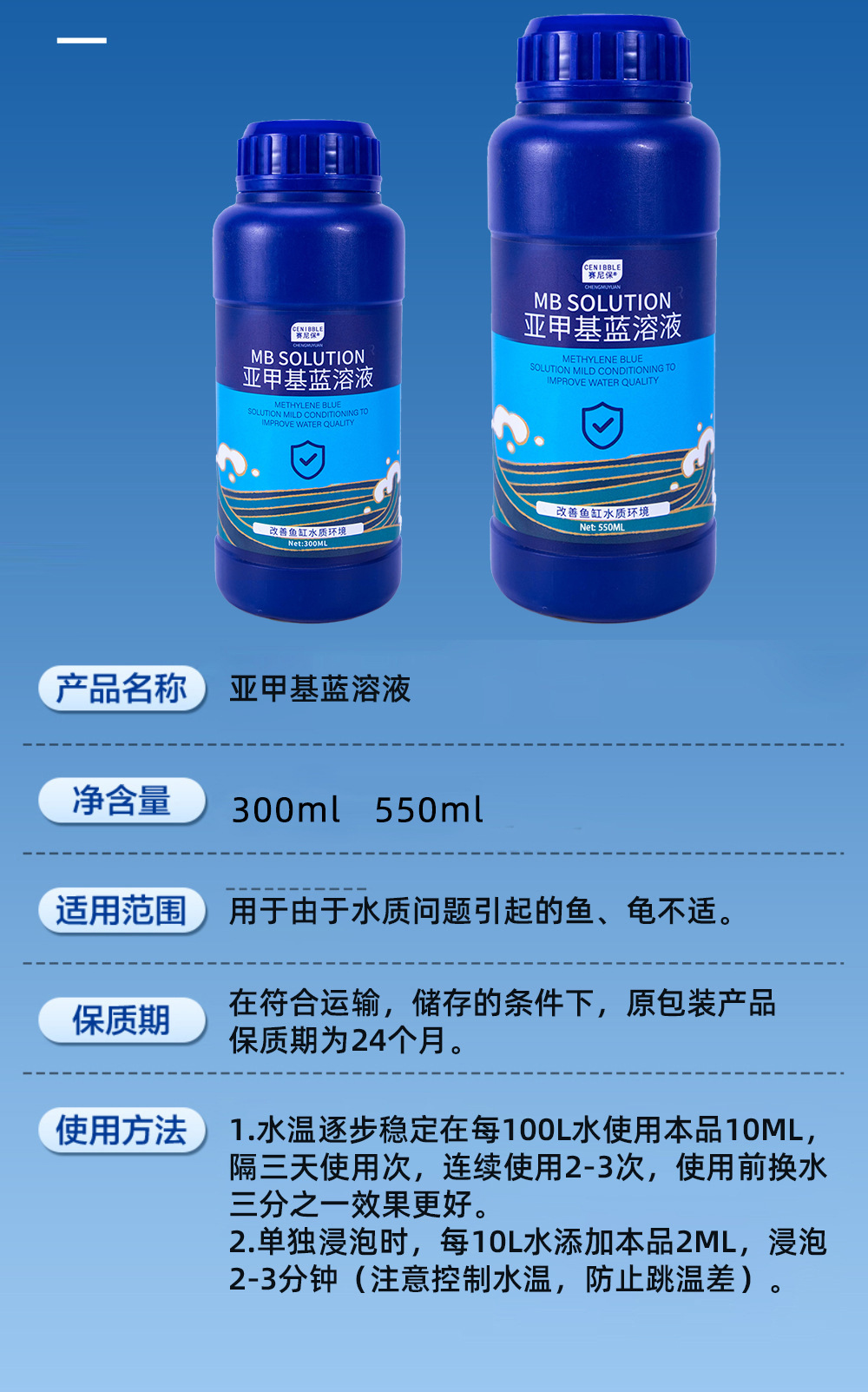 用途:硝化细菌水质稳定剂高锰酸钾生物净水剂亚甲基蓝溶液鱼缸除藻剂消毒杀菌溶液