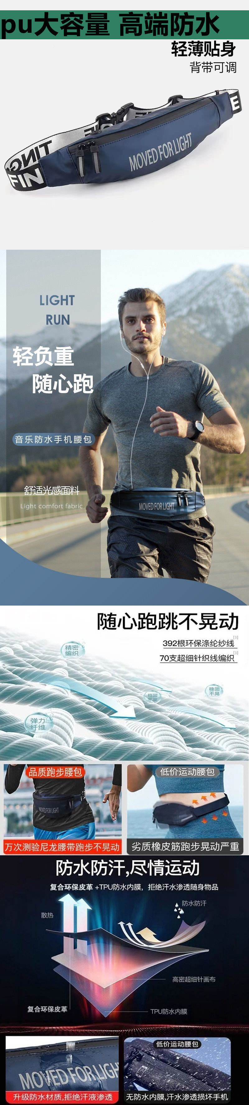 스포츠 허리 가방 남성과 여성의 패션 새로운 야외 달리기 작업 다기능 방수 PU 탄성 대용량 휴대 전화 가방
