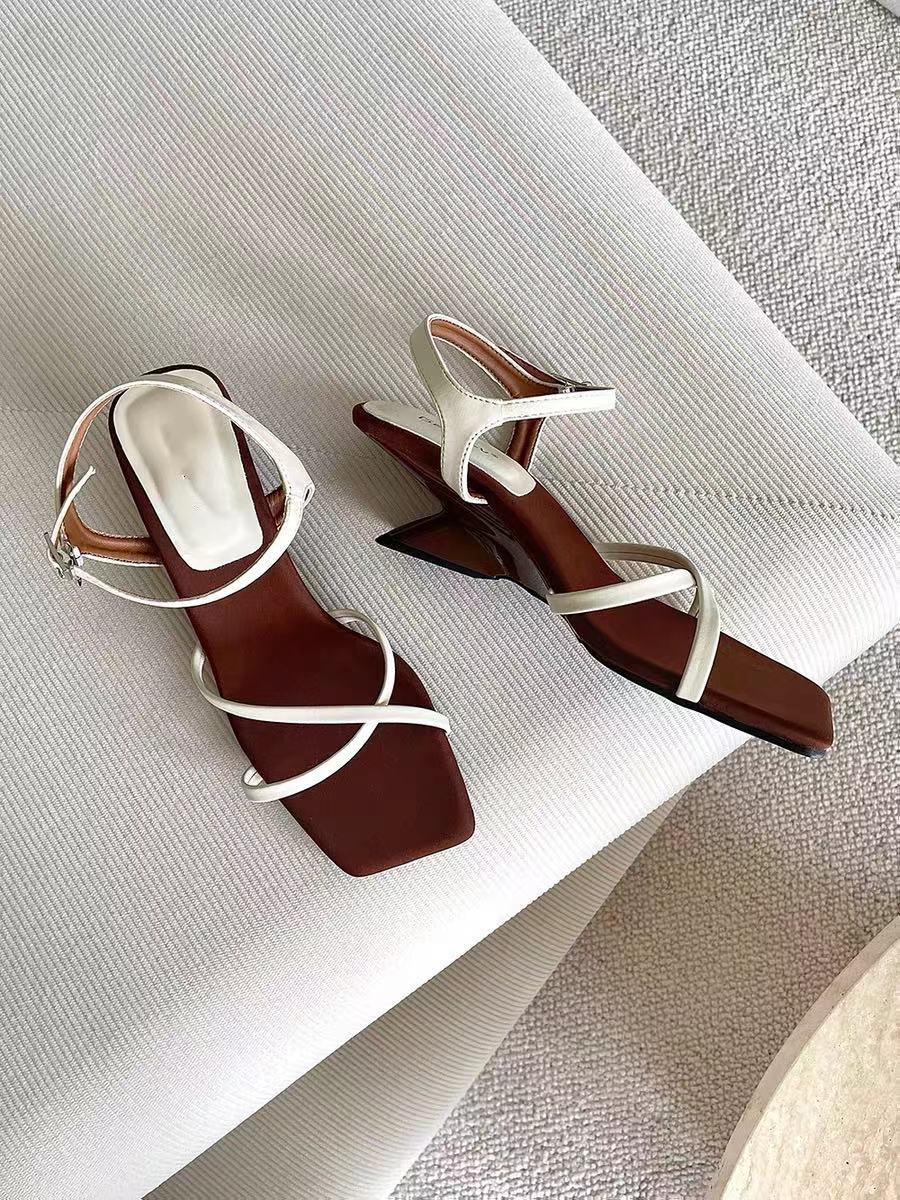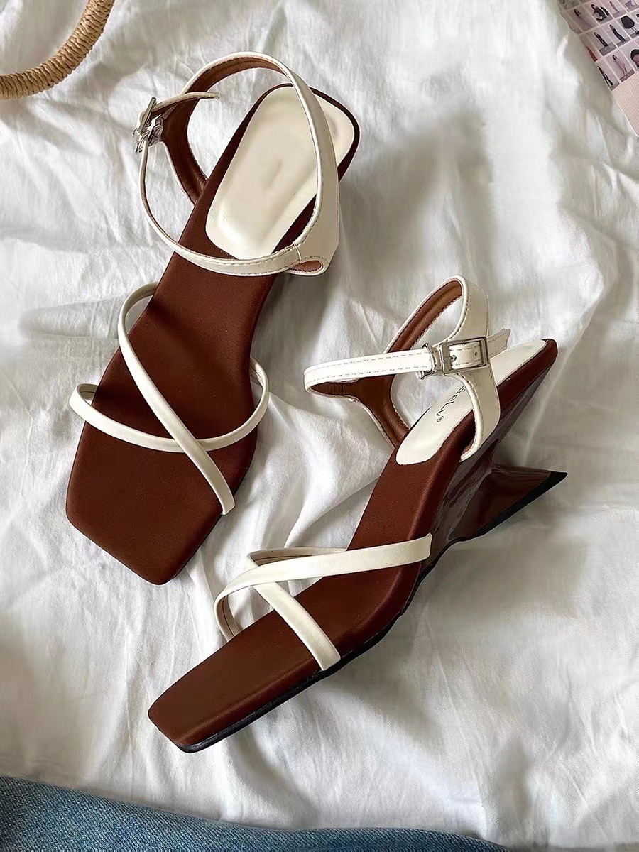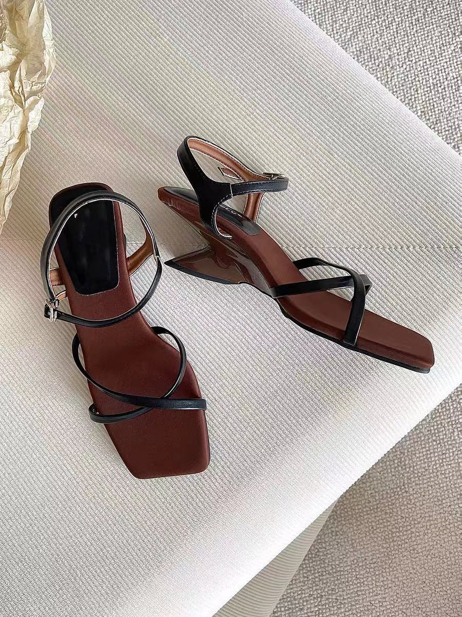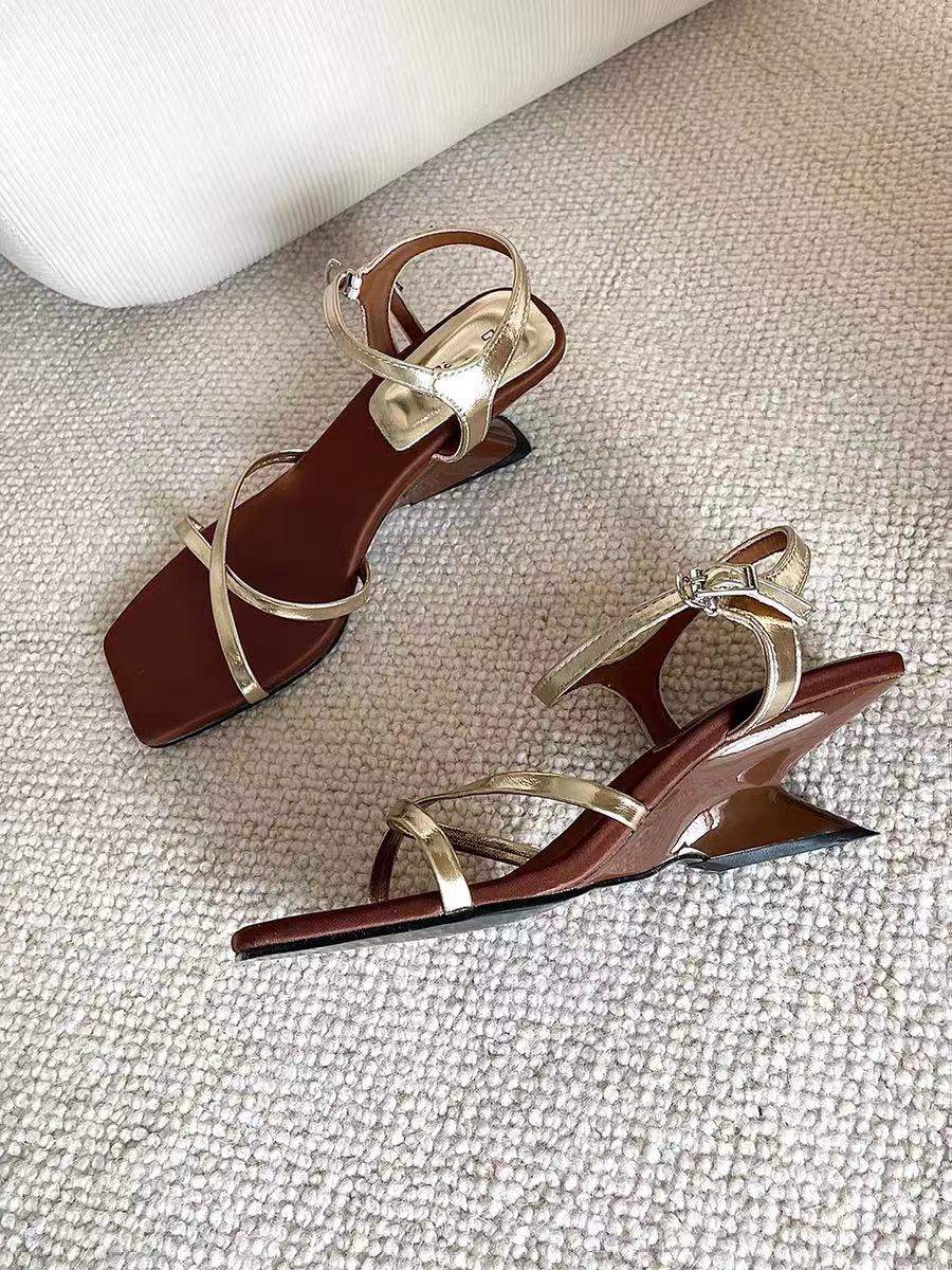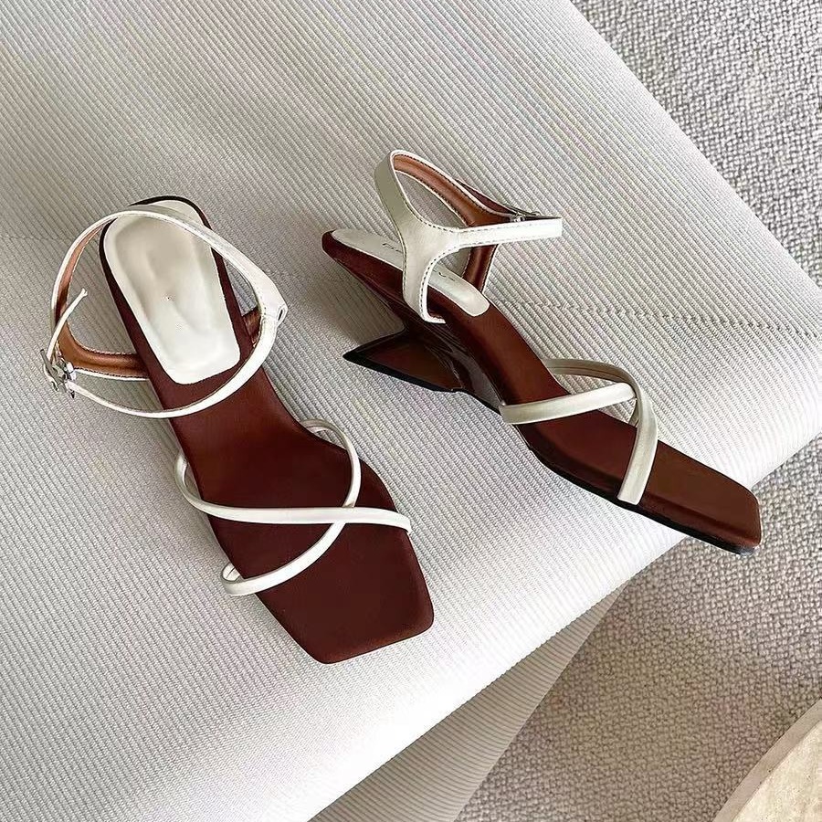 2026. 여름 여성을 위한 새로운 심플 샌들 5cm 특별한 모양의 웨지 샌들 버클 스트랩 휴가 스타일 로마 신발