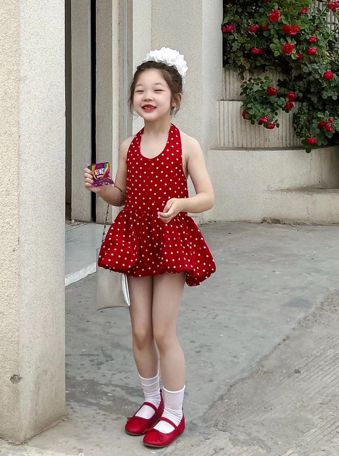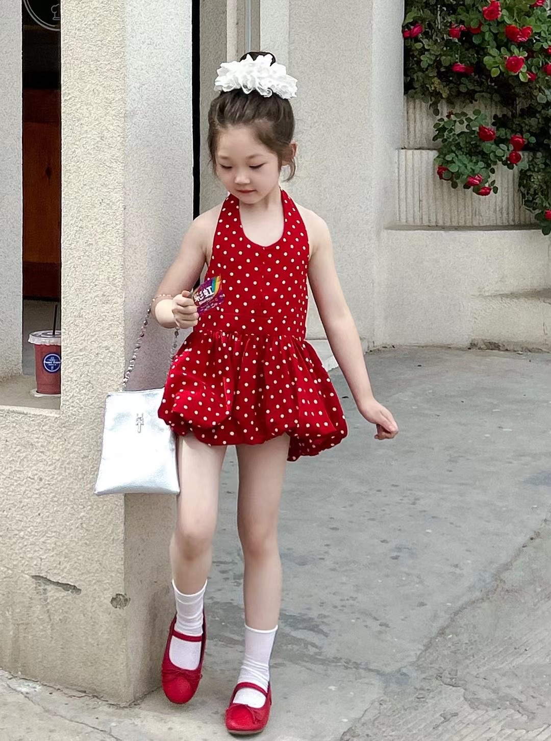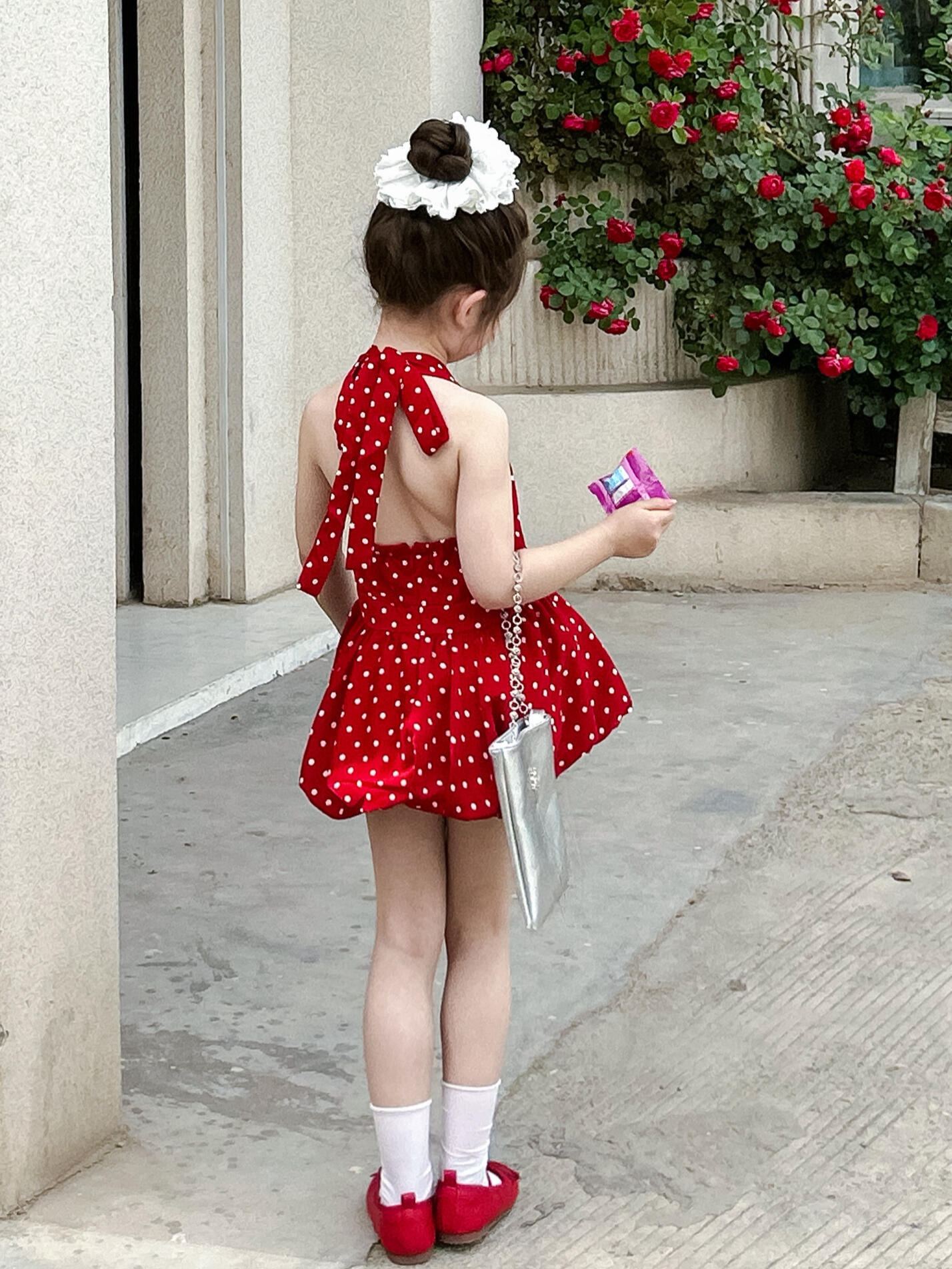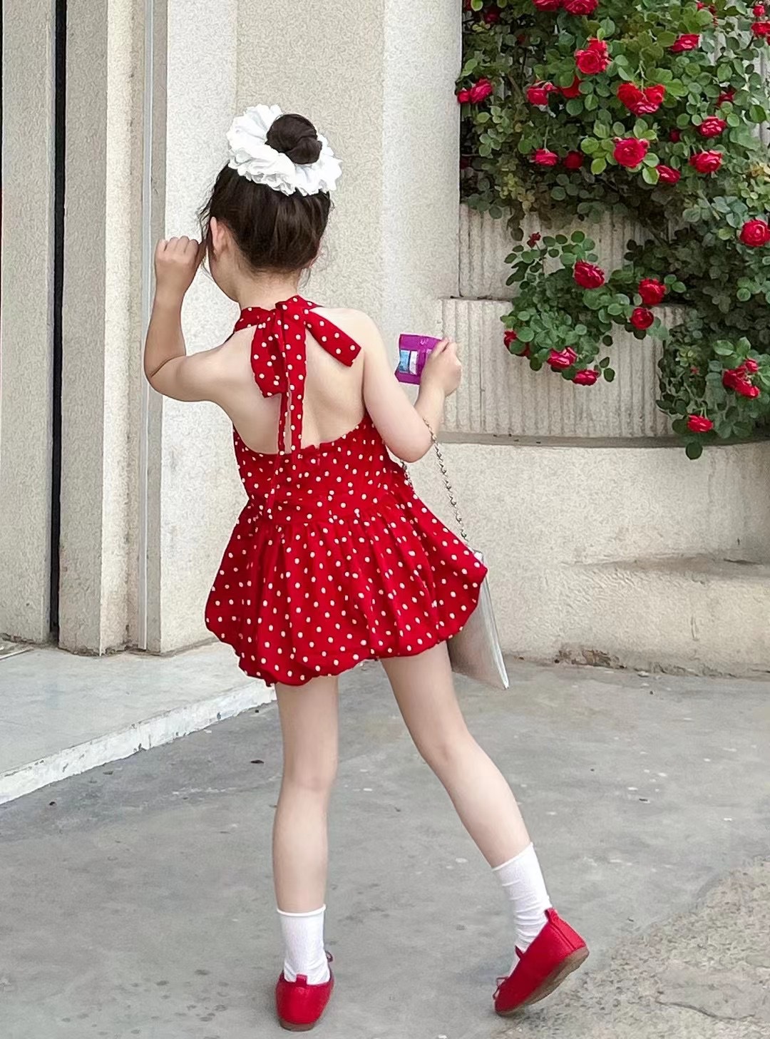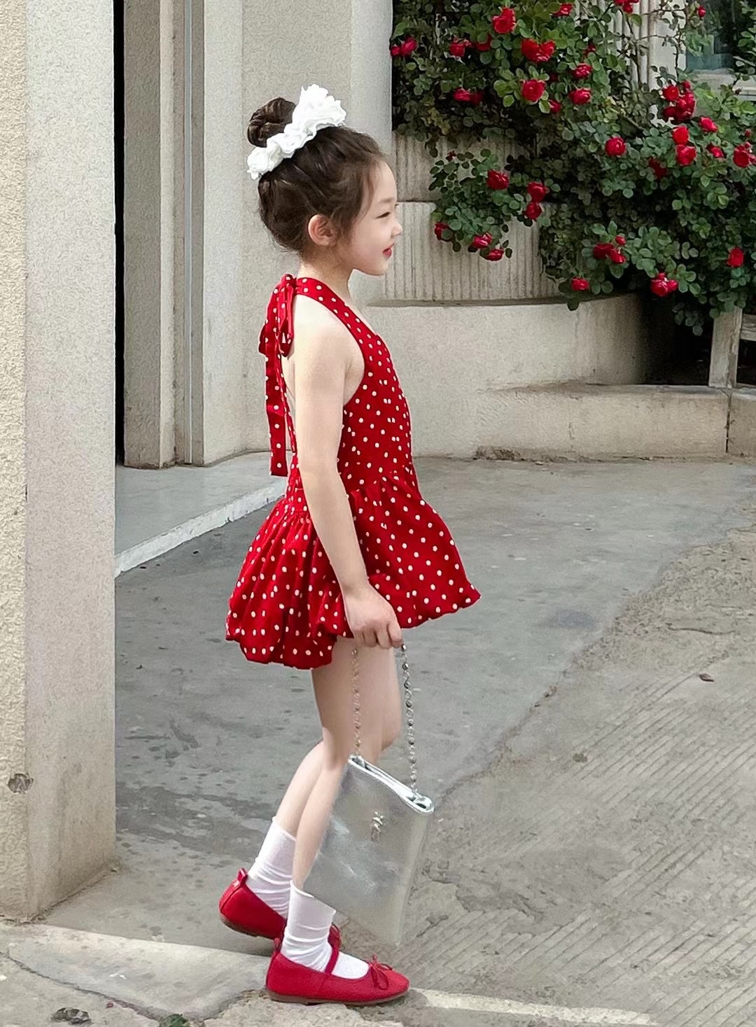여아용 꽃잎 프릴 물방울 무늬 민소매 원피스, 핫걸 스타일의 세련된 드레스, 민소매 홀터넥 원피스스토어 가기