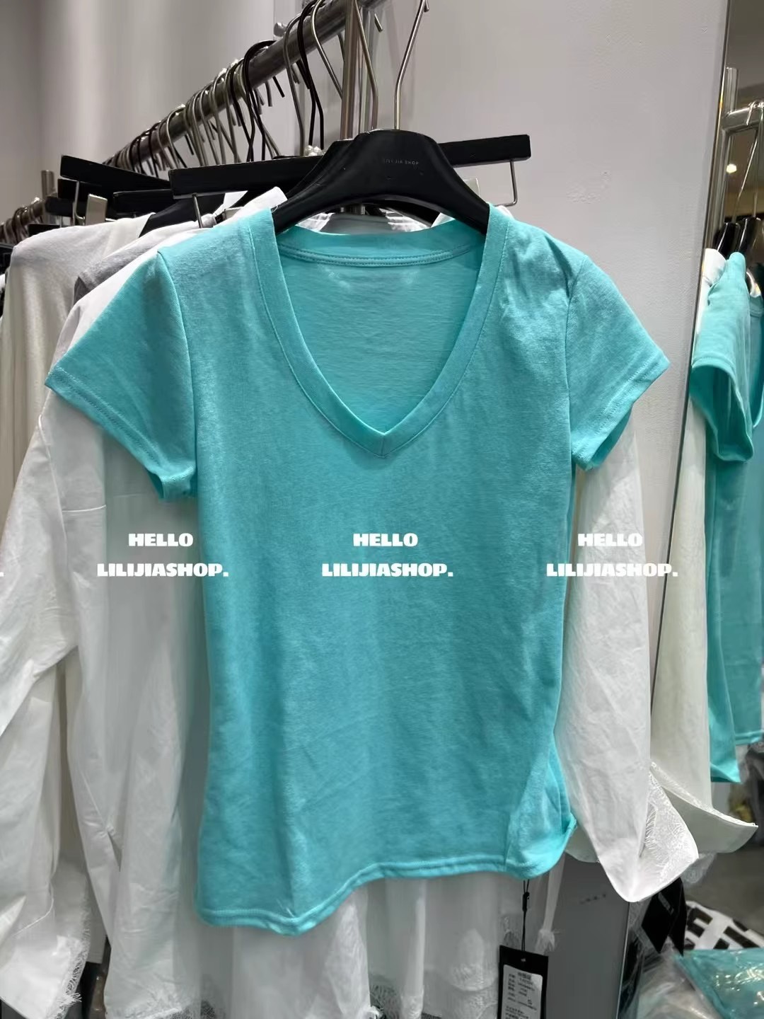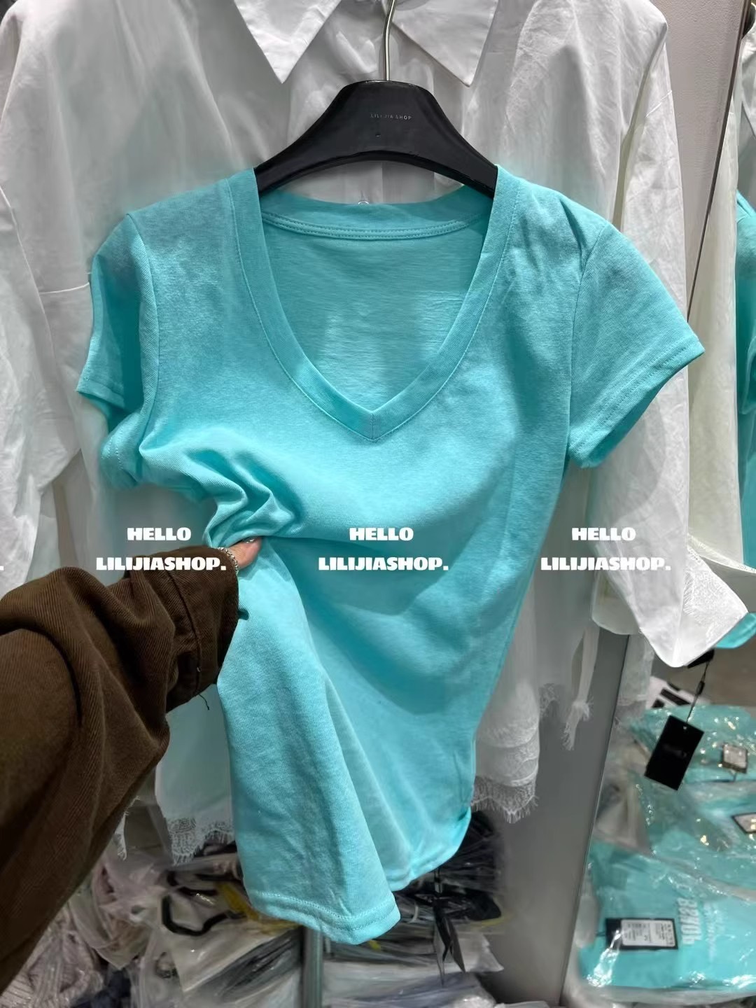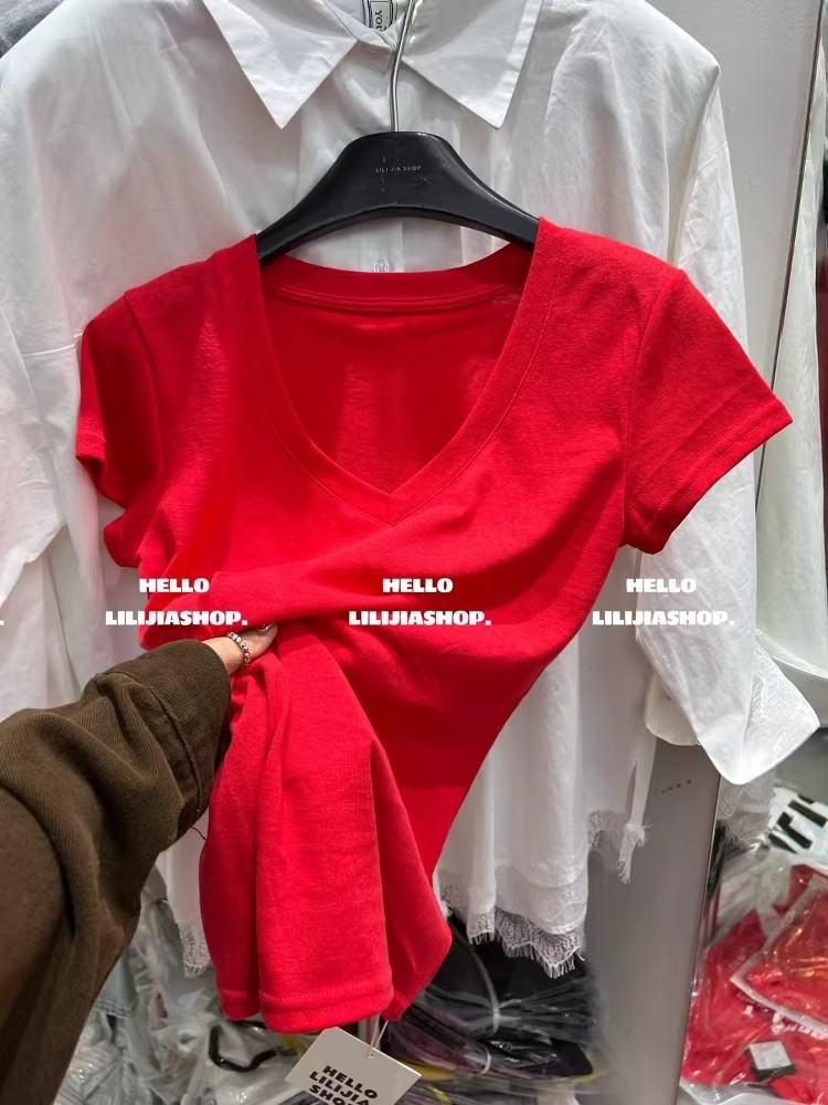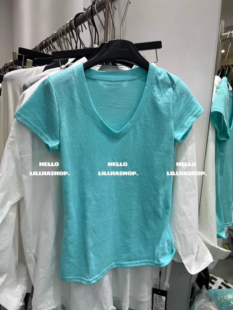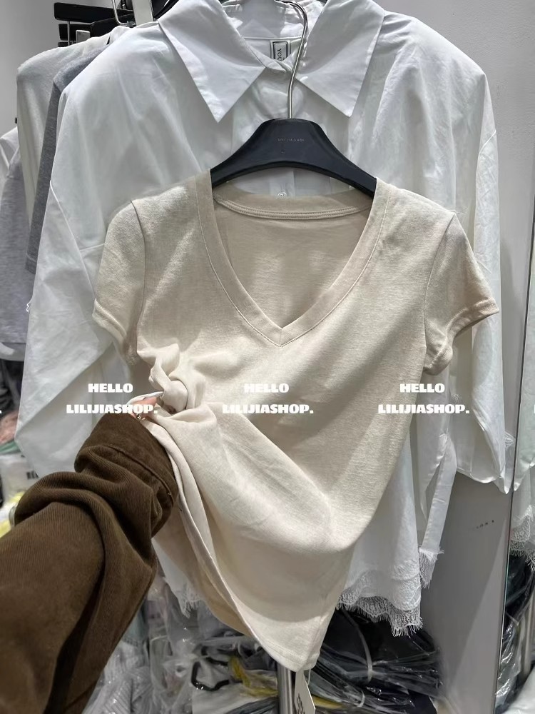 한국 동대문 여름 새로운 한국 스타일 패션 디자인 센스 V 넥 올매치 슬리밍 어깨 반팔 티셔츠 여성용 탑스토어 가기