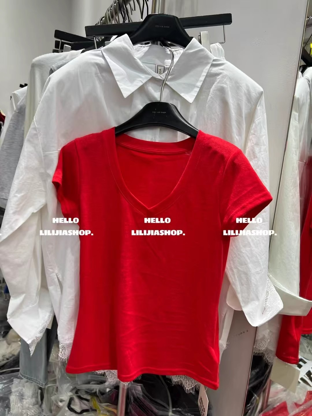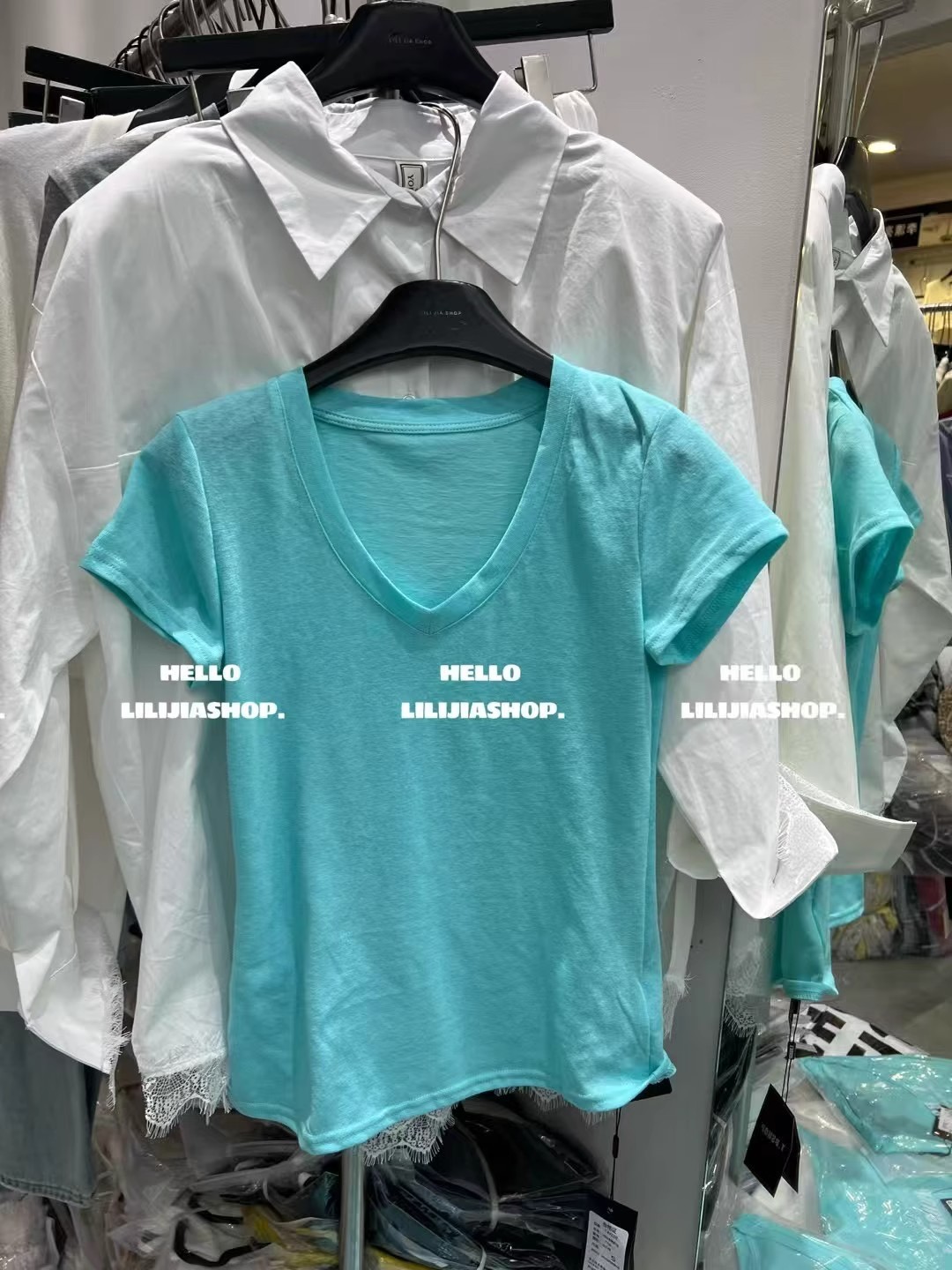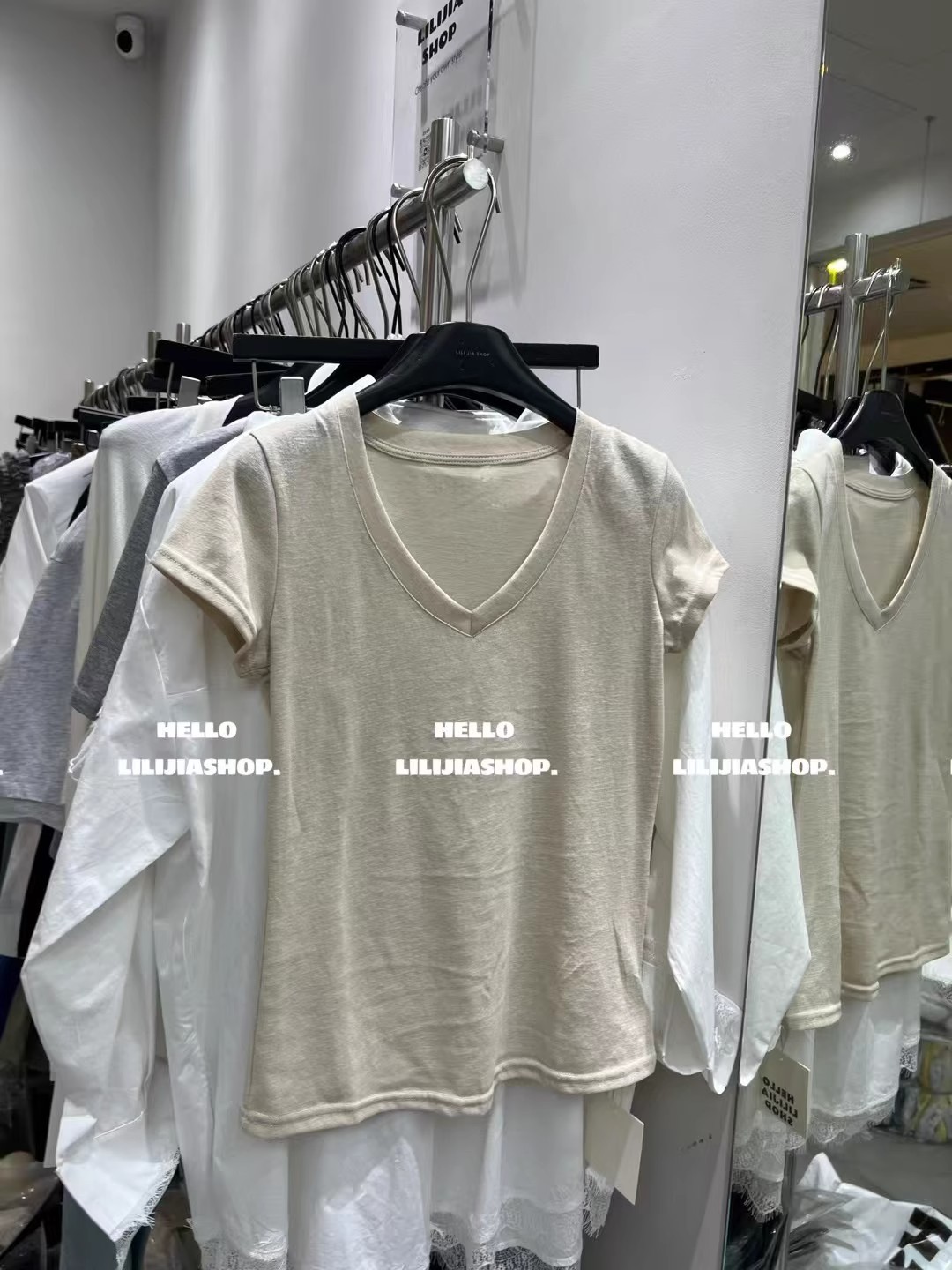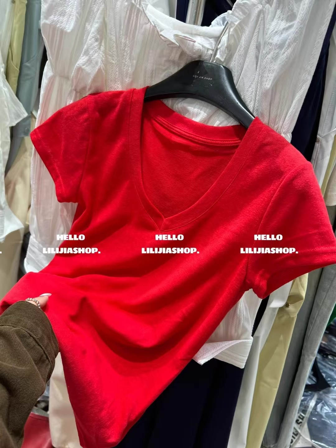 한국 동대문 여름 새로운 한국 스타일 패션 디자인 센스 V 넥 올매치 슬리밍 어깨 반팔 티셔츠 여성용 탑스토어 가기