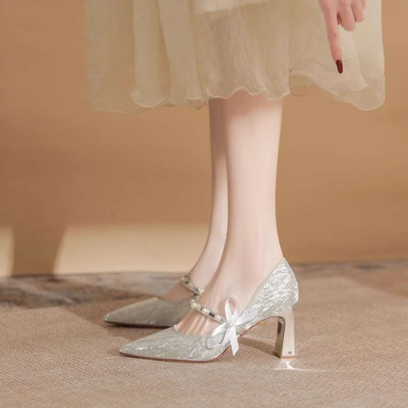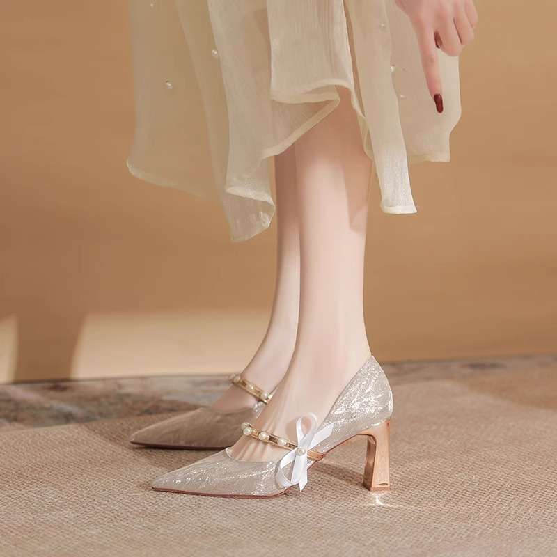 피곤하지 않은 발 청키 힐 하이힐 메인 웨딩 원피스 웨딩 신발 여성 Xiuhe 프랑스 스파클링 크리스탈 들러리 신부 신발 투복 봄