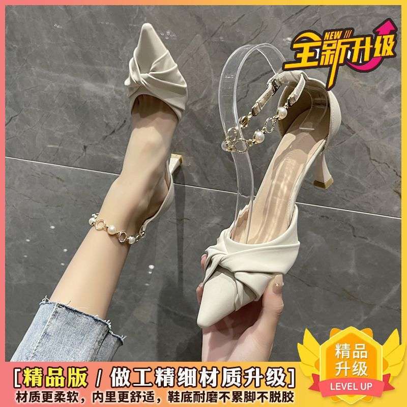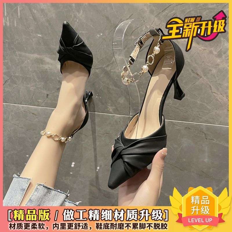 블랙 하이힐 슈즈 여성의 18 세 라이트 디자인 센스 니쉬 포인티드 펄 싱글 레이어 슈즈와 얇은 힐 홀 슈즈스토어 가기