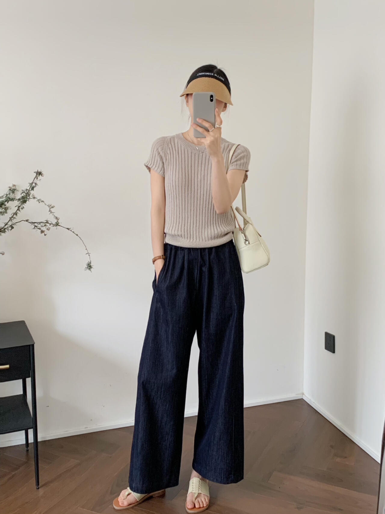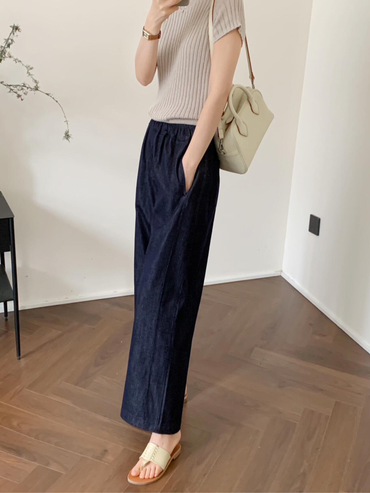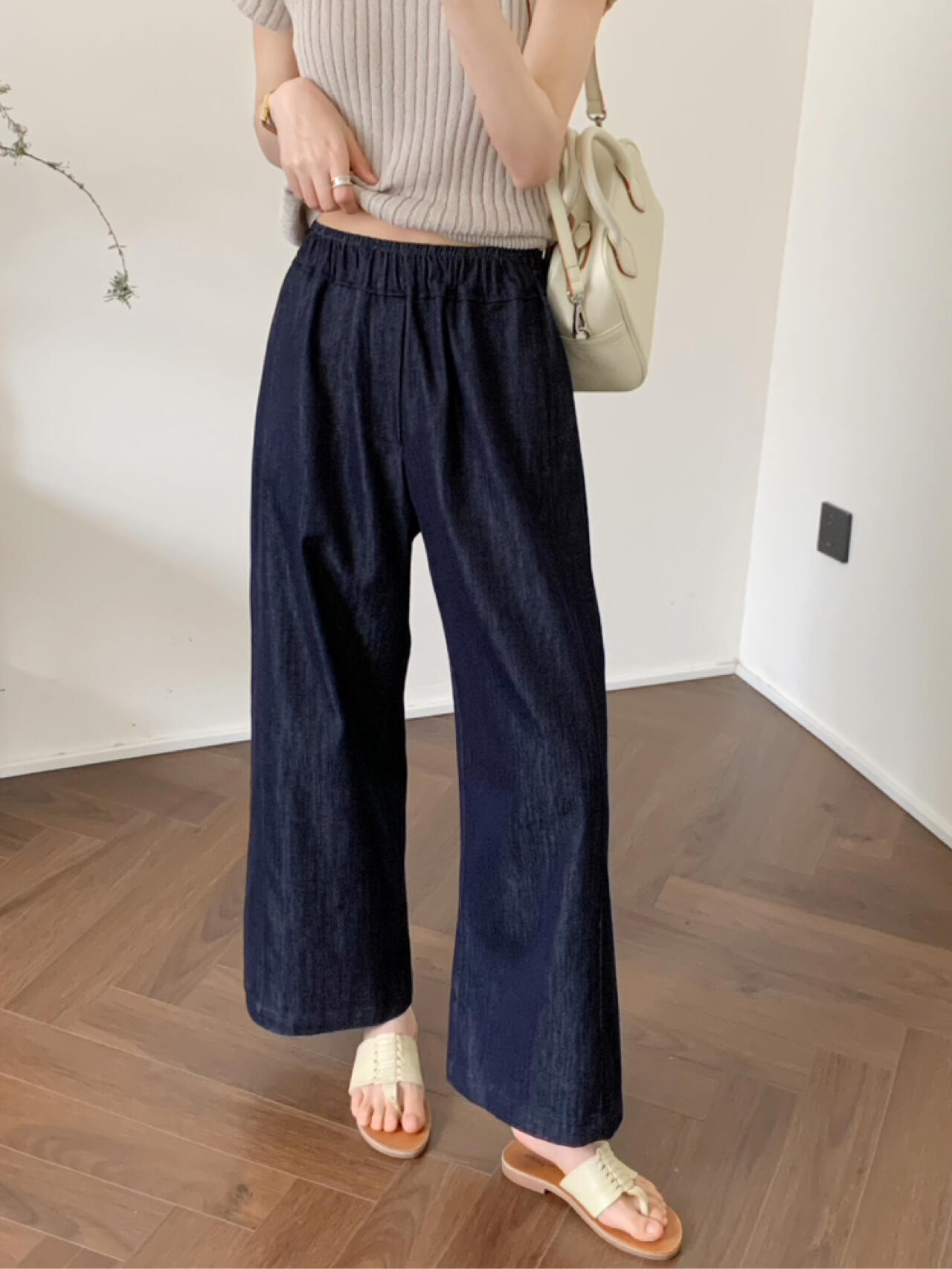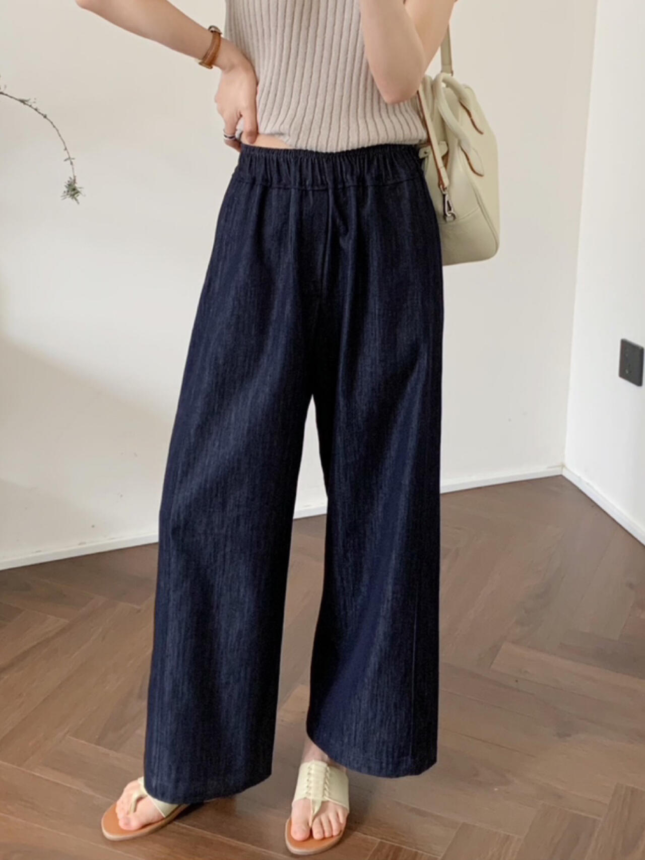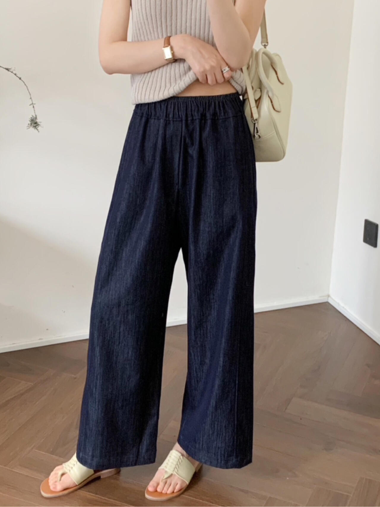 2025 여름 새로운 다크 블루 얇은 느슨한 부드러운 텐셀 청바지 탄성 허리 디자인 감각 스트레이트 캐주얼 바지스토어 가기