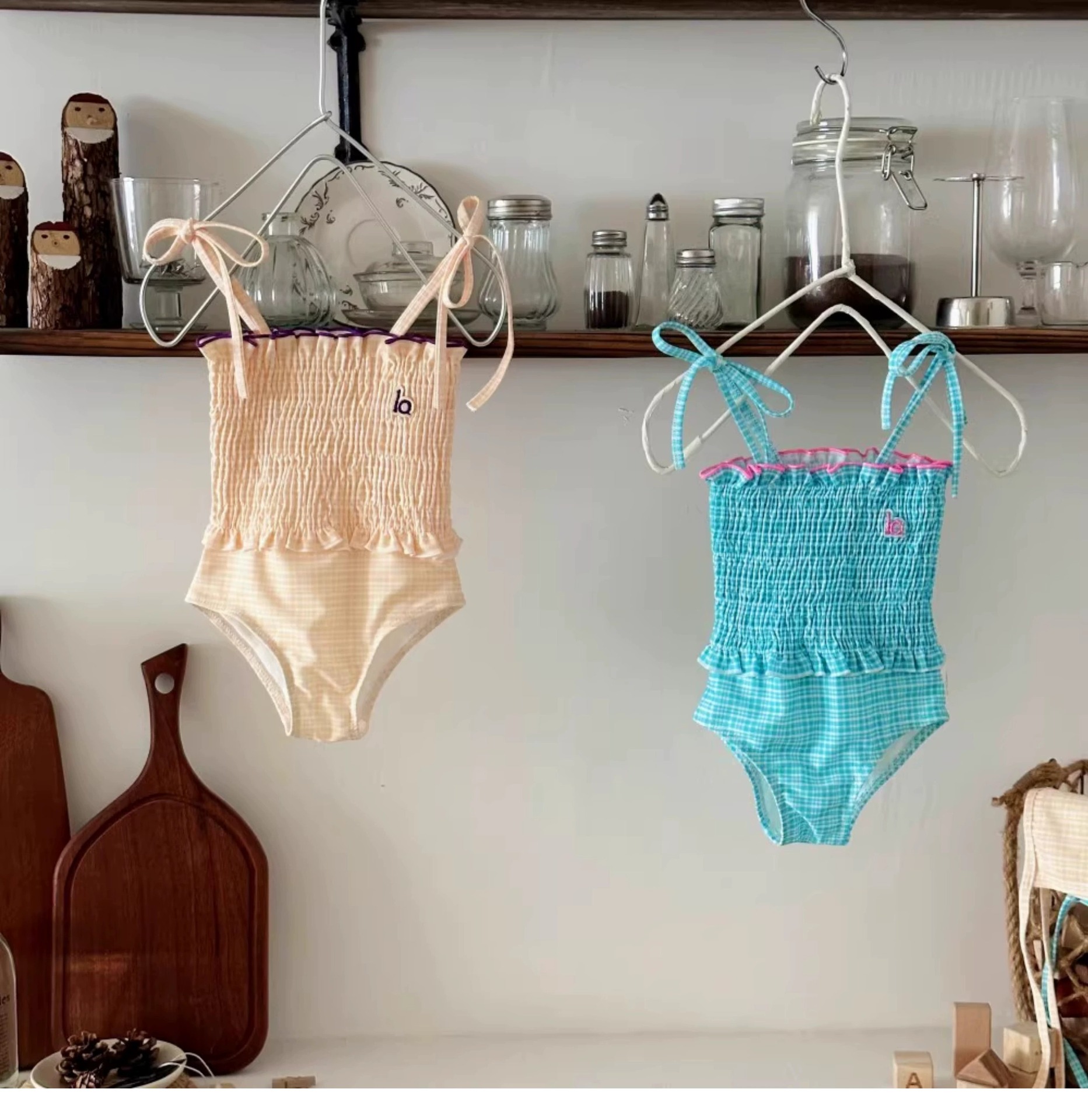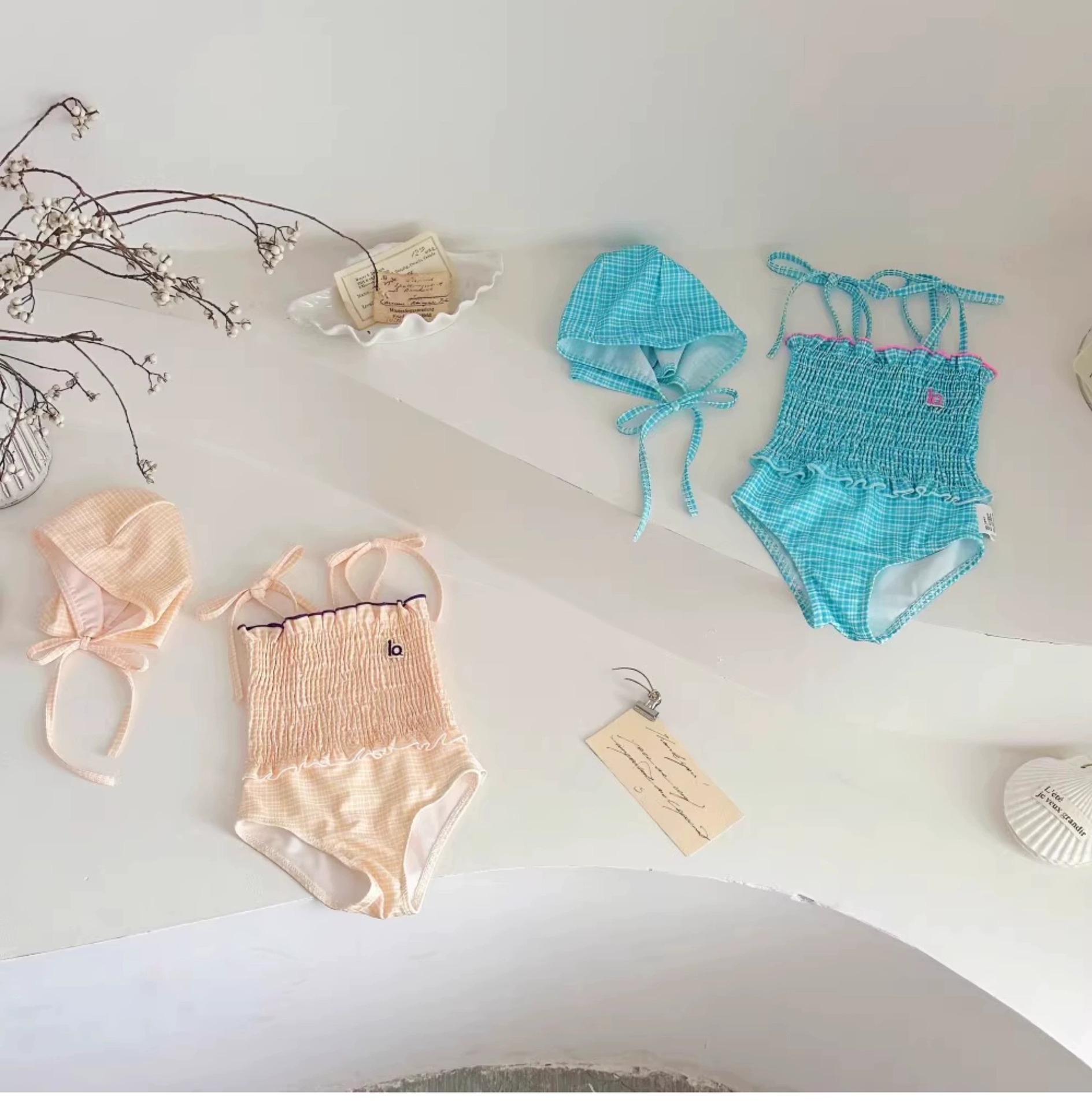Ins 소녀 수영복 원피스 서스펜더 어린이 수영복 아기 작은 공주 귀여운 격자 무늬 휴가 수영복