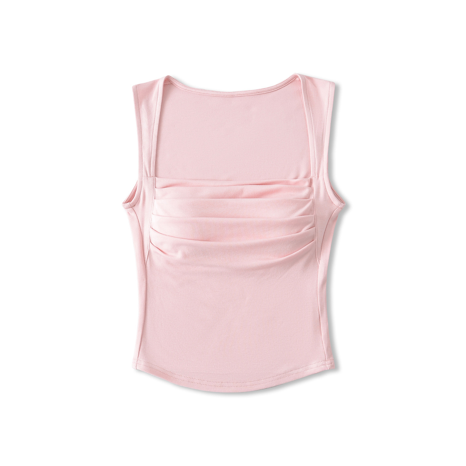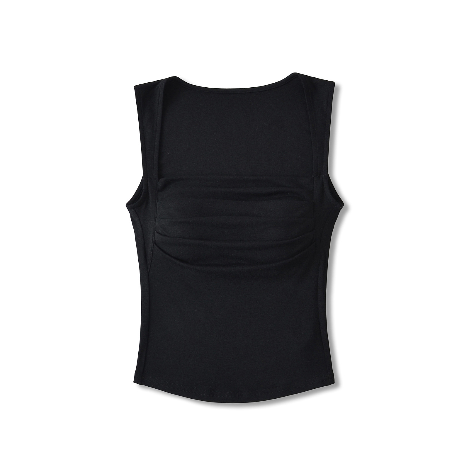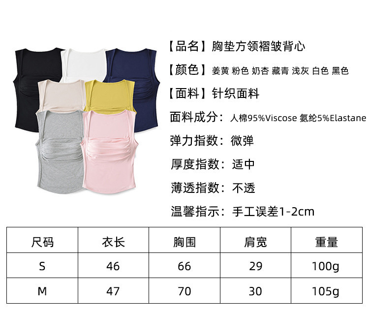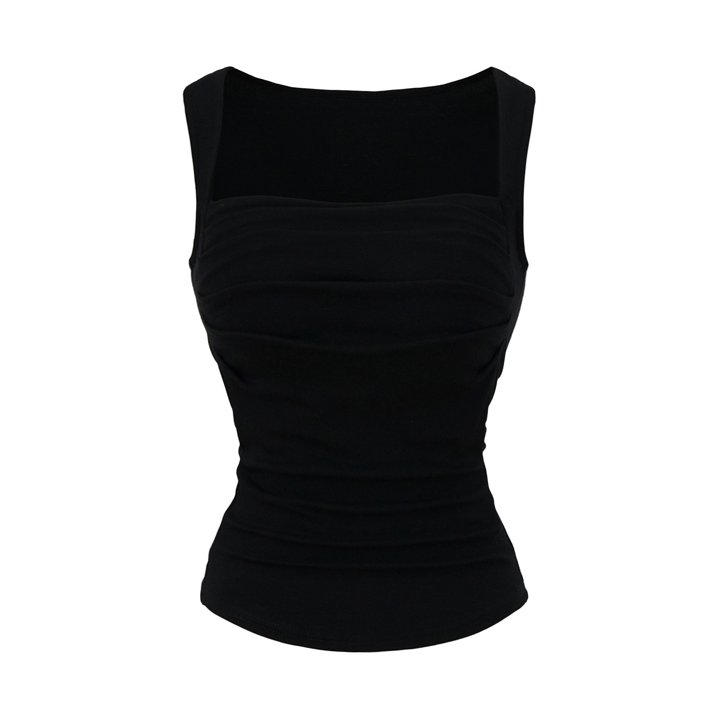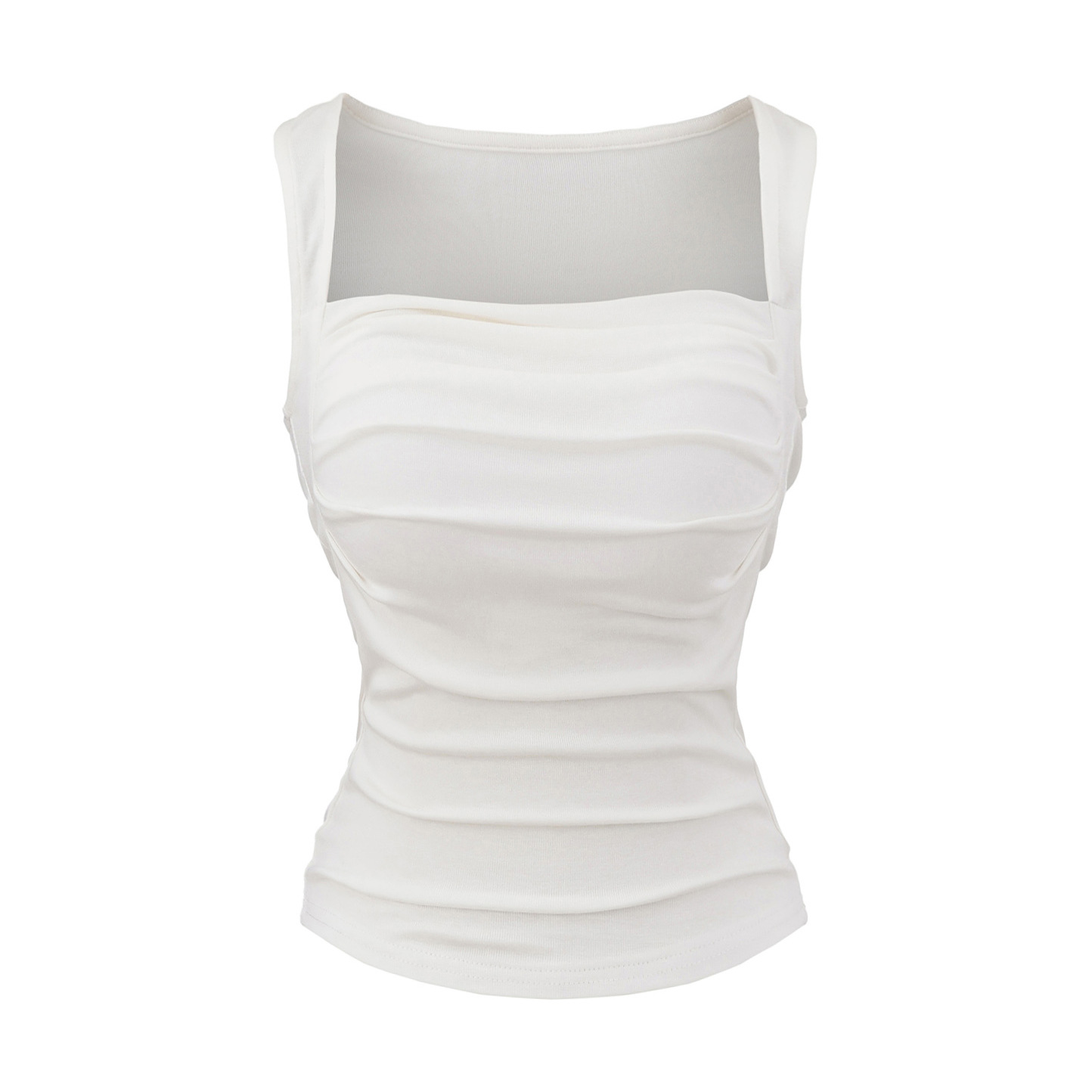 여자 2025 년 여름 스트레치 슬림 핏 플리츠 짧은 민소매 탑, 가슴 패드 스퀘어 칼라 카미 솔 조끼