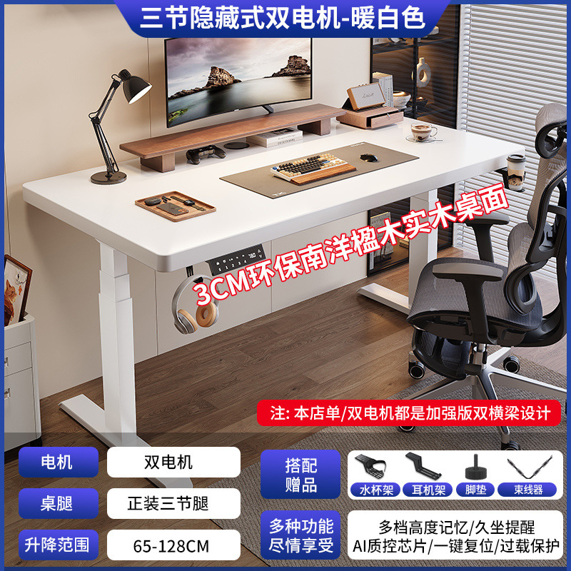 • 3CM 원목 데스크탑 [숨겨진 듀얼 모터 3개 섹션] 크림 화이트