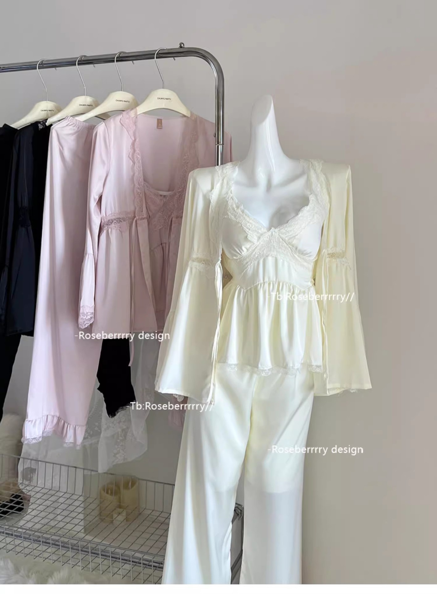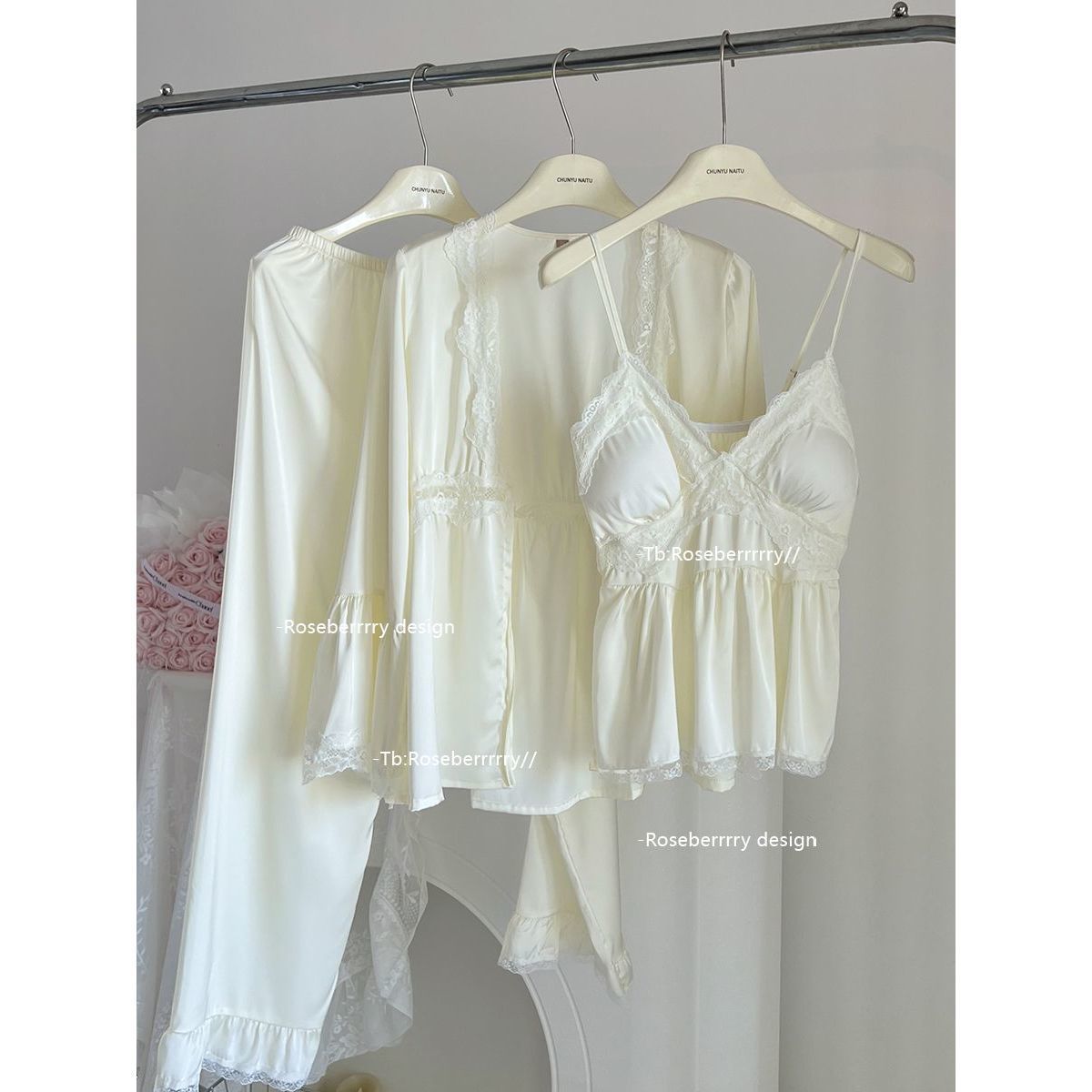 여성을위한 프랑스 슬링 잠옷 봄, 가을 얼음 실크 긴팔 3 피스 양복 여름 달콤한 v 넥타이 가슴 패드 홈웨어