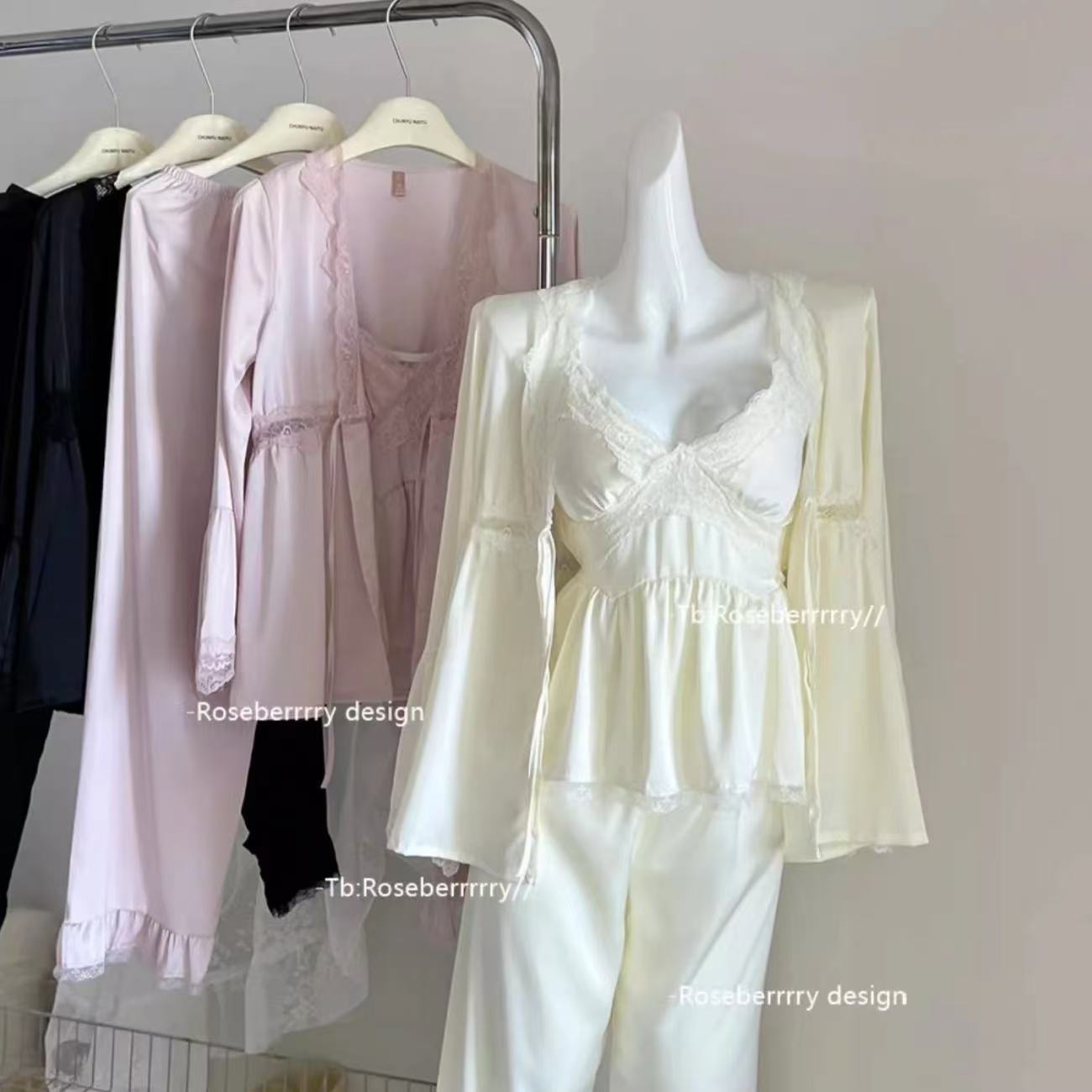 여성을위한 프랑스 슬링 잠옷 봄, 가을 얼음 실크 긴팔 3 피스 양복 여름 달콤한 v 넥타이 가슴 패드 홈웨어스토어 가기