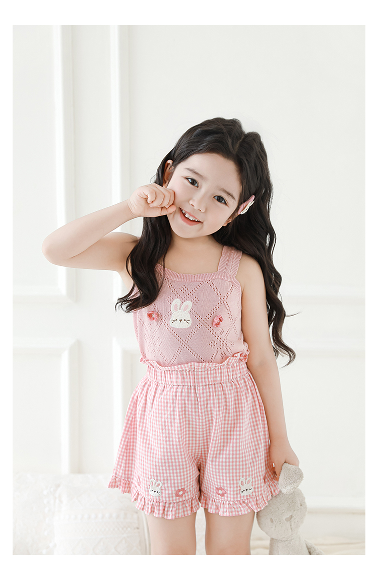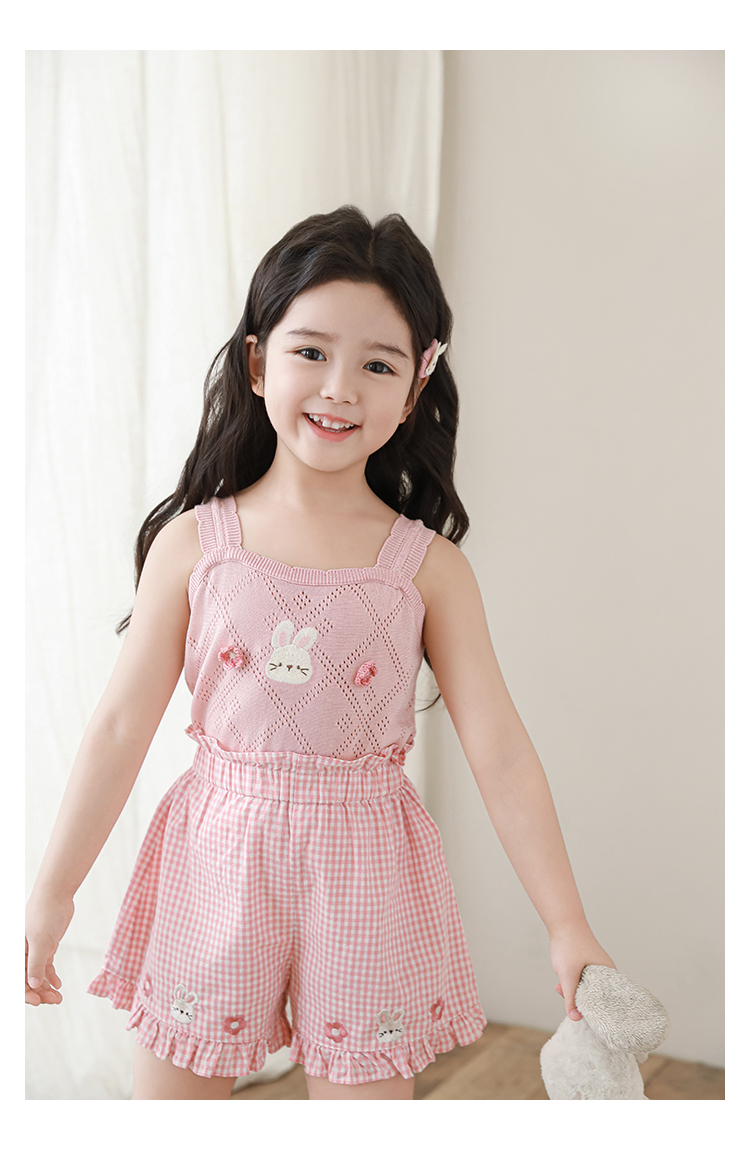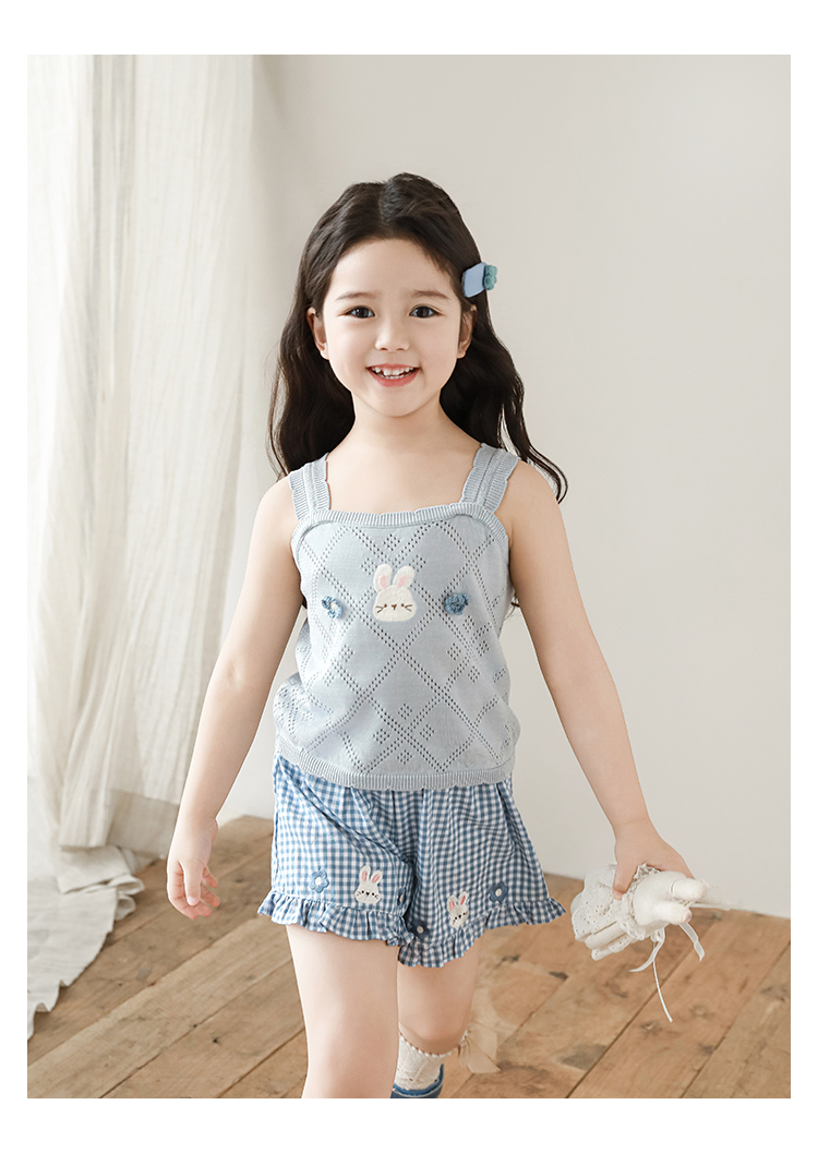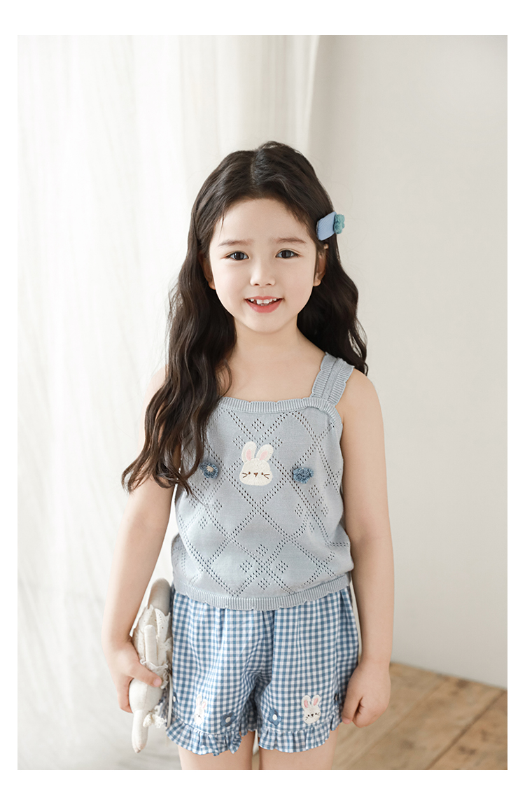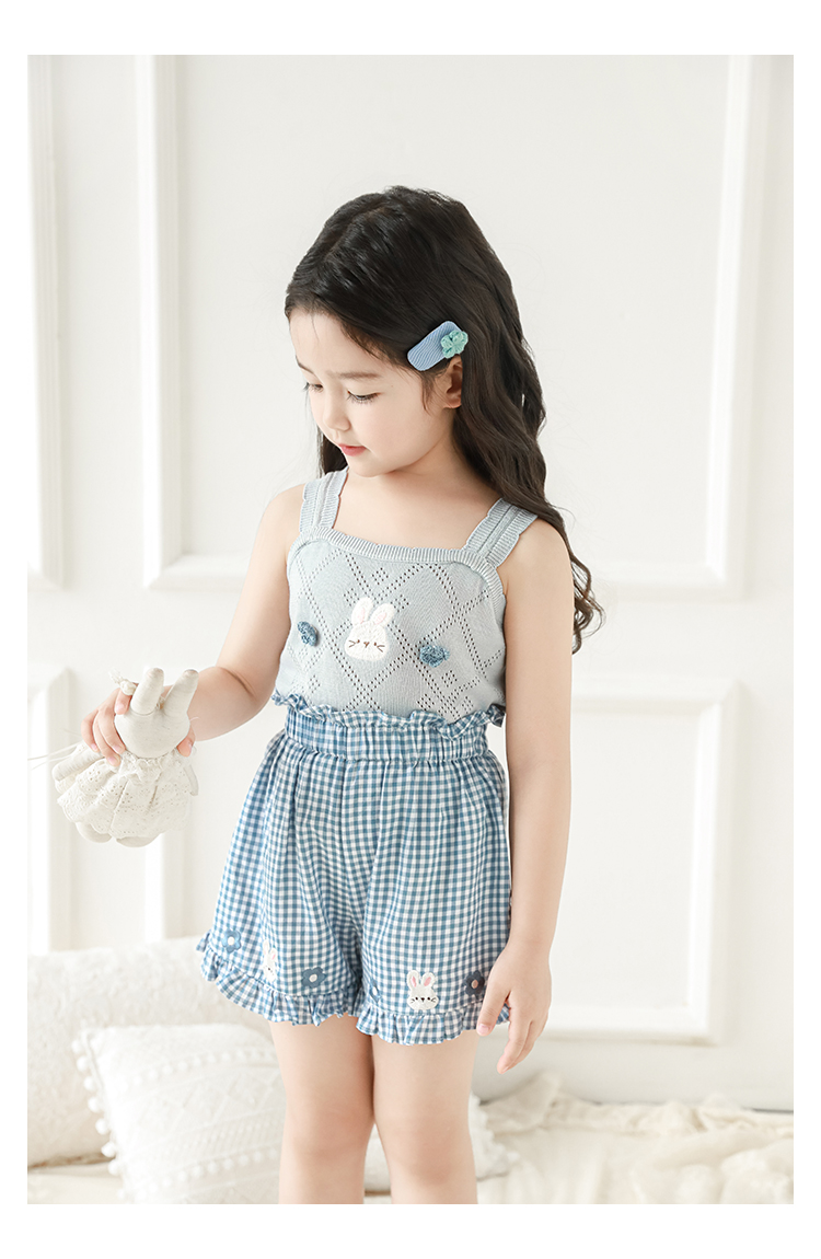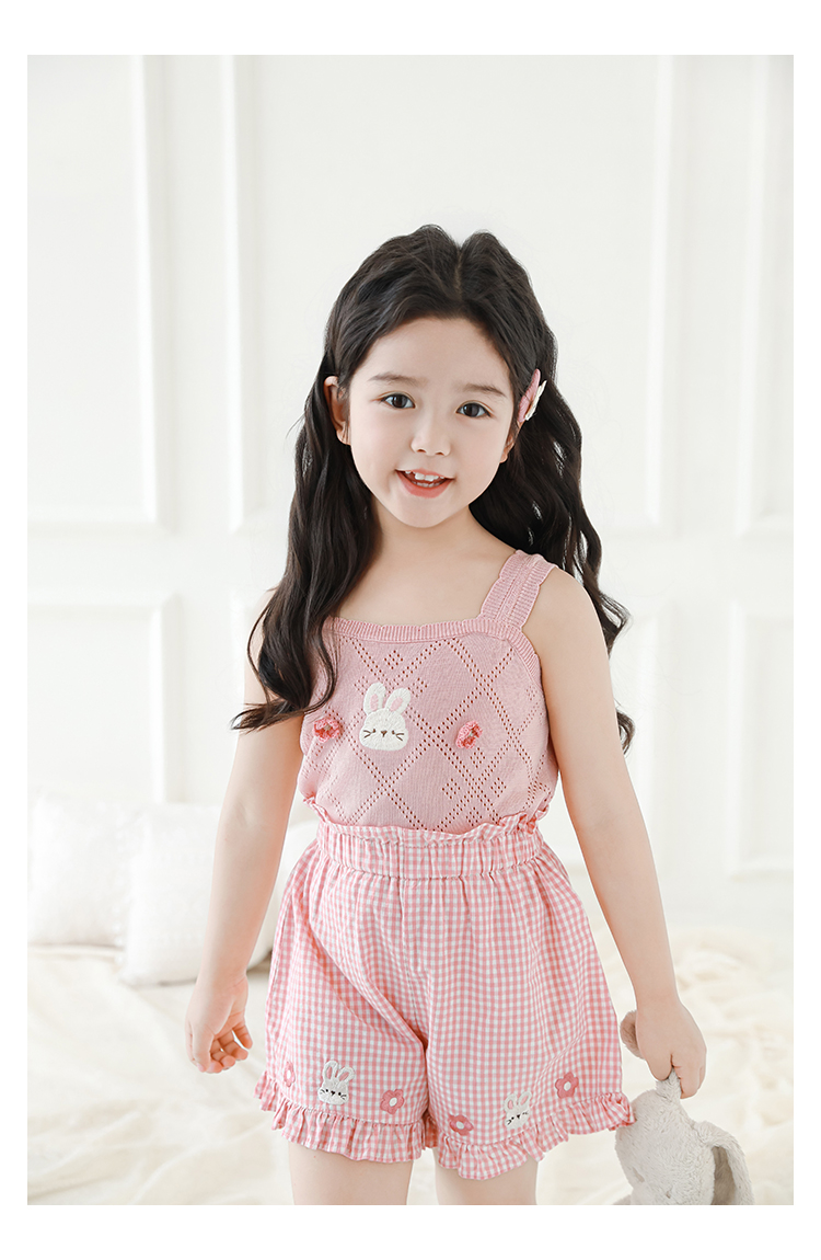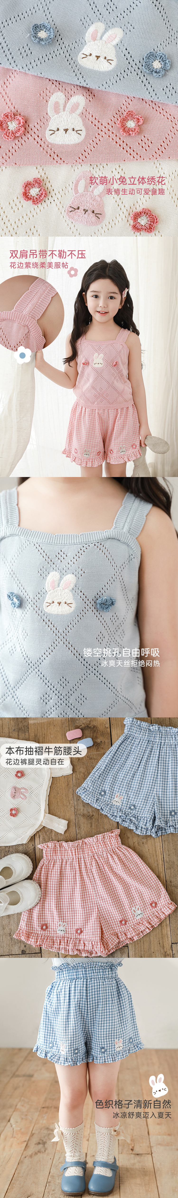우리의 소녀는 여름에 시원하고 세트. 귀엽고 귀여운 토끼 수놓은 텐셀 마름모 어깨 서스펜더 반바지스토어 가기