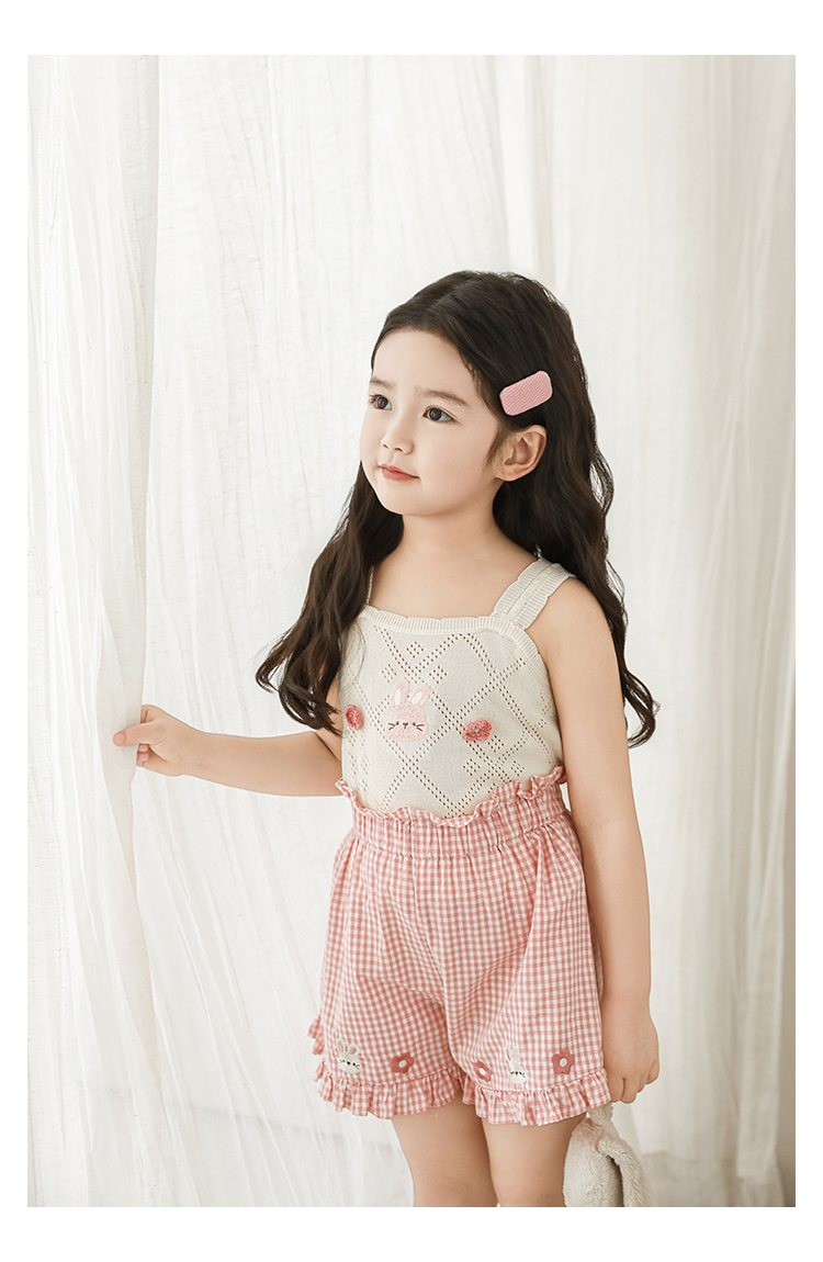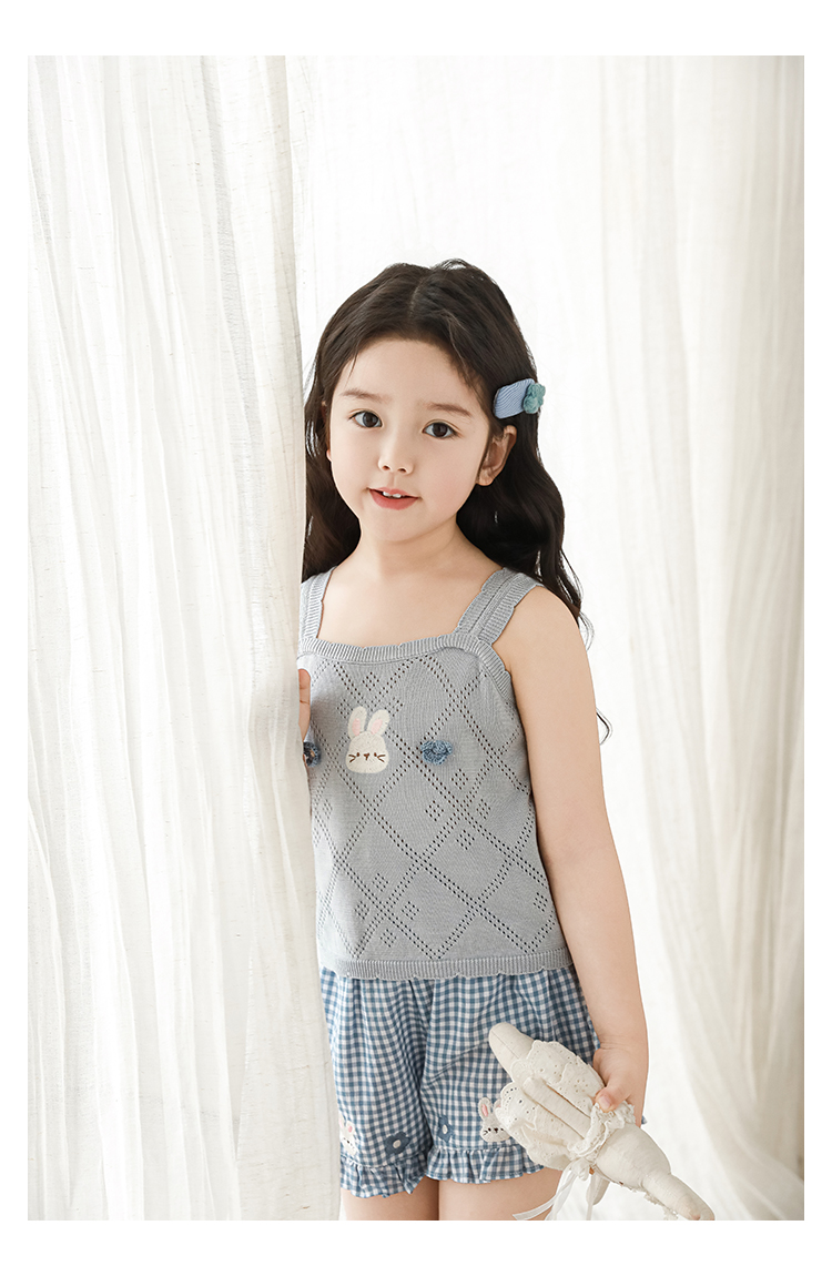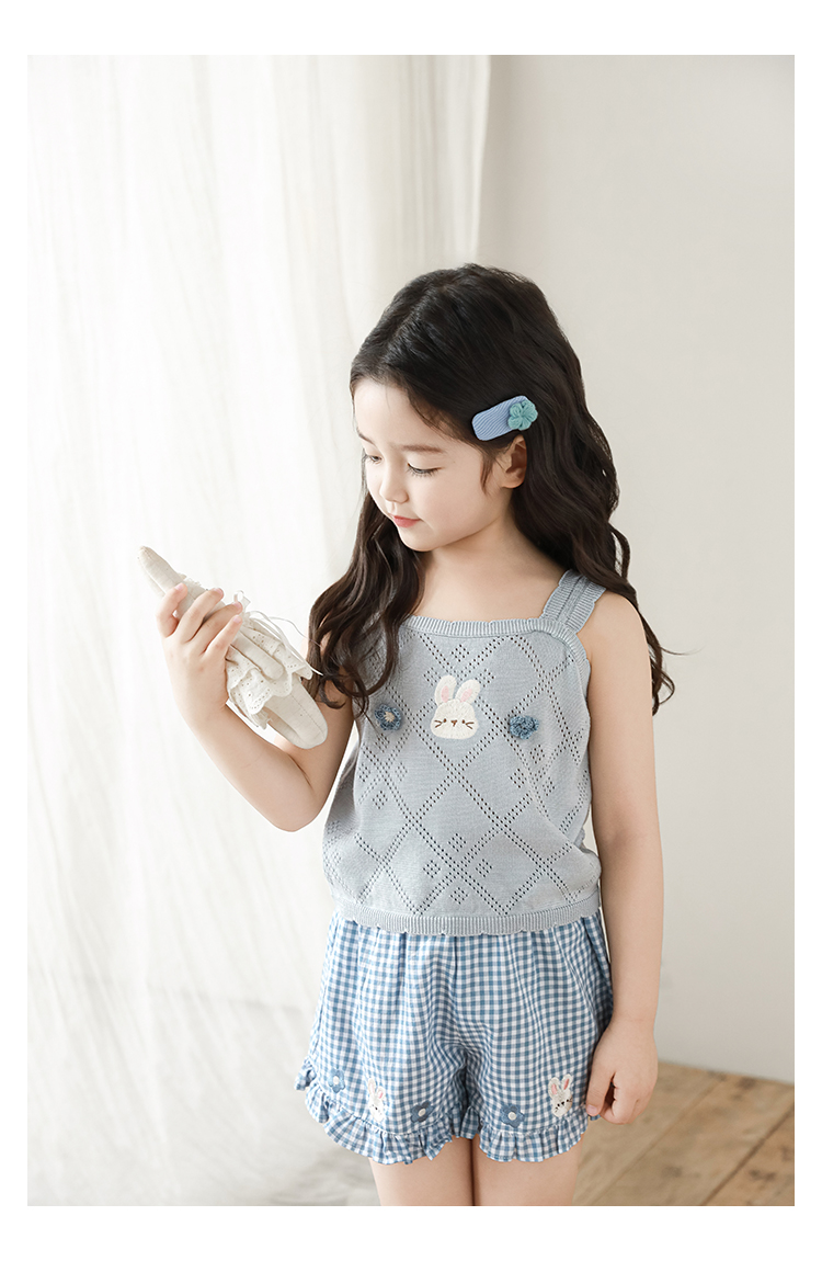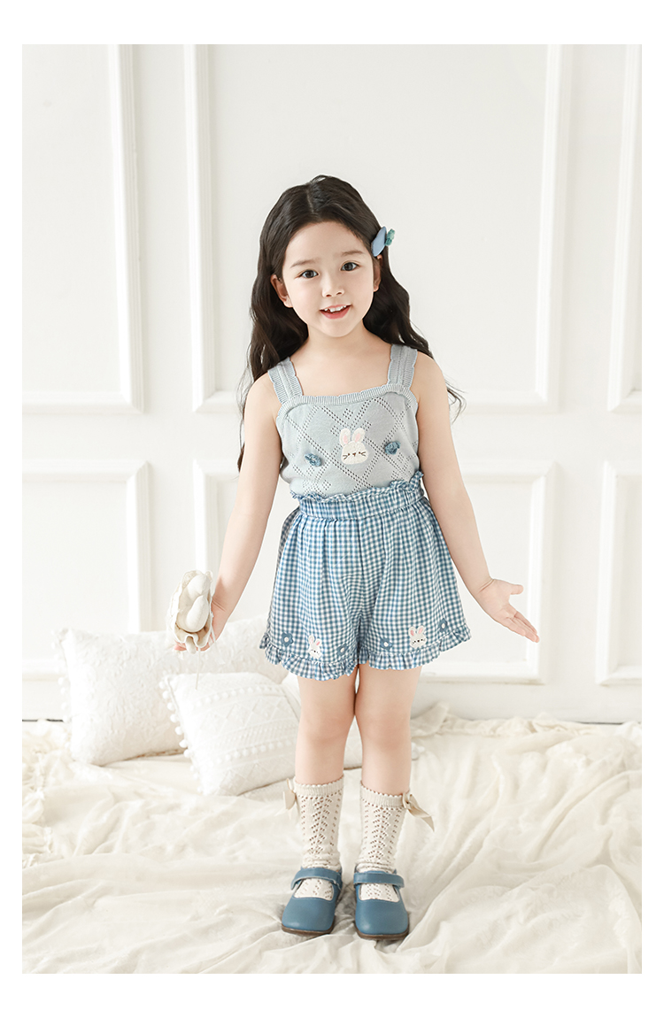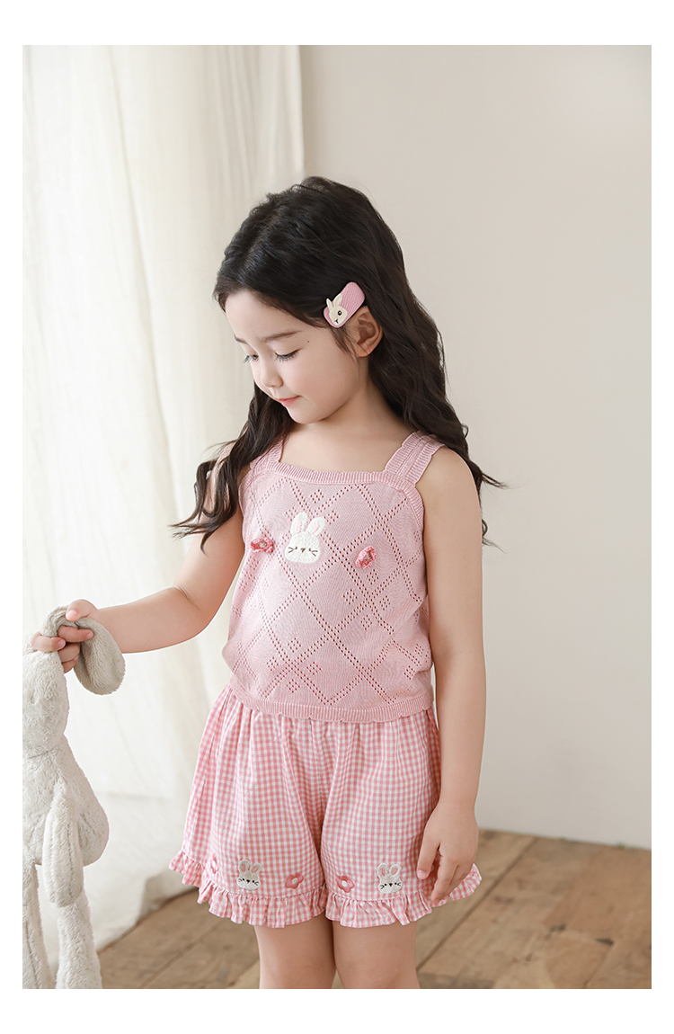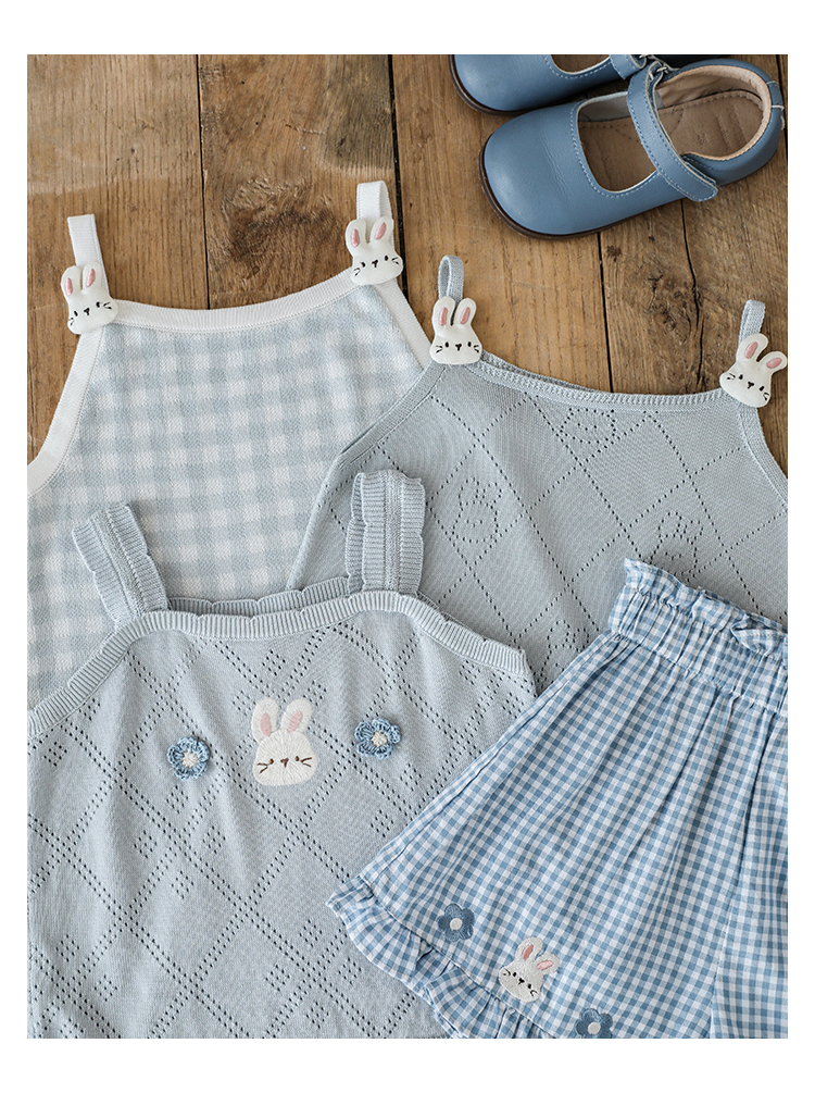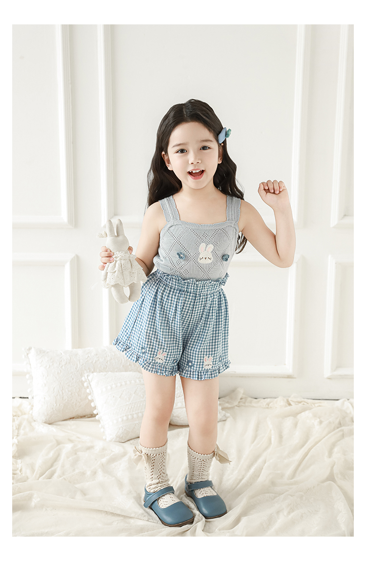 우리의 소녀는 여름에 시원하고 세트. 귀엽고 귀여운 토끼 수놓은 텐셀 마름모 어깨 서스펜더 반바지스토어 가기
