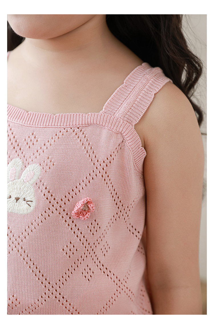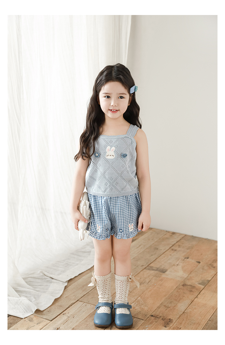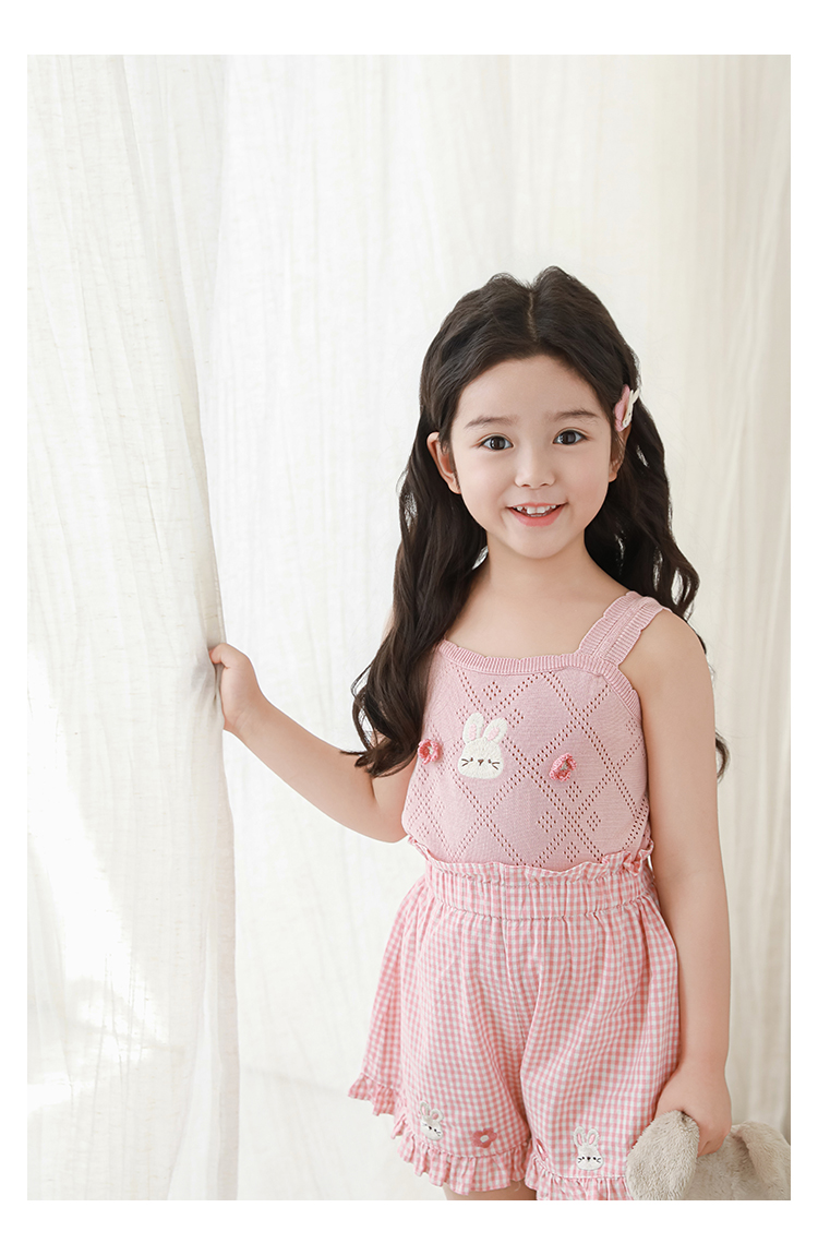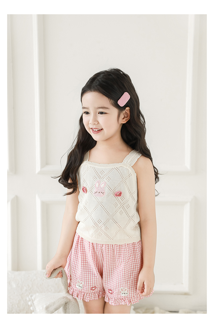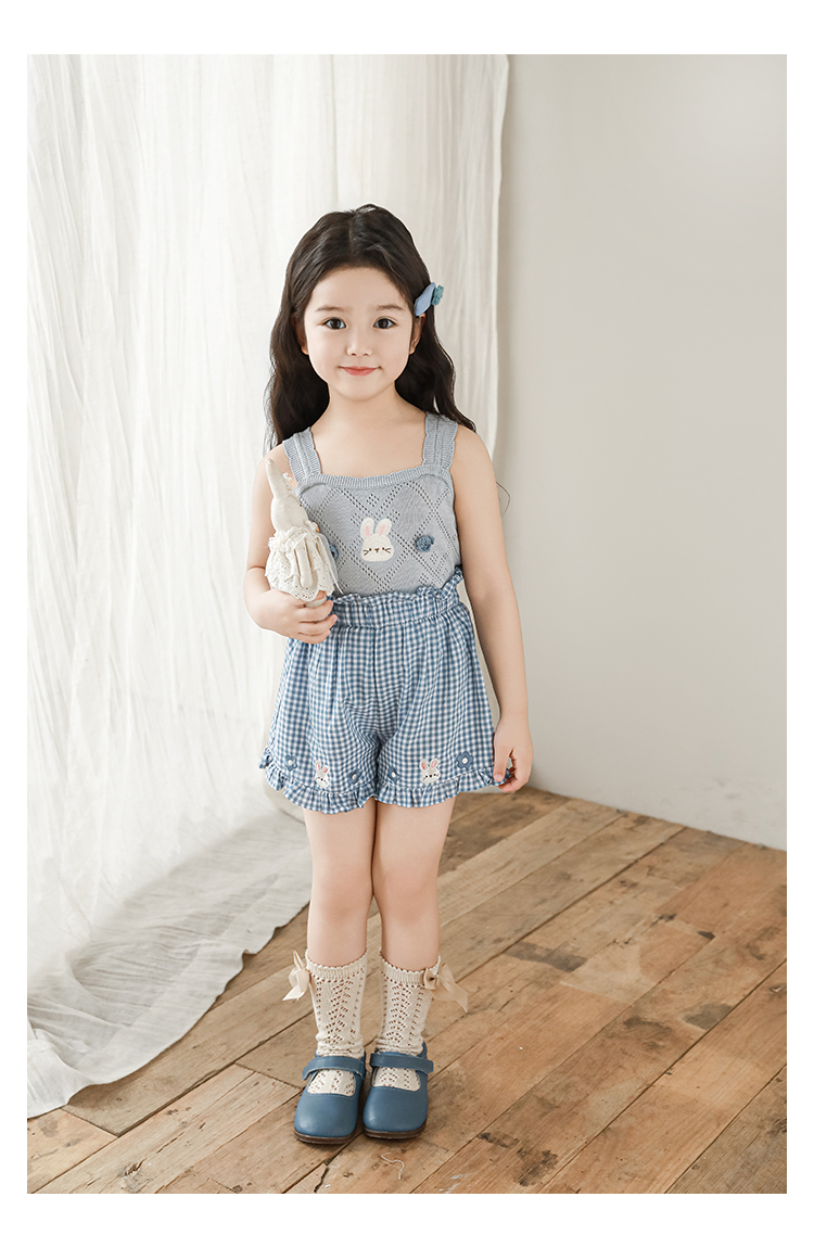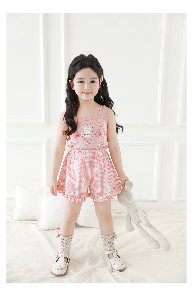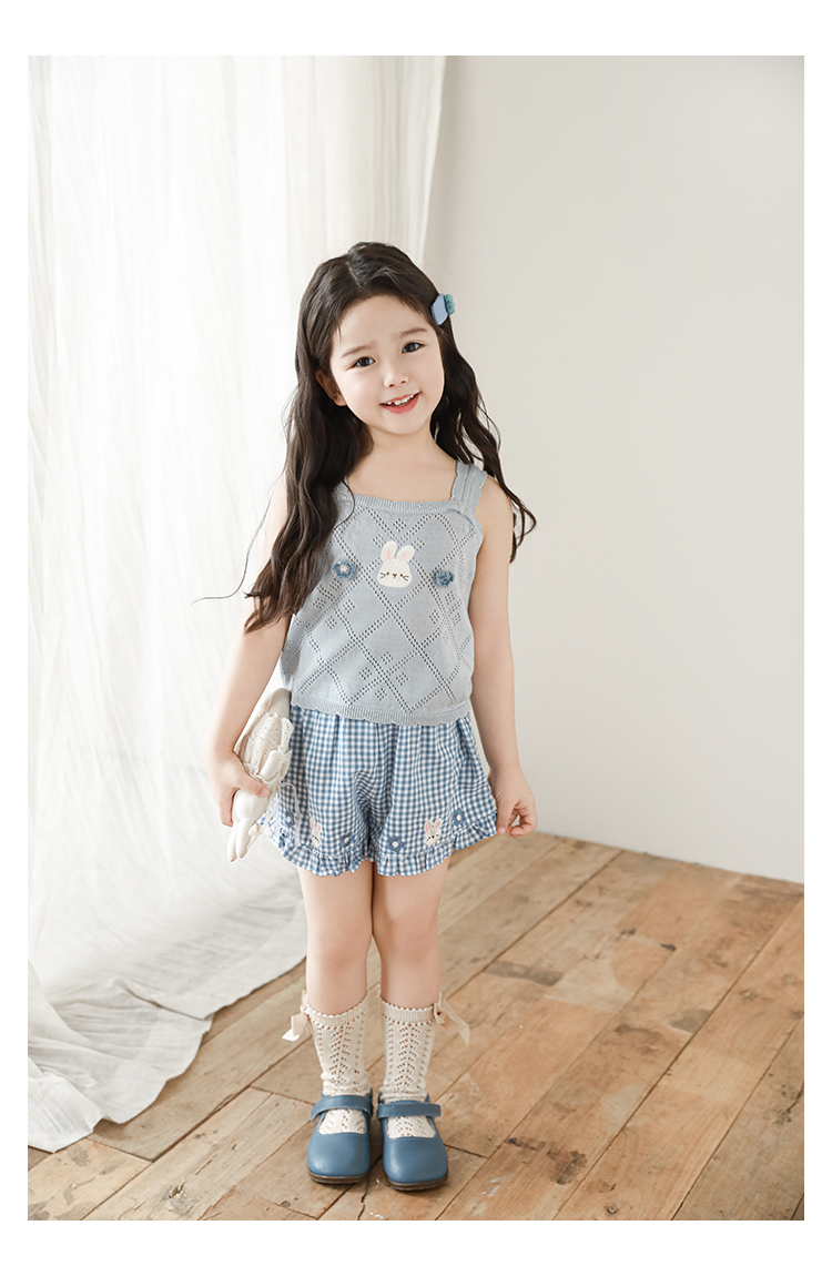 우리의 소녀는 여름에 시원하고 세트. 귀엽고 귀여운 토끼 수놓은 텐셀 마름모 어깨 서스펜더 반바지스토어 가기