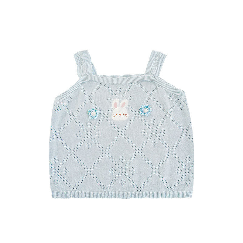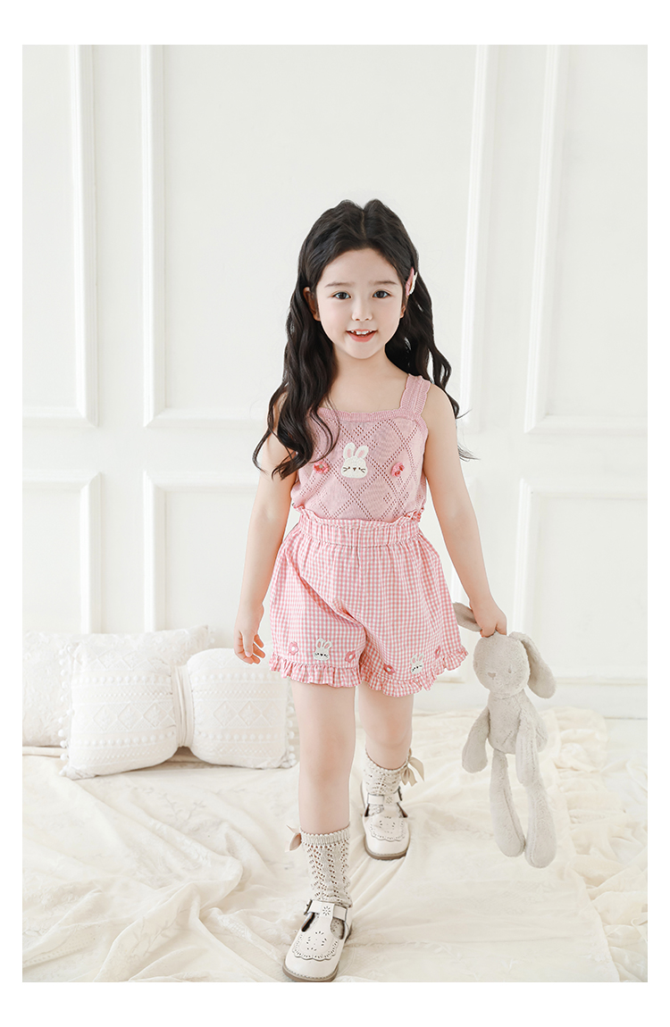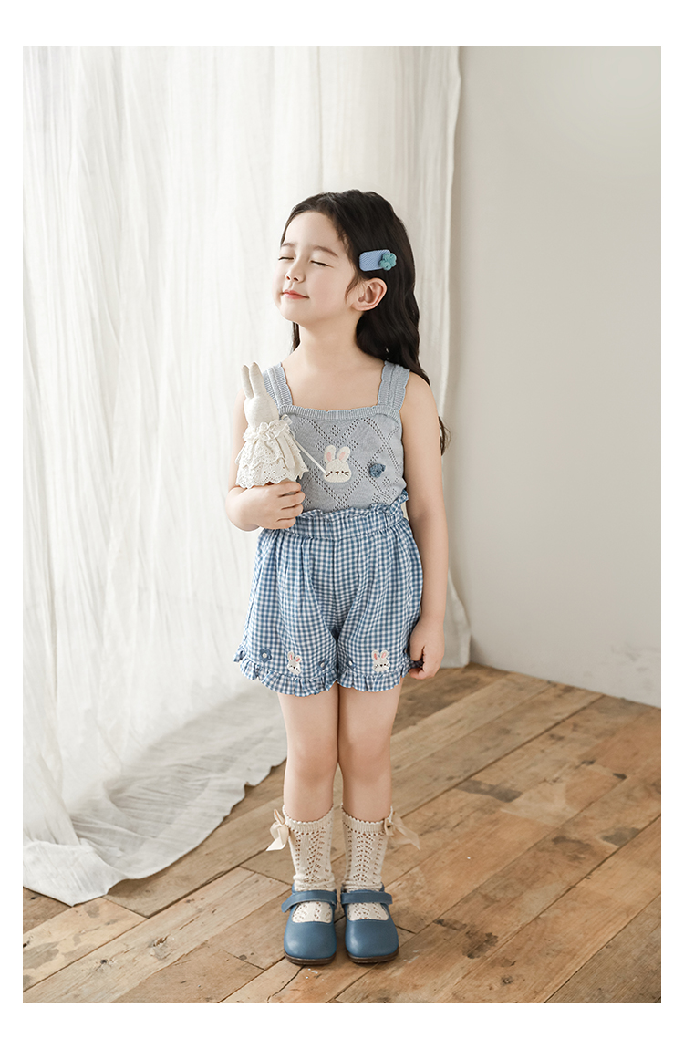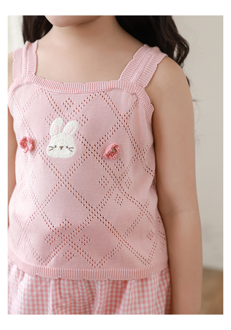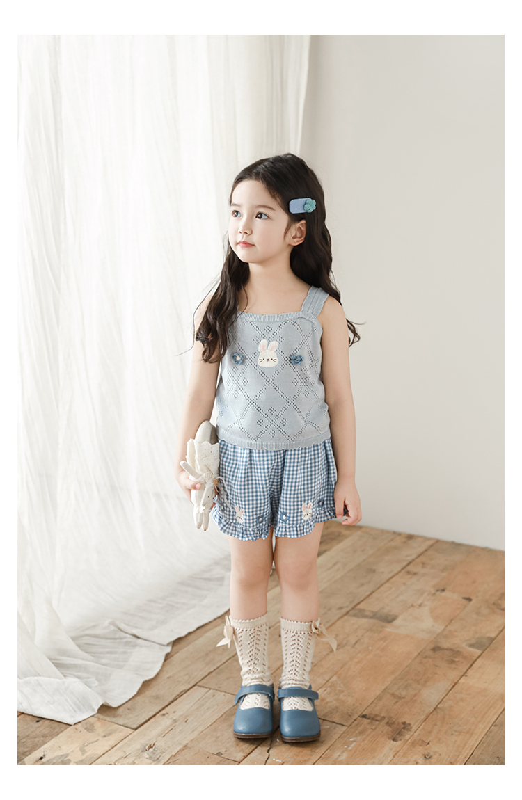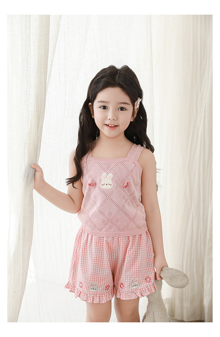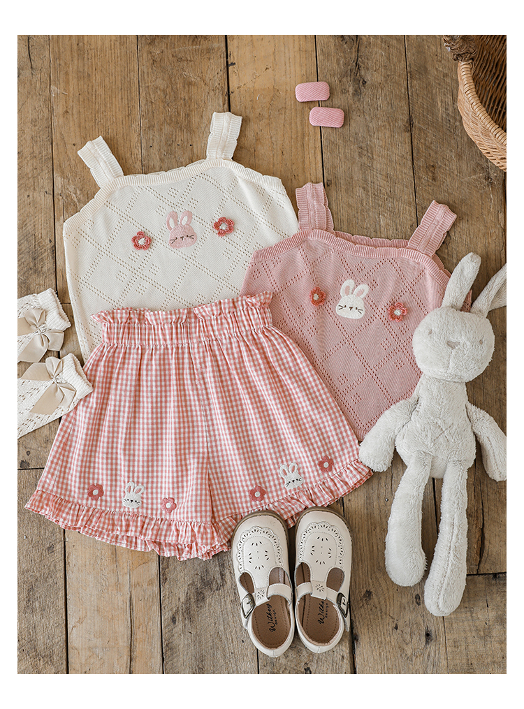 우리의 소녀는 여름에 시원하고 세트. 귀엽고 귀여운 토끼 수놓은 텐셀 마름모 어깨 서스펜더 반바지스토어 가기