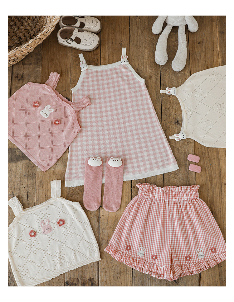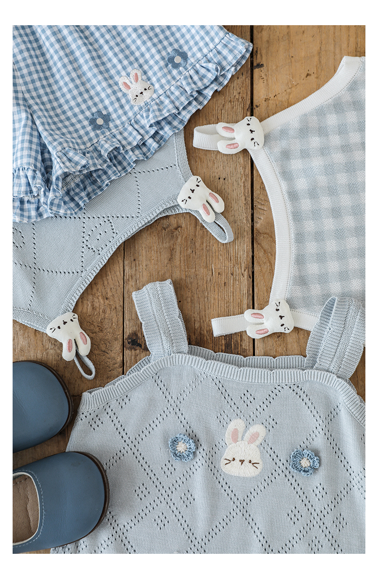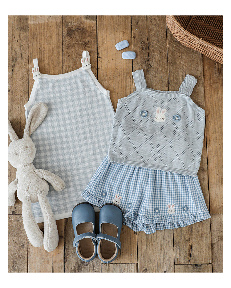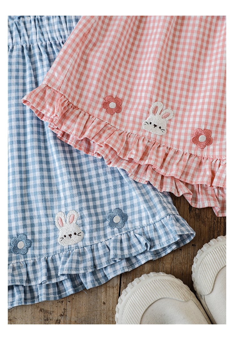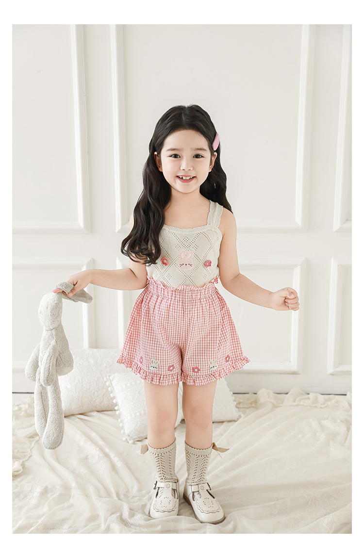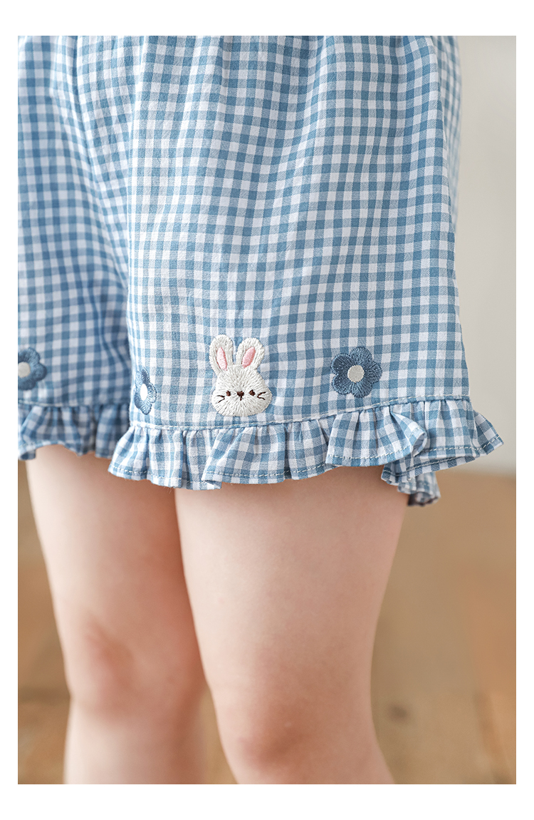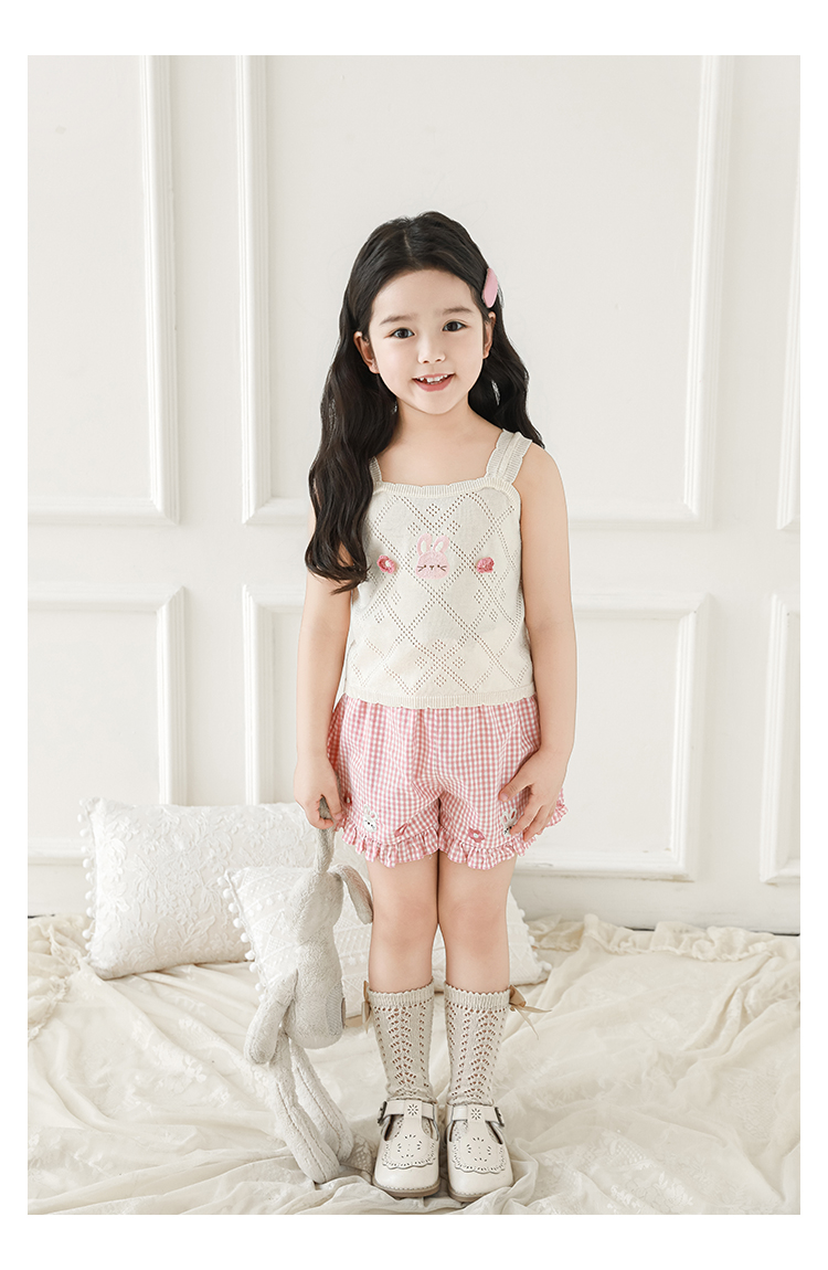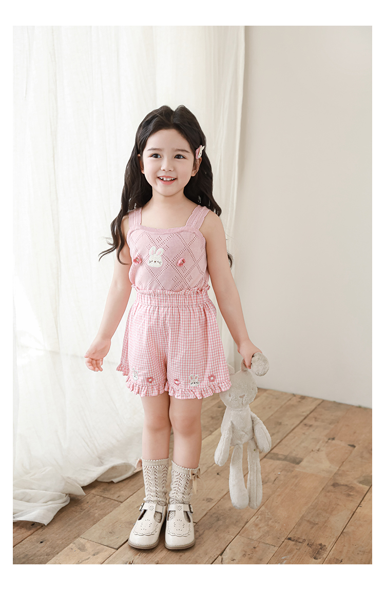 우리의 소녀는 여름에 시원하고 세트. 귀엽고 귀여운 토끼 수놓은 텐셀 마름모 어깨 서스펜더 반바지스토어 가기
