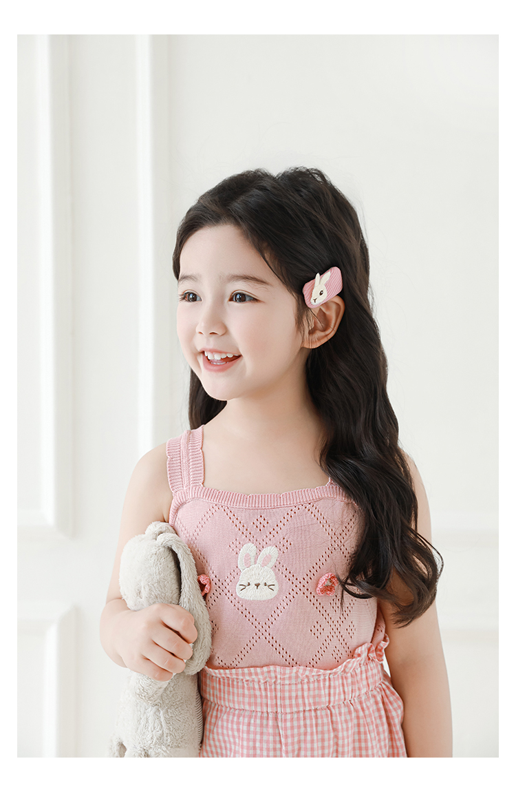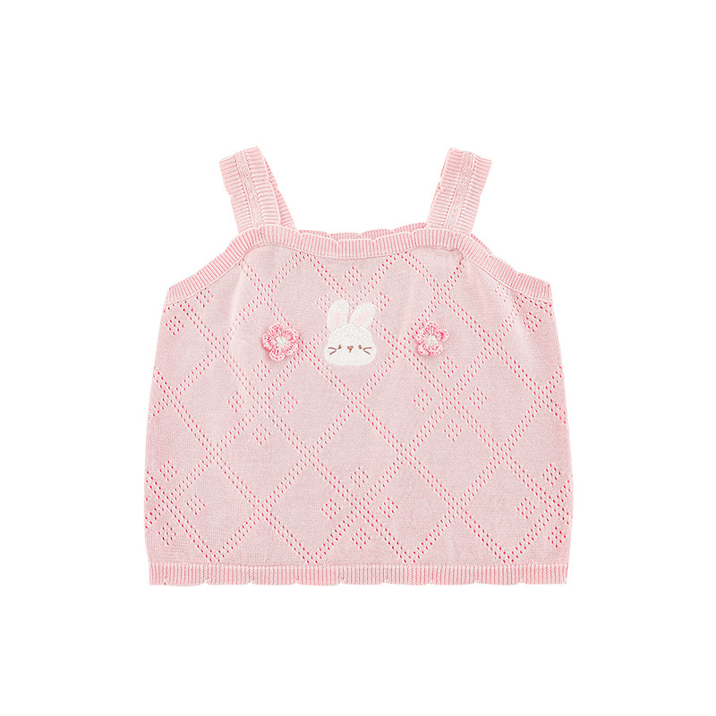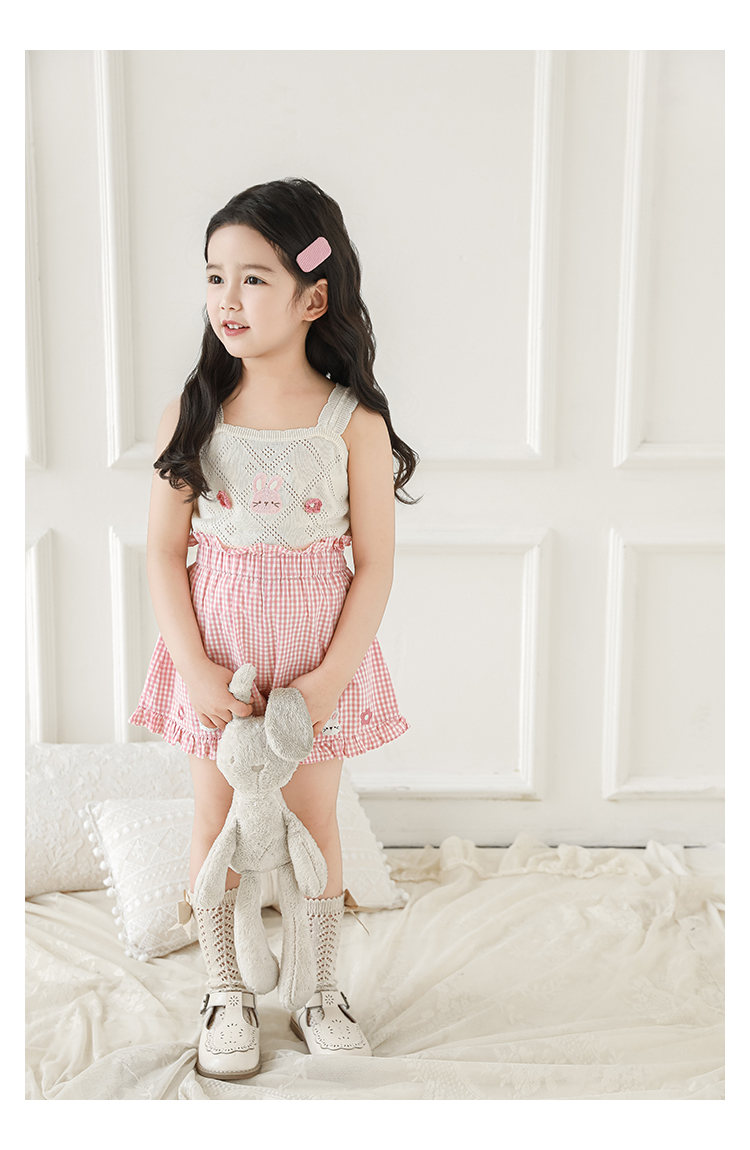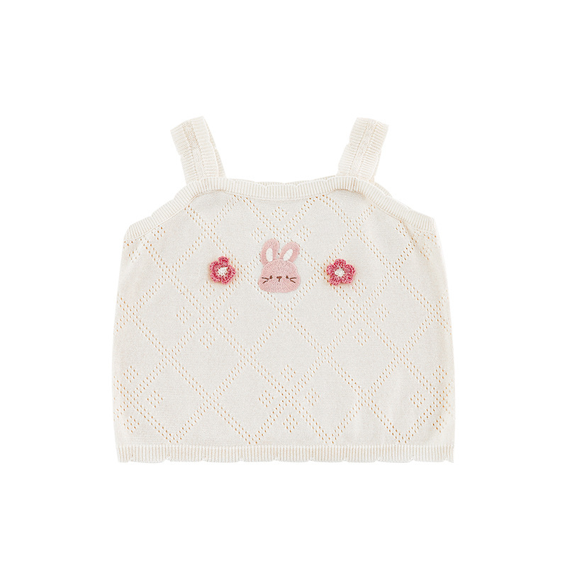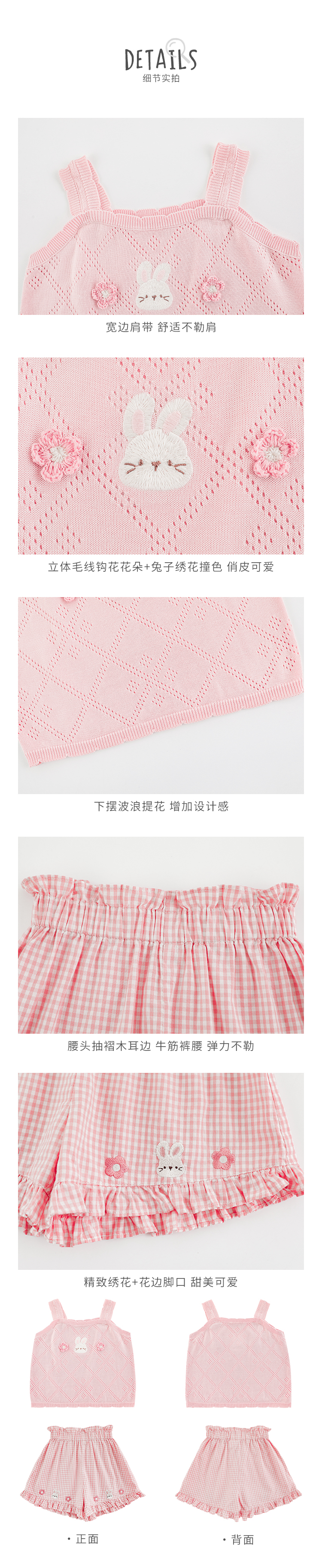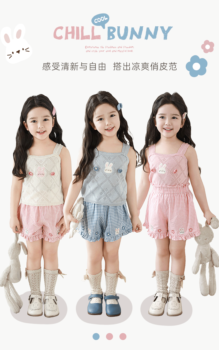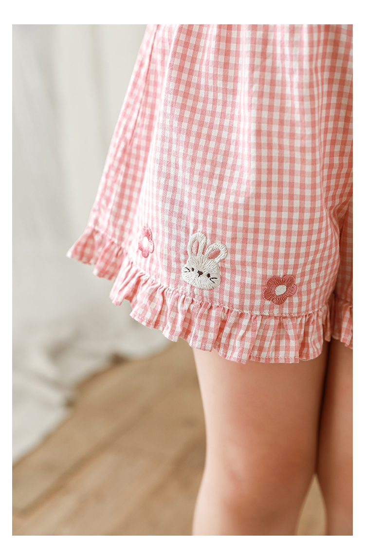 우리의 소녀는 여름에 시원하고 세트. 귀엽고 귀여운 토끼 수놓은 텐셀 마름모 어깨 서스펜더 반바지스토어 가기