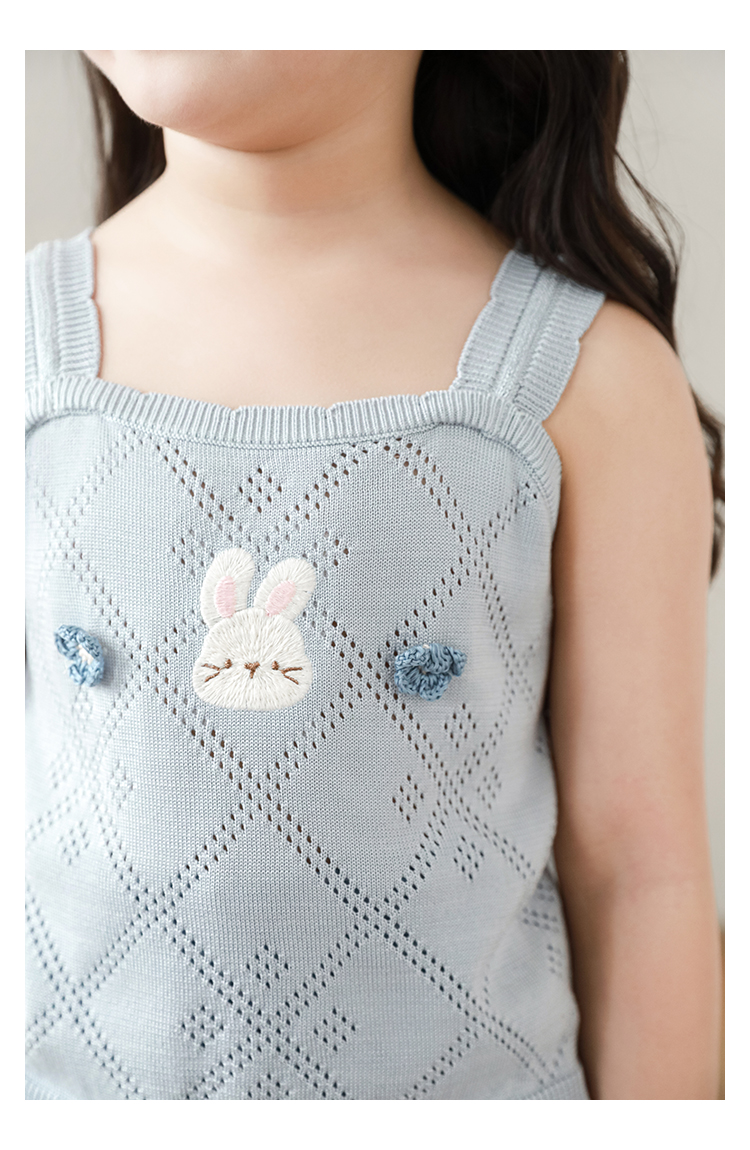 우리의 소녀는 여름에 시원하고 세트. 귀엽고 귀여운 토끼 수놓은 텐셀 마름모 어깨 서스펜더 반바지