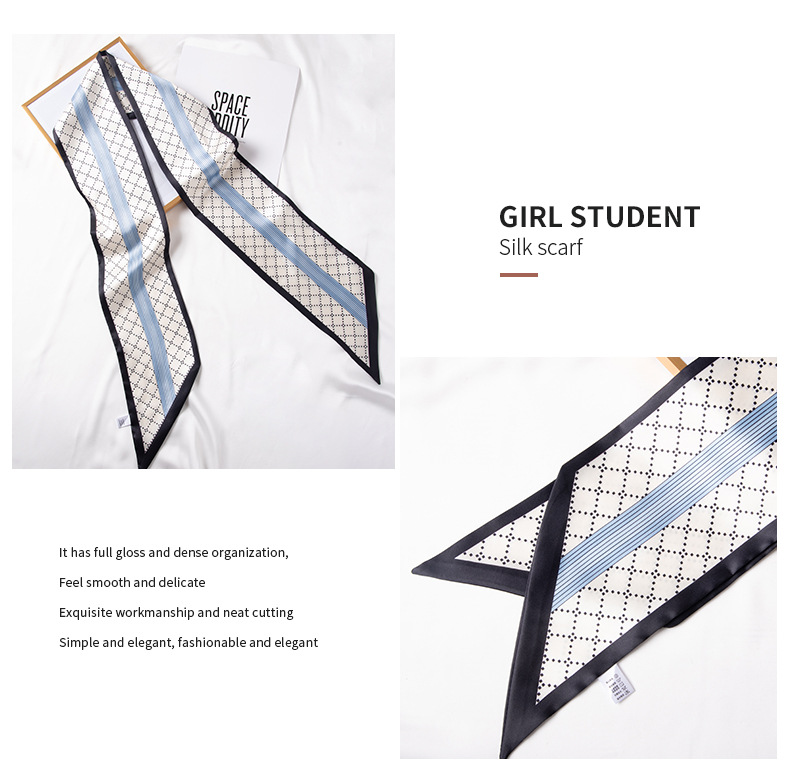 여성용 격자 무늬 실크 스카프 일본과 한국의 달콤하고 심플한 프린트 리본 트렌디 헤어 타이 여름 다용도 시뮬레이션 실크 스카프
