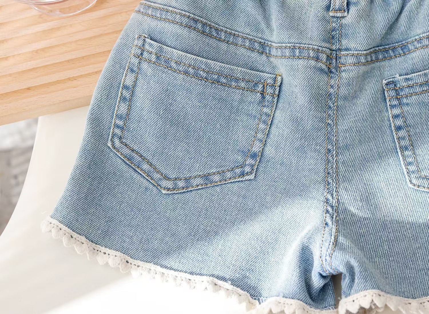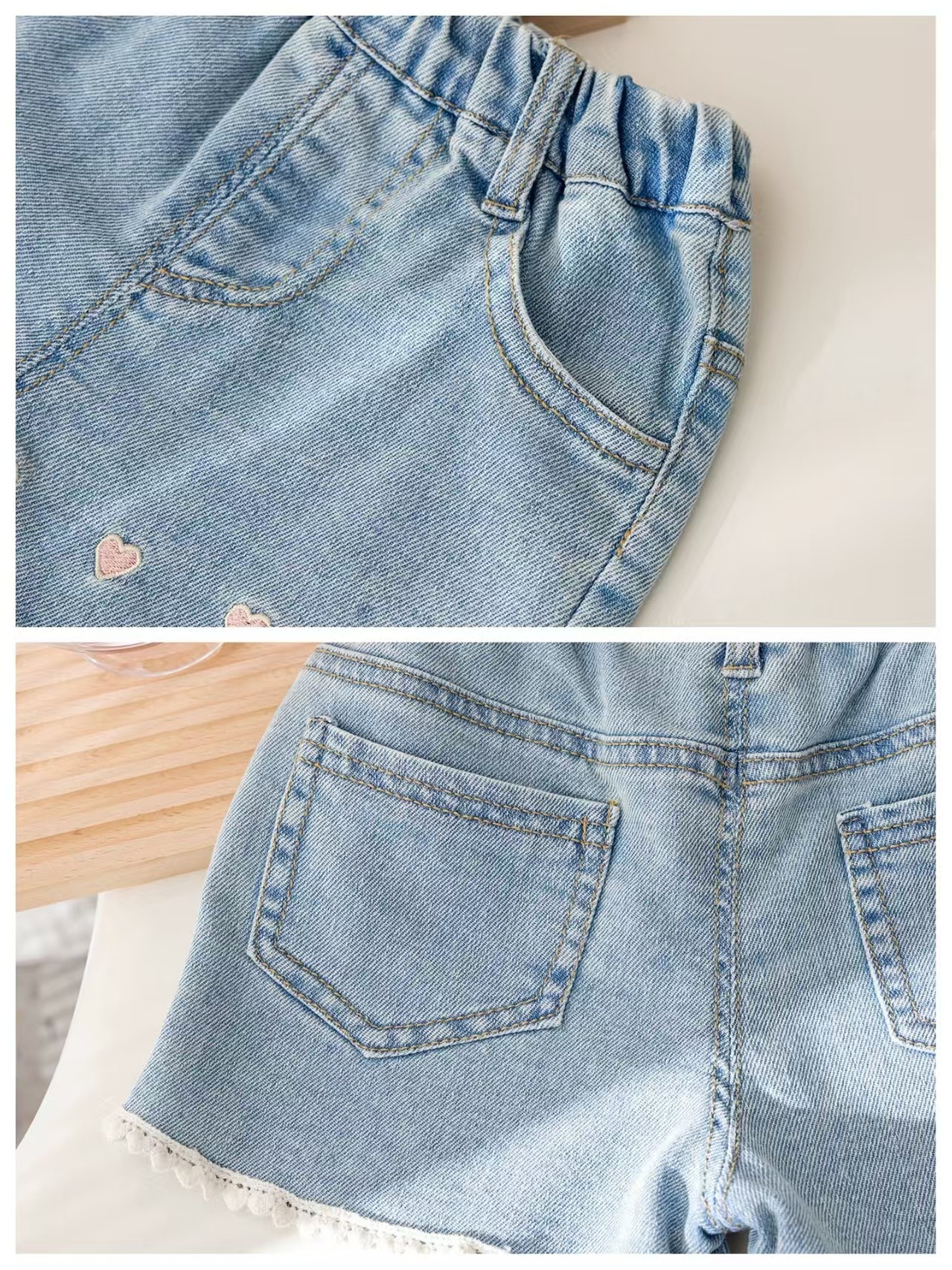 여아 데님 반바지 2025 새로운 스타일 아동용 하이 웨이스트 찢어진 중대형 아동용 외부 착용 와이드 핫 팬츠 얇은