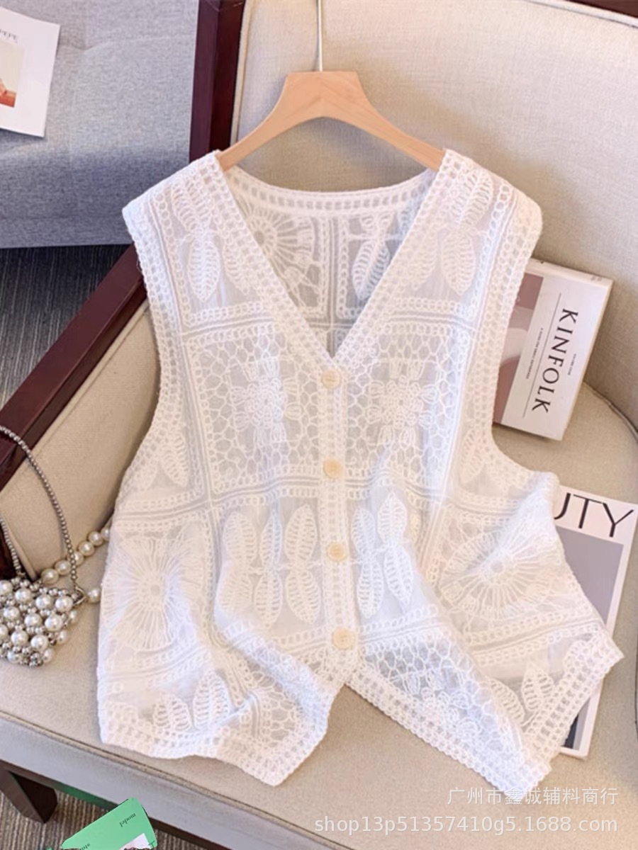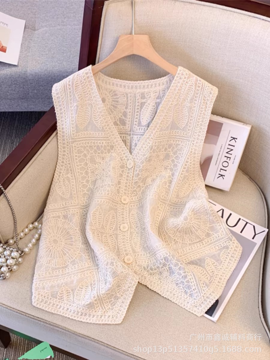 여성을위한 프렌치 v 넥 민소매 중공 크로 셰 뜨개질 조끼 봄 레이어드 연령 감소 블라우스 싱글 브레스트 탑