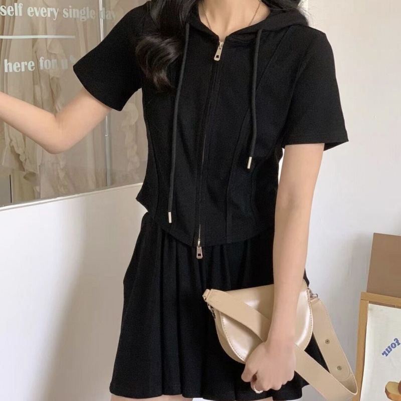 여름 새로운 패션 통근 디자인 센스 후드 더블 지퍼 짧은 소매 탑 하이 허리 슬림 룩 투피스 바지 여성스토어 가기