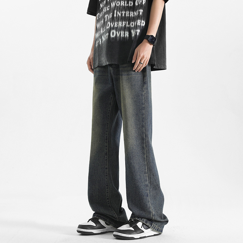 봄과 가을 새로운 남성 스타일 워시드 바닥 길이 청바지 남성 복고풍 홍콩 스타일 루즈 스트레이트 캐주얼 긴 바지