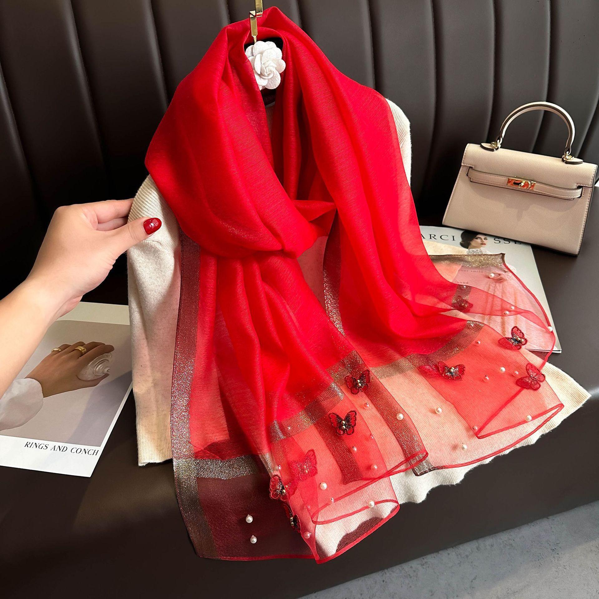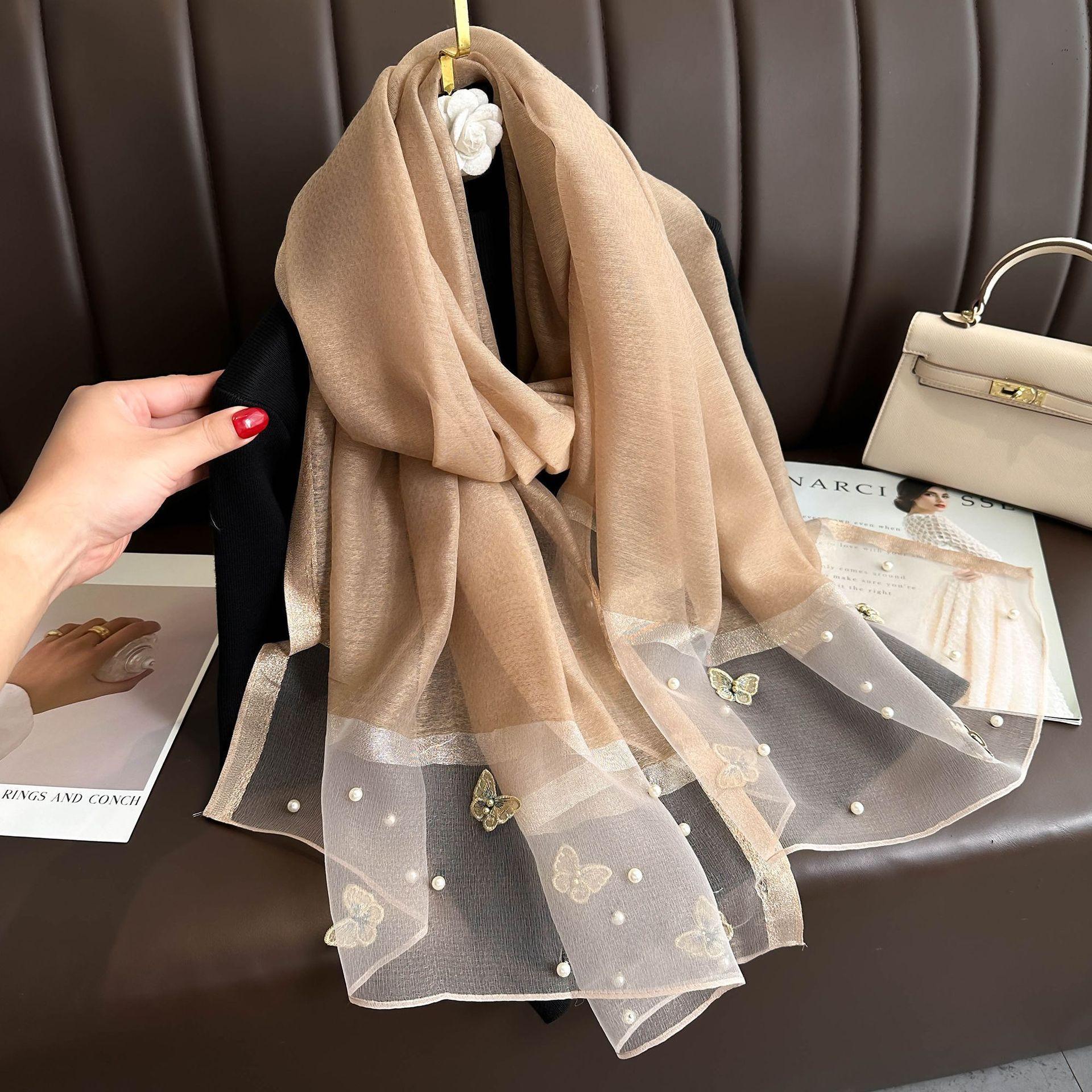 봄과 가을 새로운 스타일의 구슬 장식 나비 시뮬레이션 실크 스카프, 여성스럽고 다재다능한 오간자 구슬 장식 실크 스카프