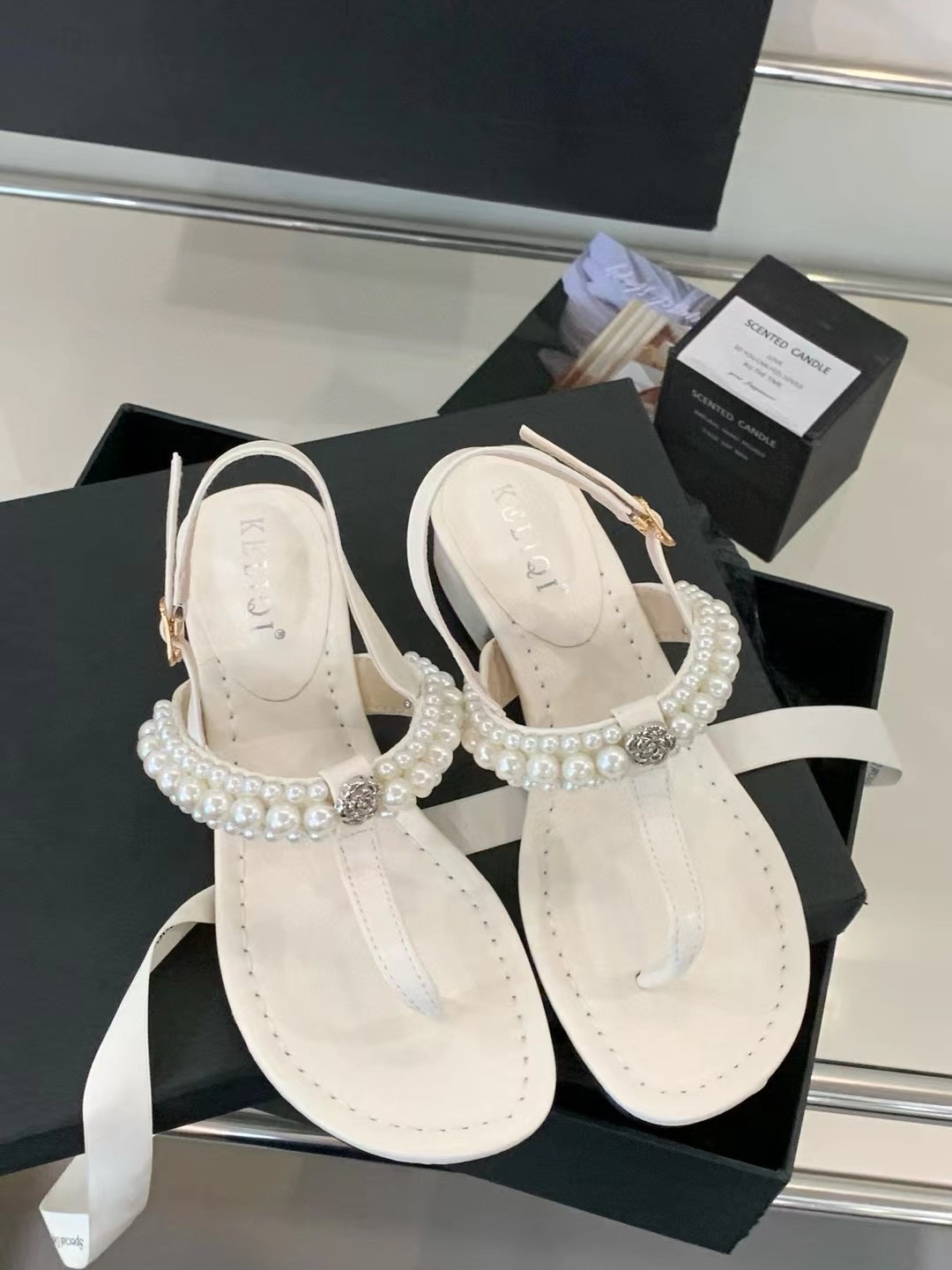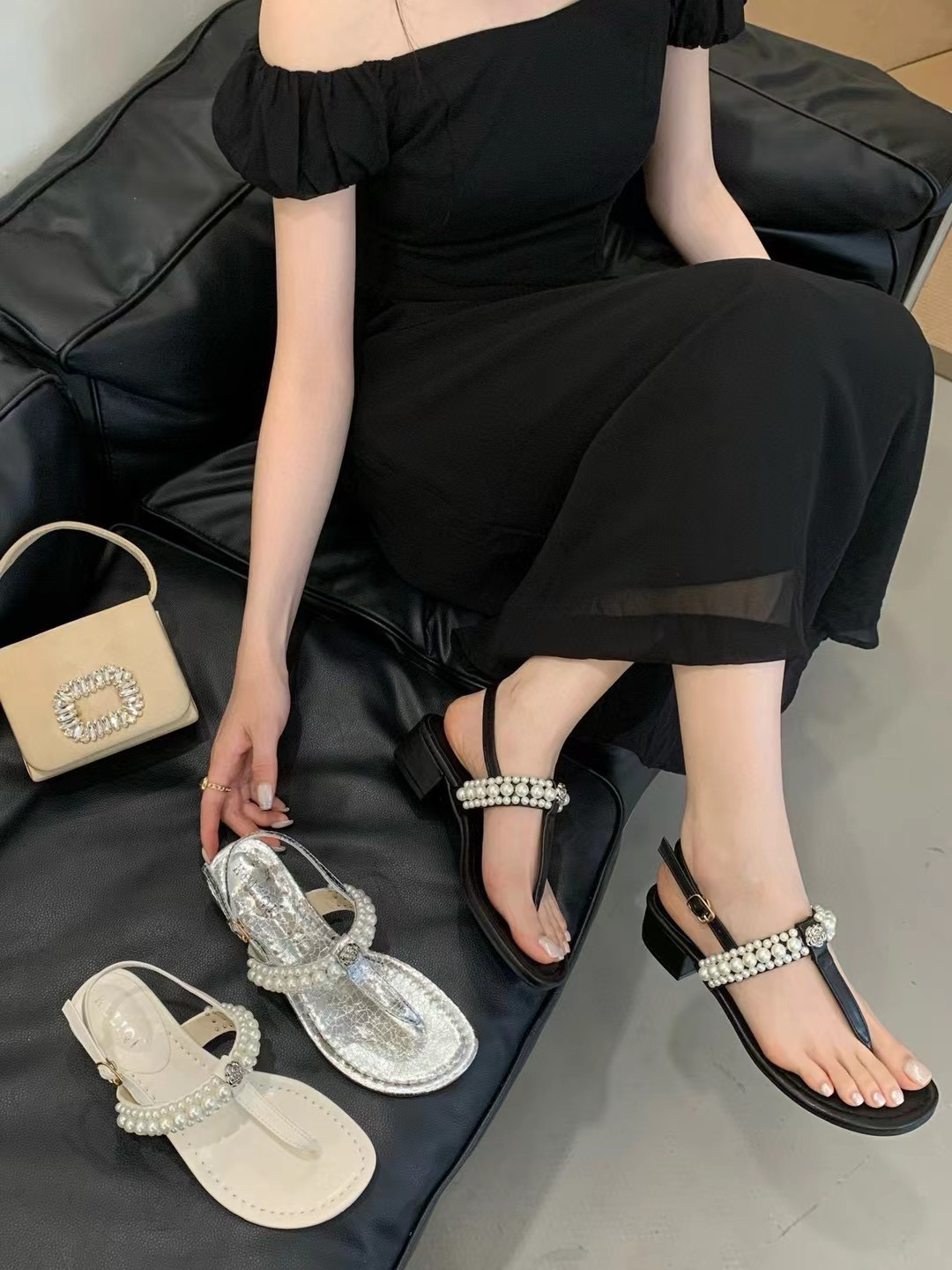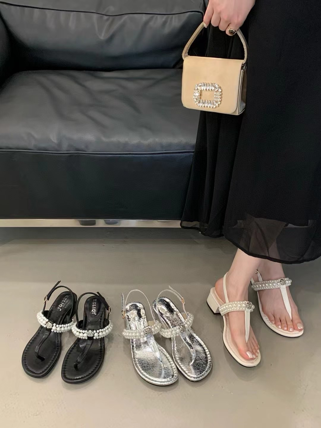 2025년 여름 신상 패셔너블한 여성용 두꺼운 굽 플립플롭 샌들, 진주 플립플롭, 프렌치 라운드 토 다용도 샌들스토어 가기
