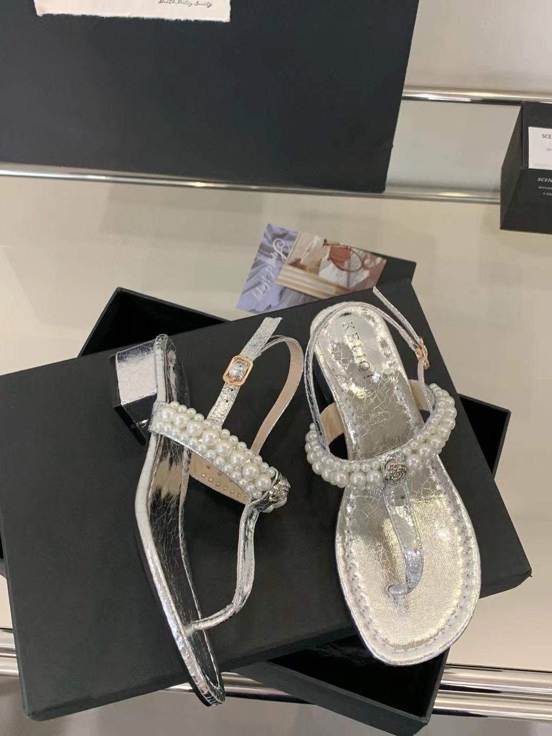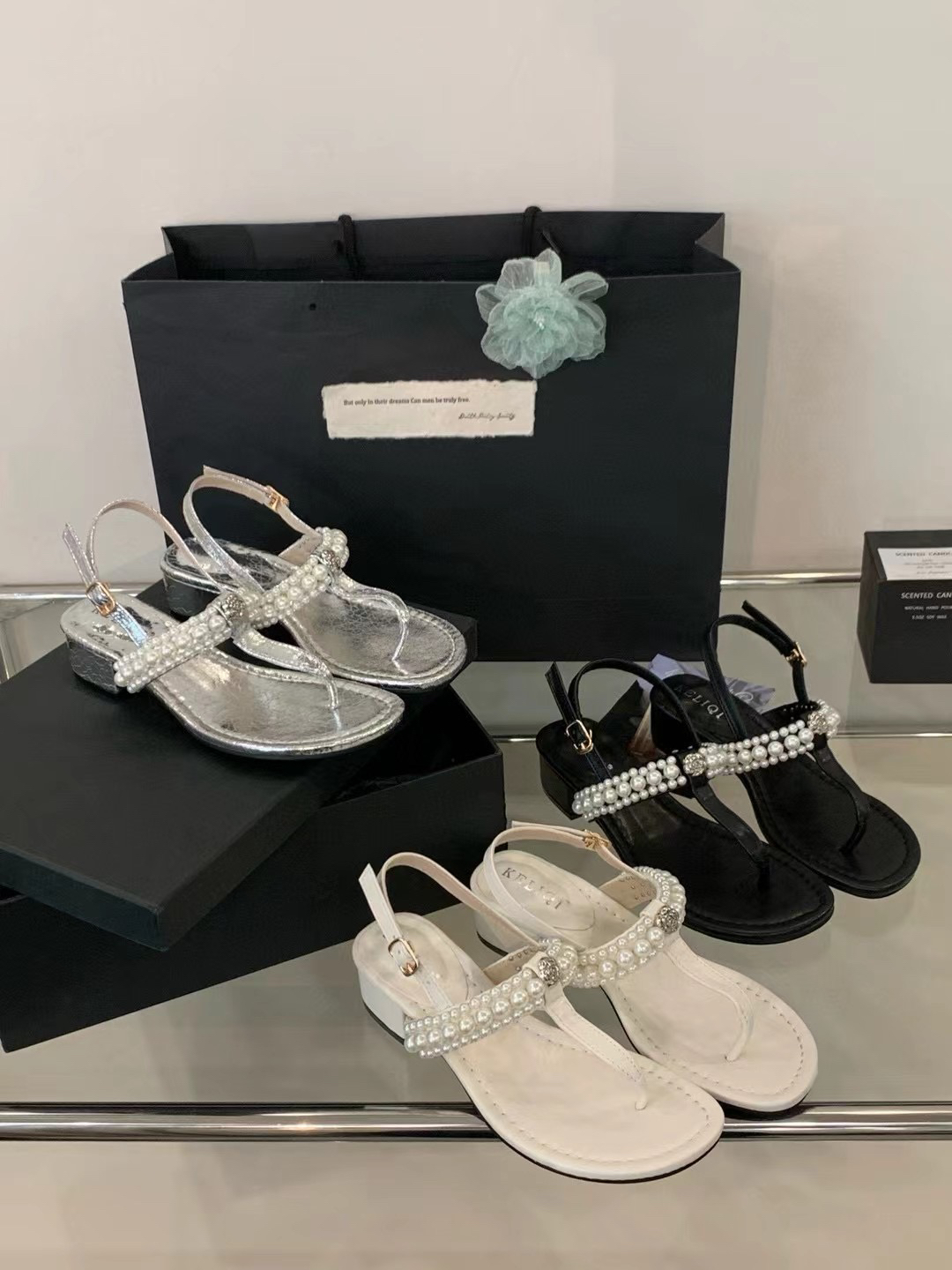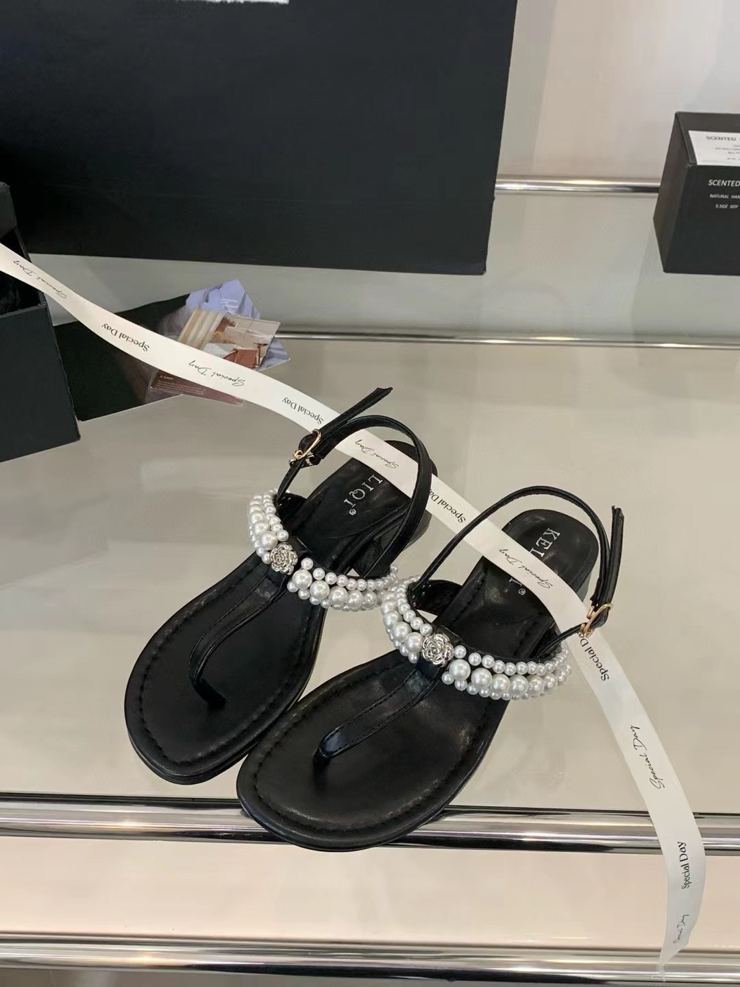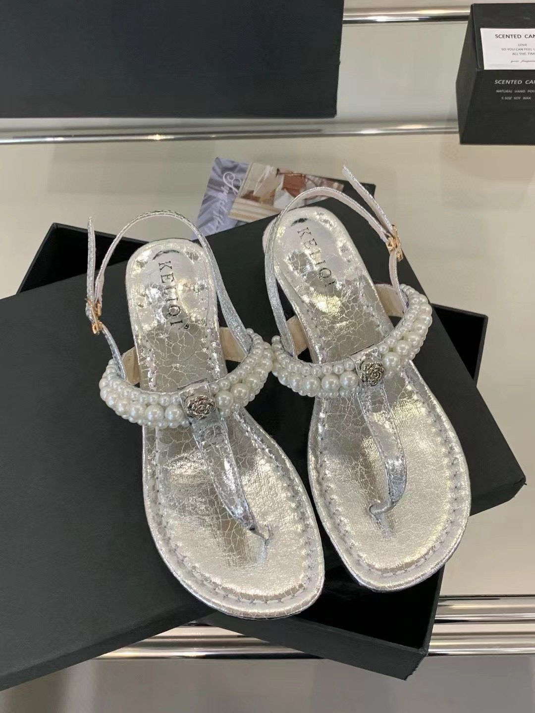 2025년 여름 신상 패셔너블한 여성용 두꺼운 굽 플립플롭 샌들, 진주 플립플롭, 프렌치 라운드 토 다용도 샌들스토어 가기