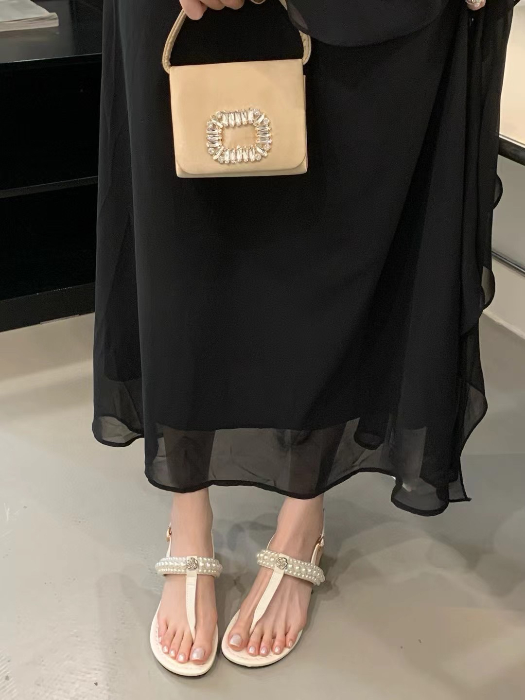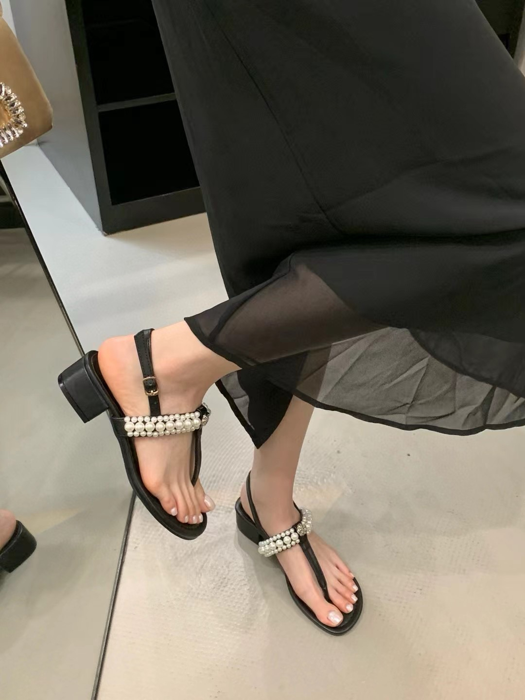 2025년 여름 신상 패셔너블한 여성용 두꺼운 굽 플립플롭 샌들, 진주 플립플롭, 프렌치 라운드 토 다용도 샌들