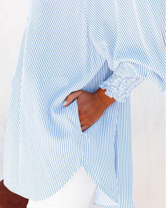 유럽과 미국의 국경 간 아마존 AliExpress 줄무늬 긴팔 느슨한 셔츠 캐주얼 여성의 새로운 포켓 셔츠 탑