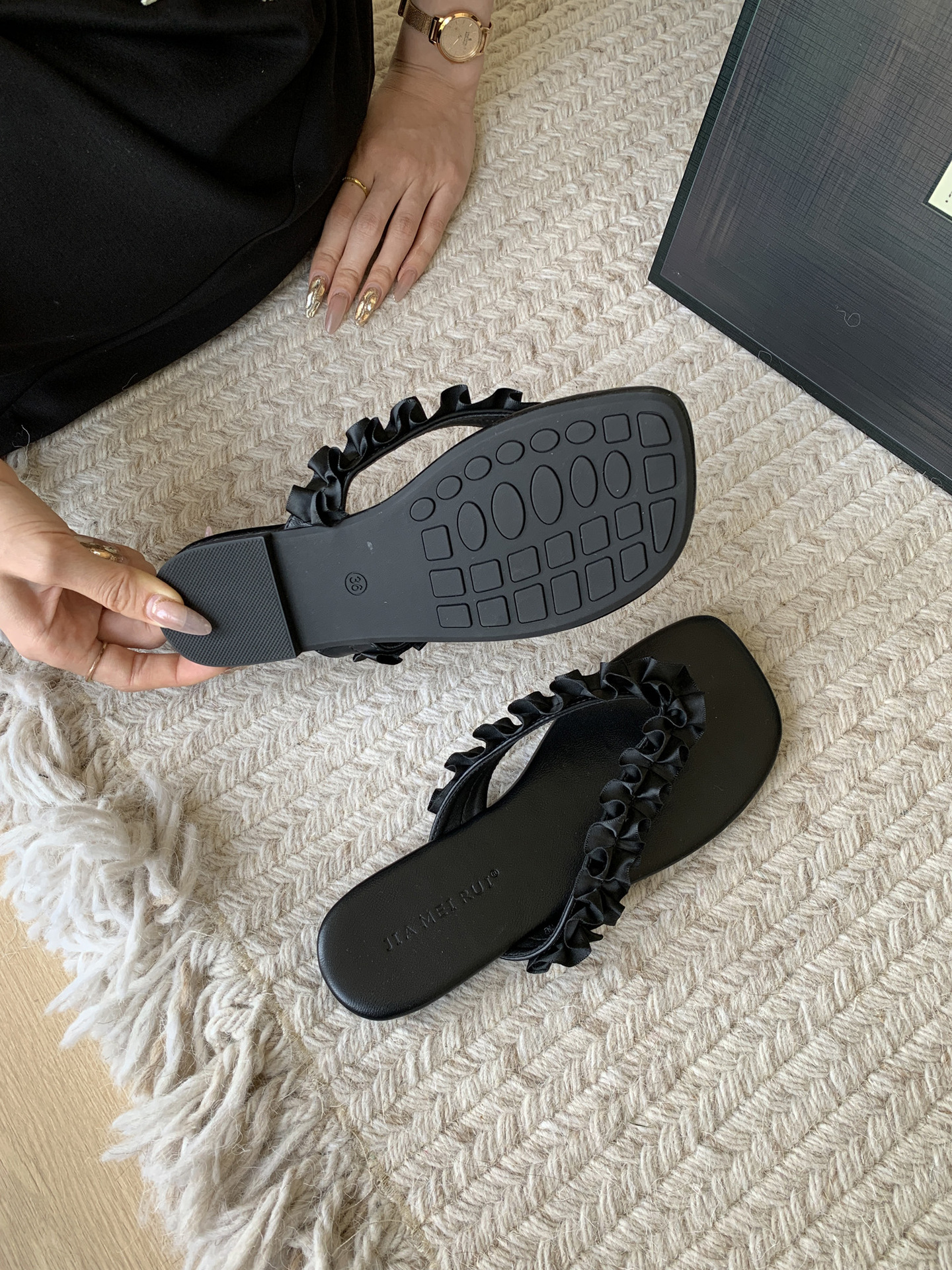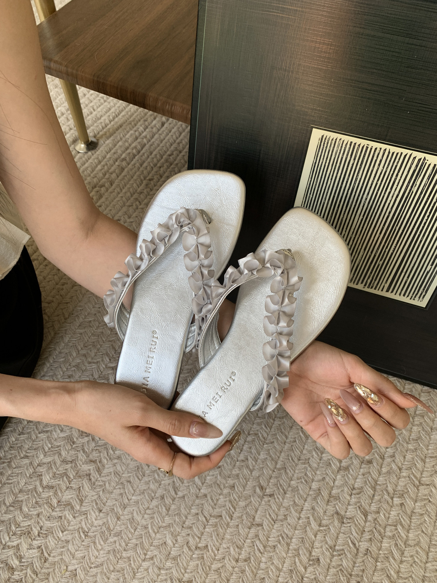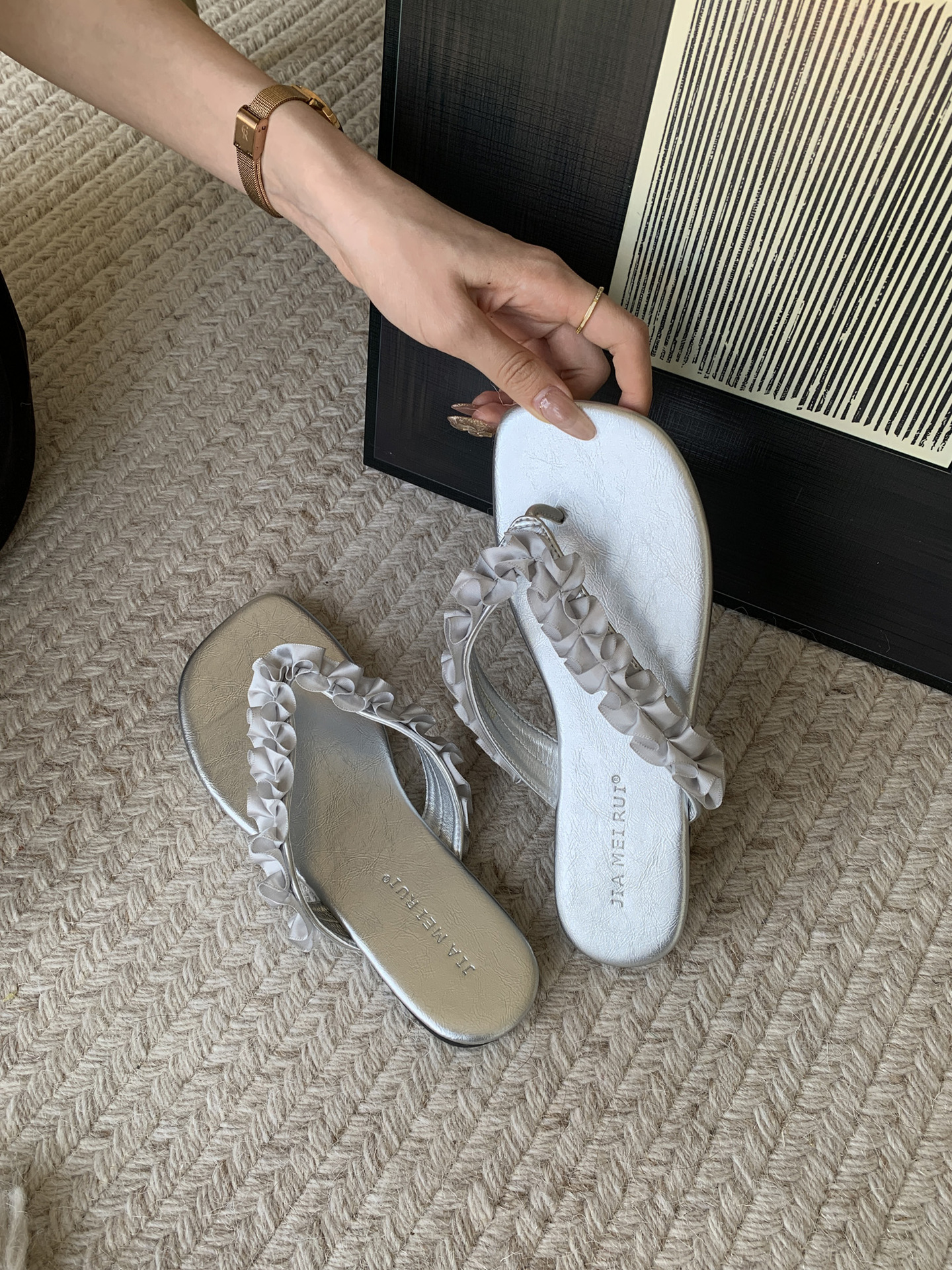 2025년 여름 신상 라운드 투 헤링본 오픈 토 러플 레이스 플랫 바닥 게으른 여성용 비치 휴가 샌들