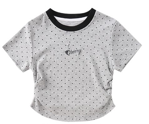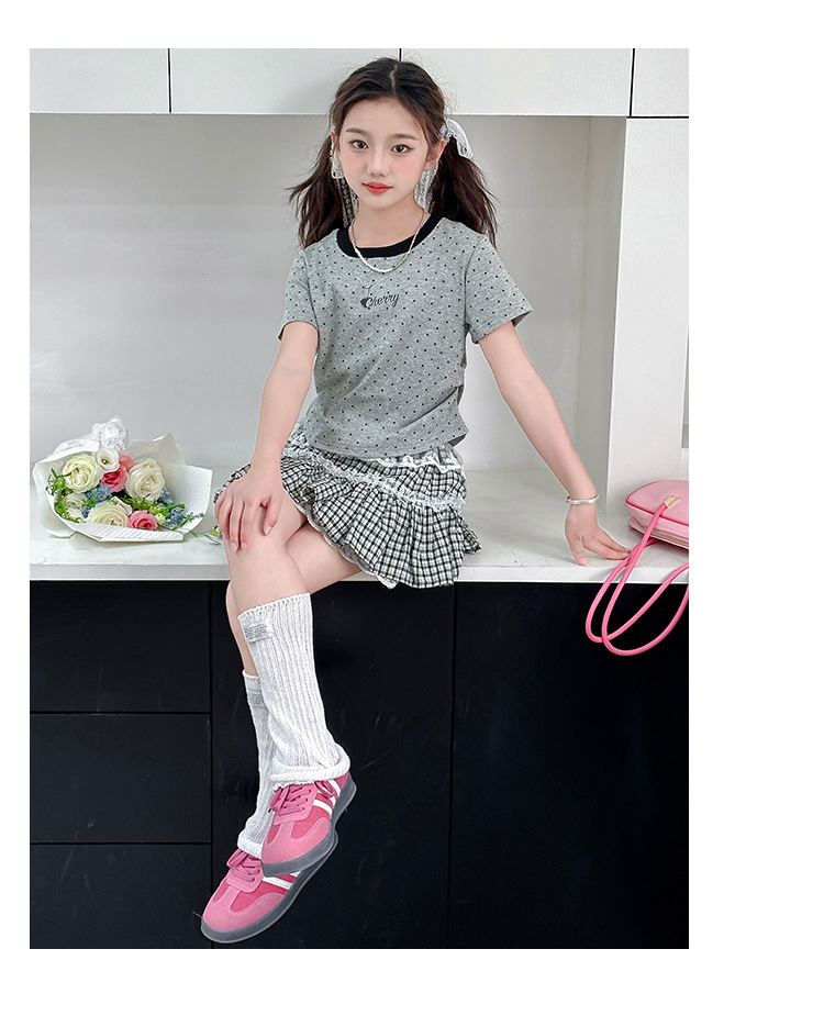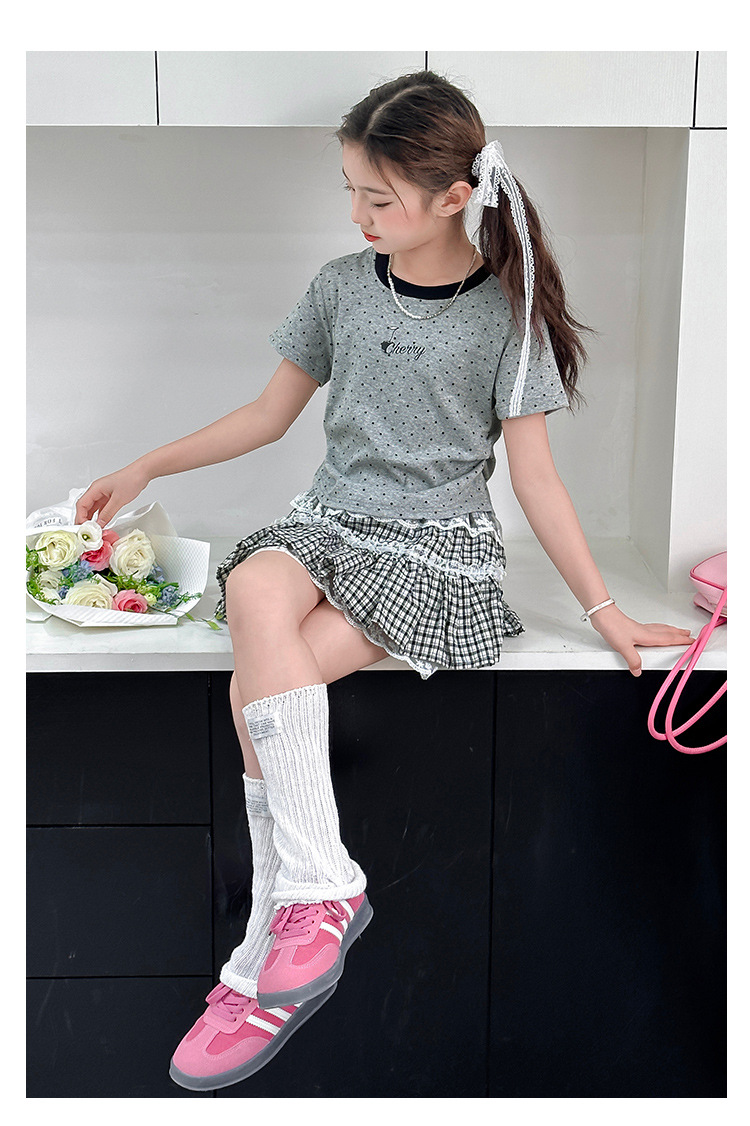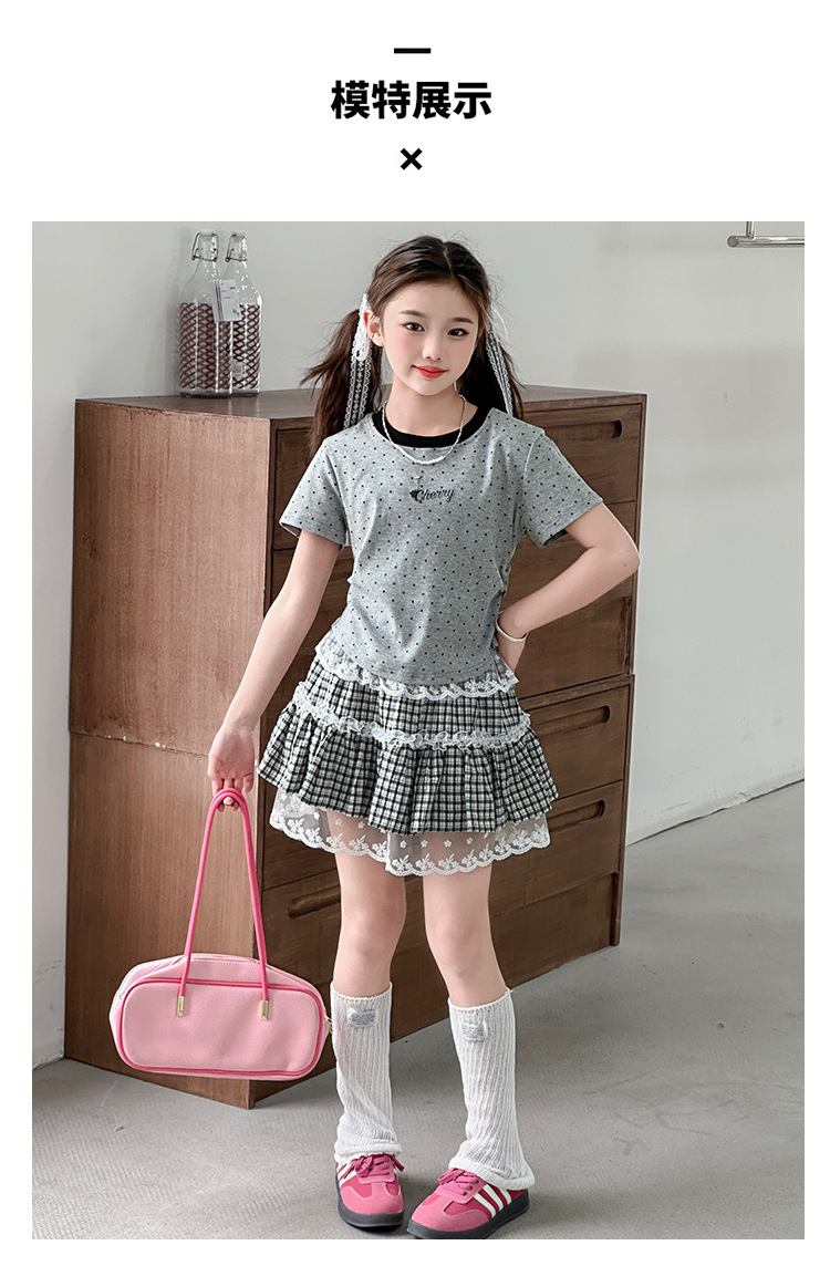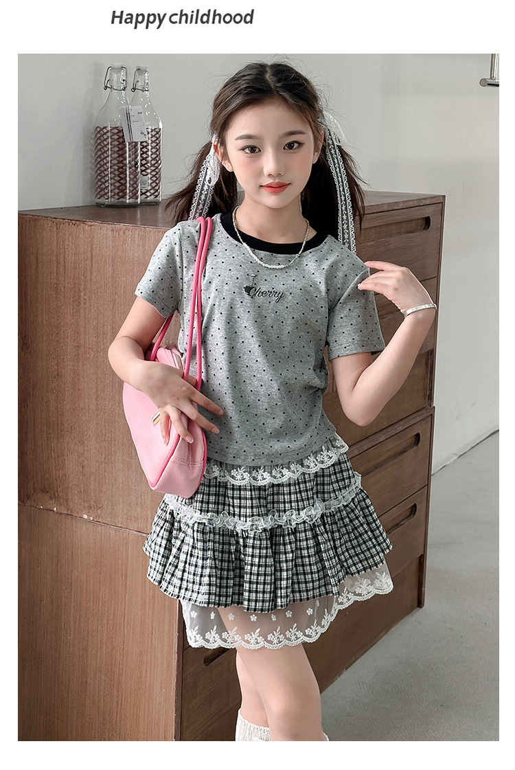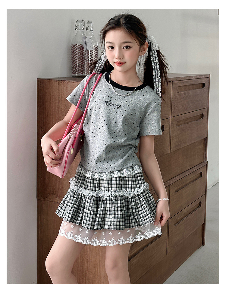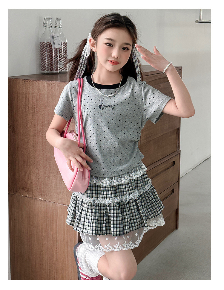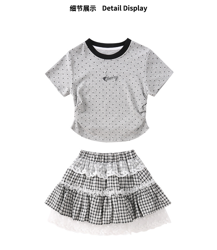 폴로 도트 티셔츠 2025 여름 새로운 레이스 스커트 세트 소녀 패션 귀여운 패션 회색 폴로 도트 세트스토어 가기