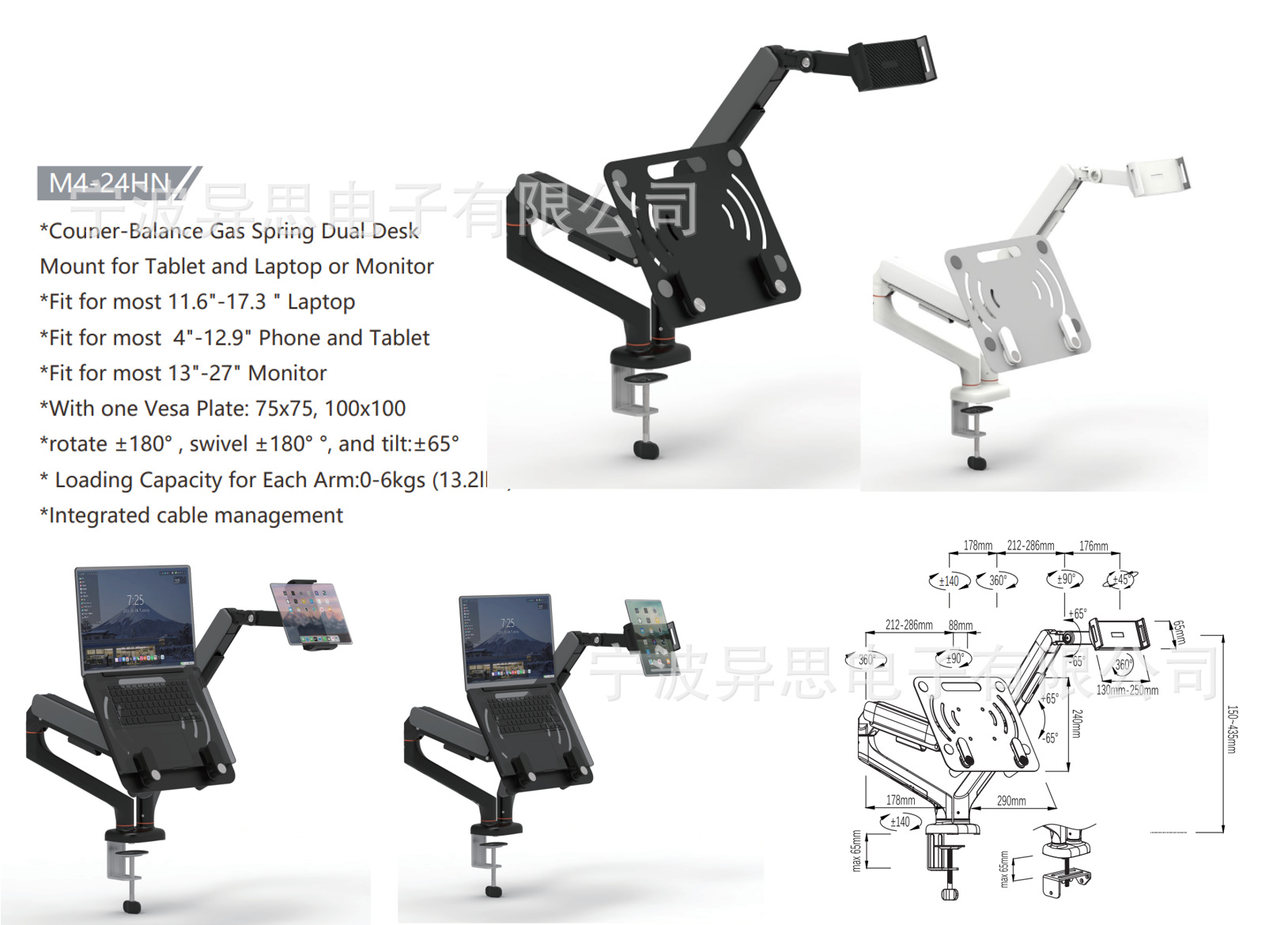 노트북 트레이 플러스 핸드 랙 태블릿 랙 더블 팔 기계 팔 0-6kg 무료 호버 가스 스프링 테이블 클립