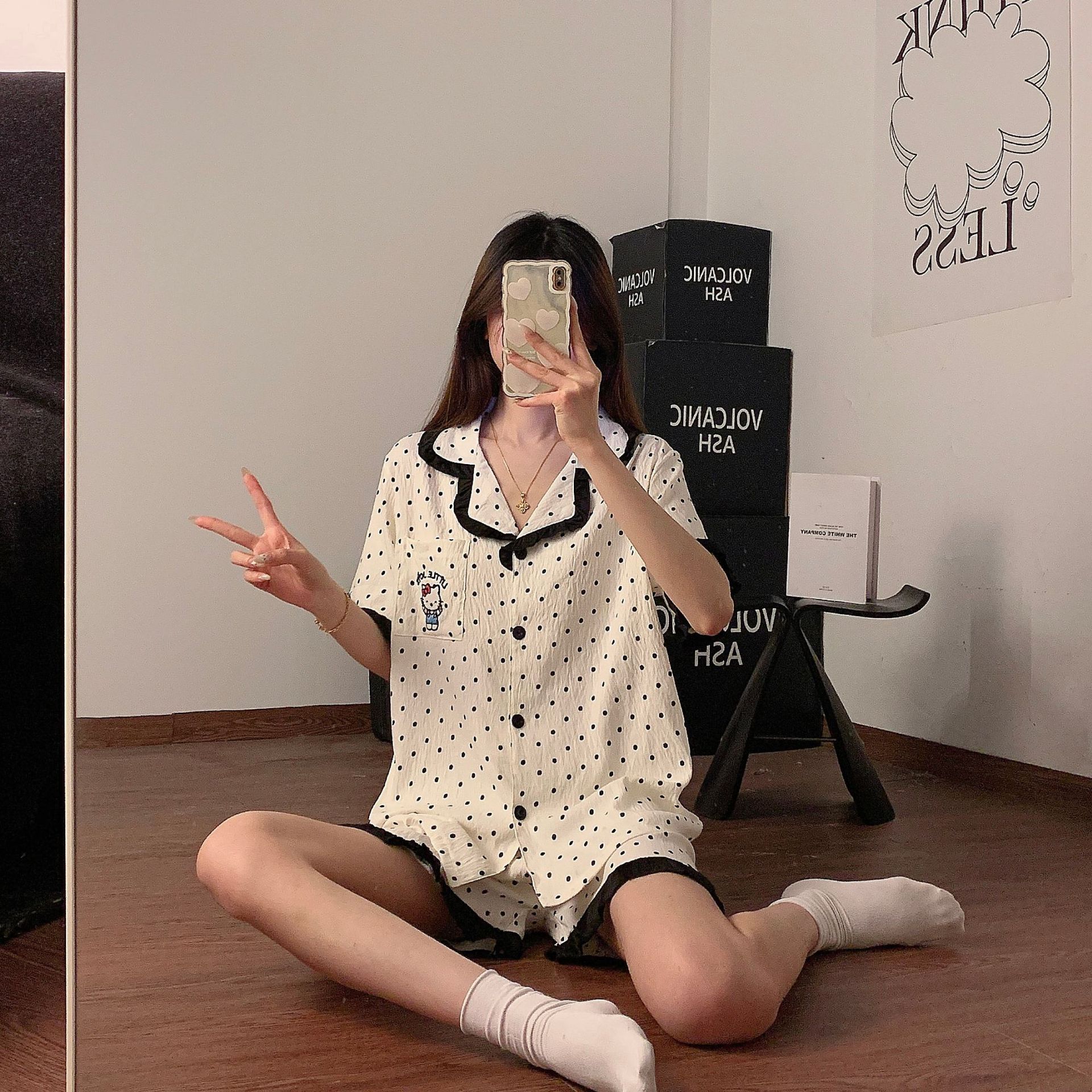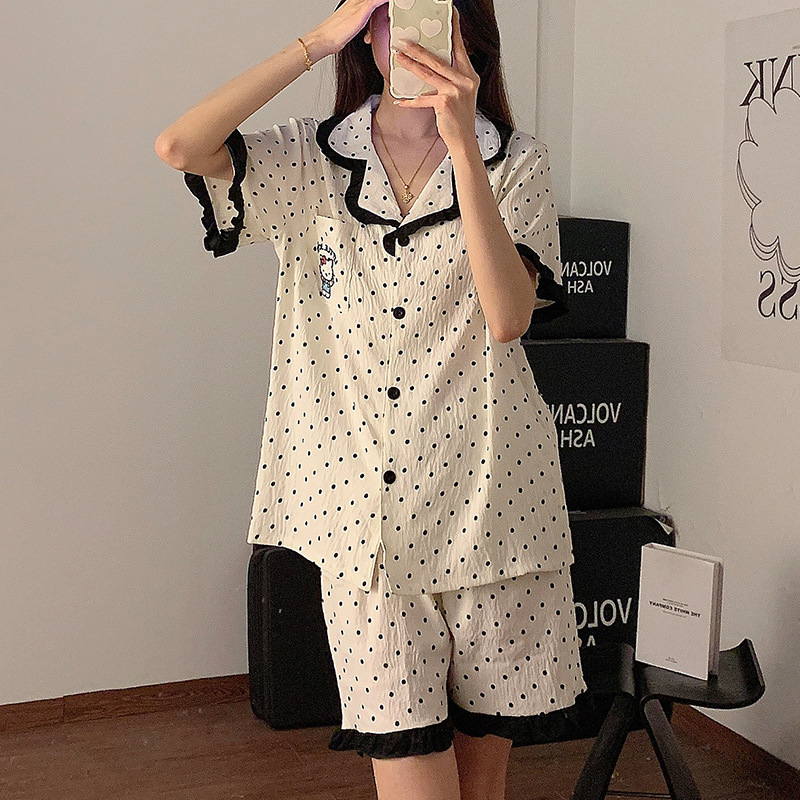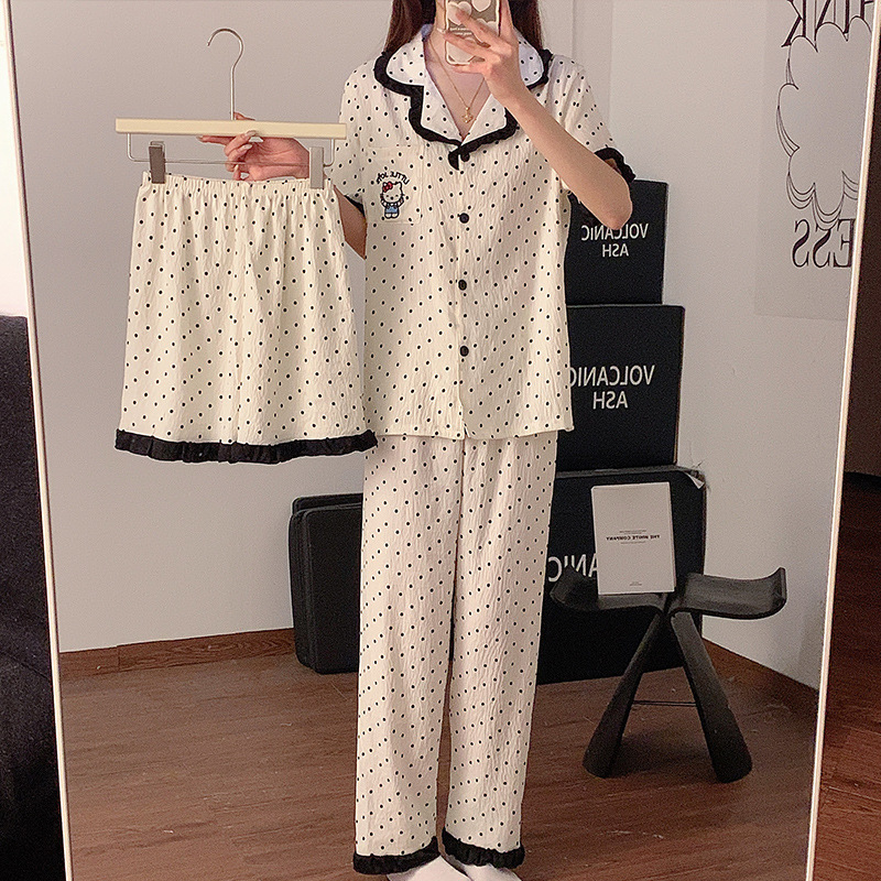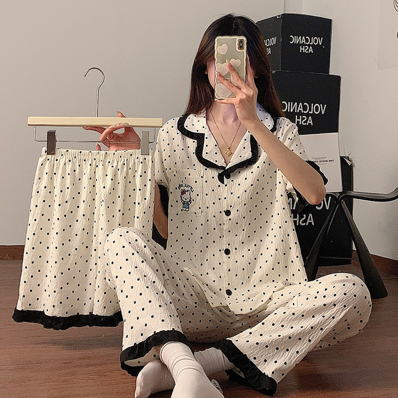 여름 여성을 위한 달콤한 폴카 도트 KT 고양이 잠옷, 귀여운 소녀 레이스 공주 반팔 3피스 홈웨어 세트, 외부 착용 가능스토어 가기