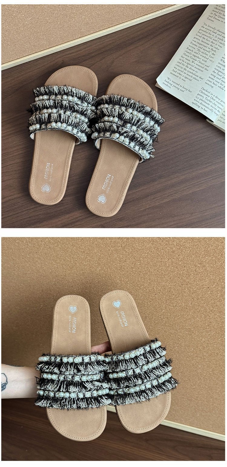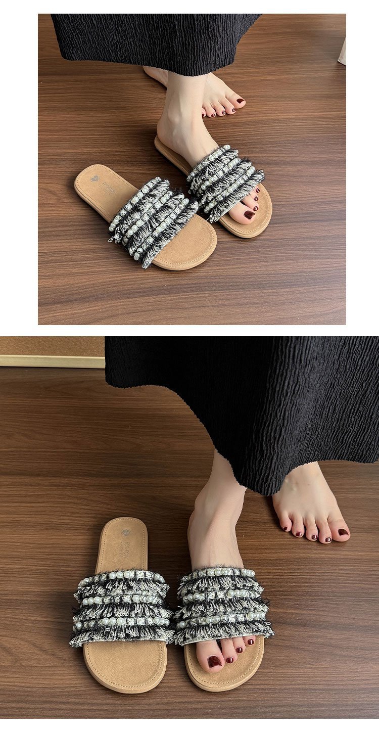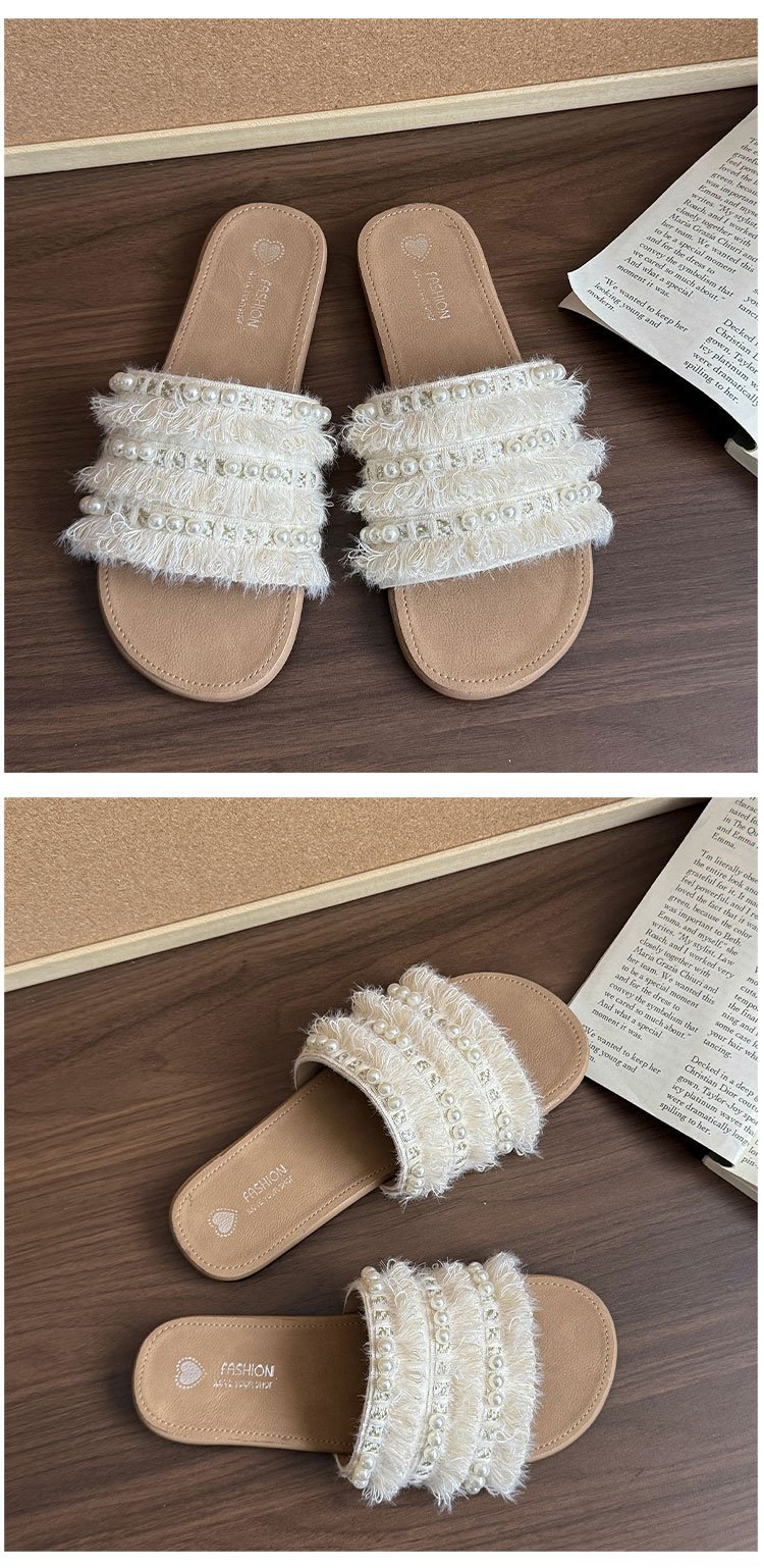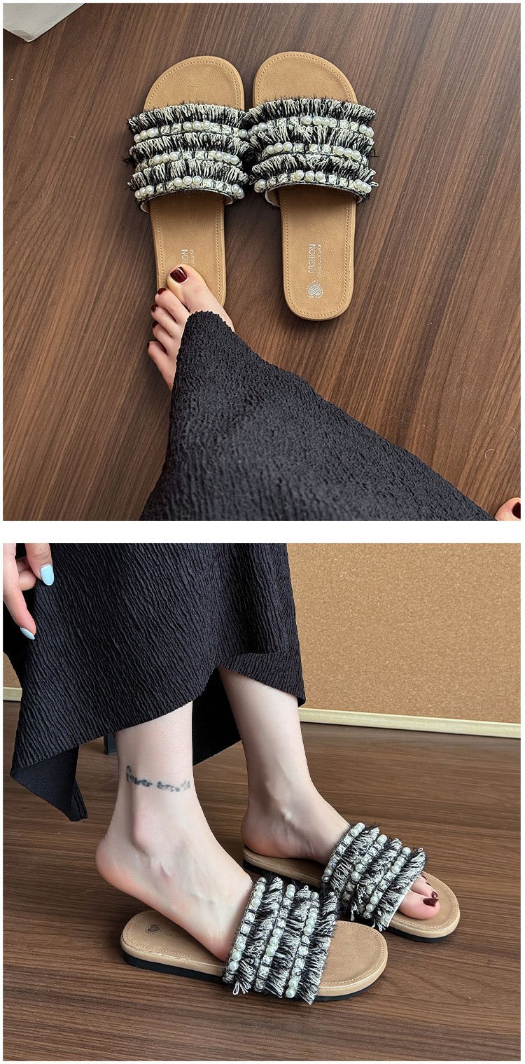 여름 아우터로 착용하는 여성용 진주 슬리퍼 2025 신상 패션 게으른 플랫 바닥 스커트 외출용 비치 샌들