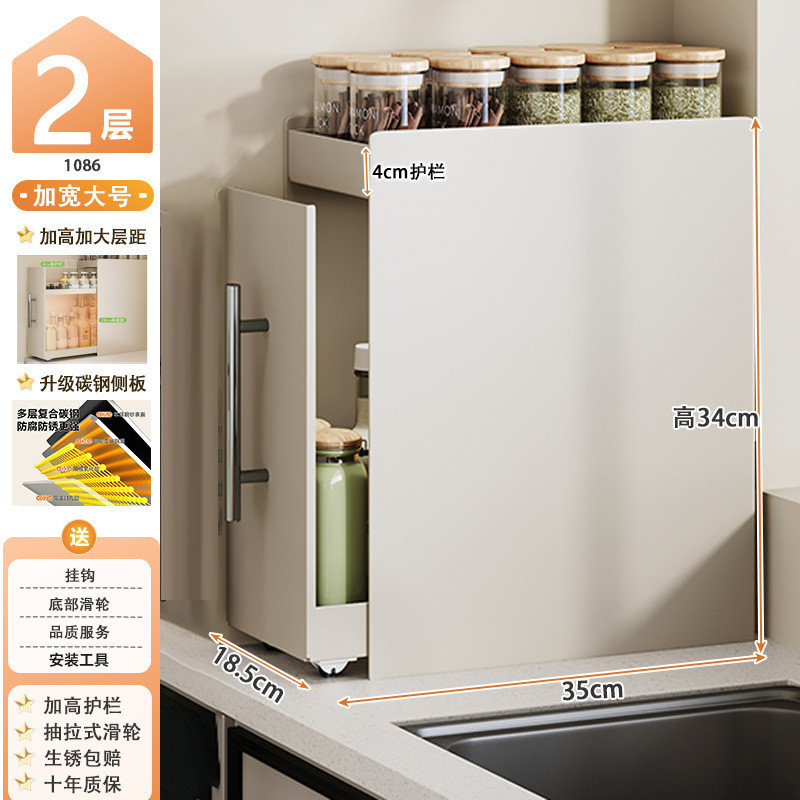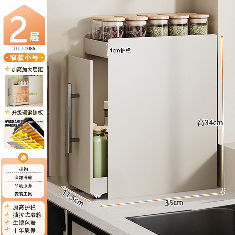 • ◑크림 화이트 분리형 풀아웃 조미료 캐비닛 [소형] 조리대 2단 단일 선반 - 두꺼운 탄소강, 내하중 강화, 녹 방지 및 내마모성◑
