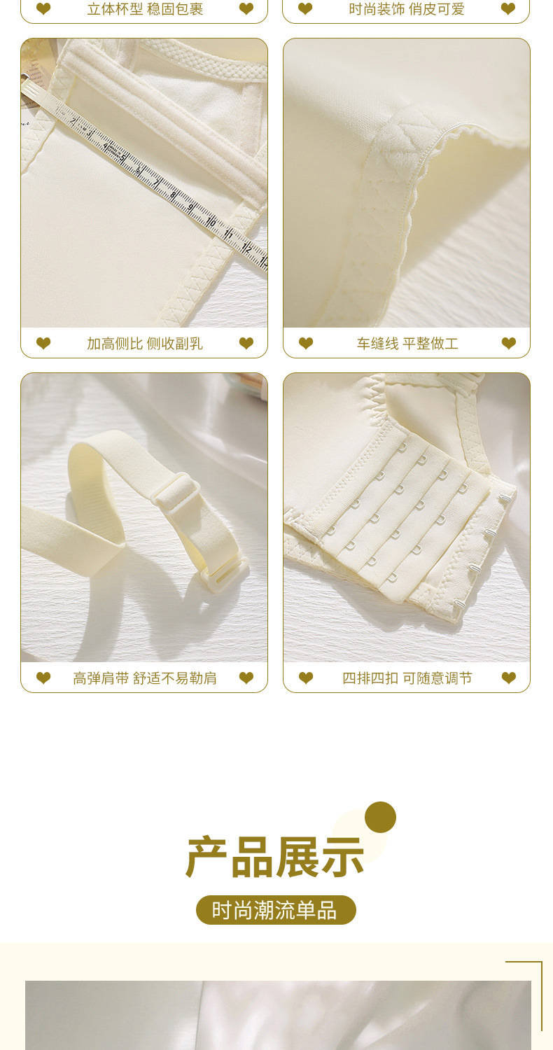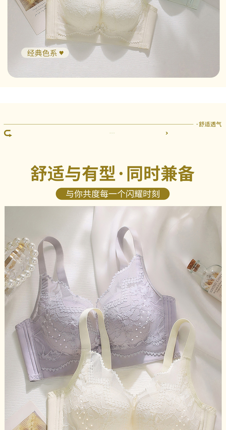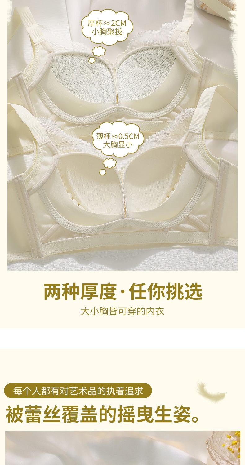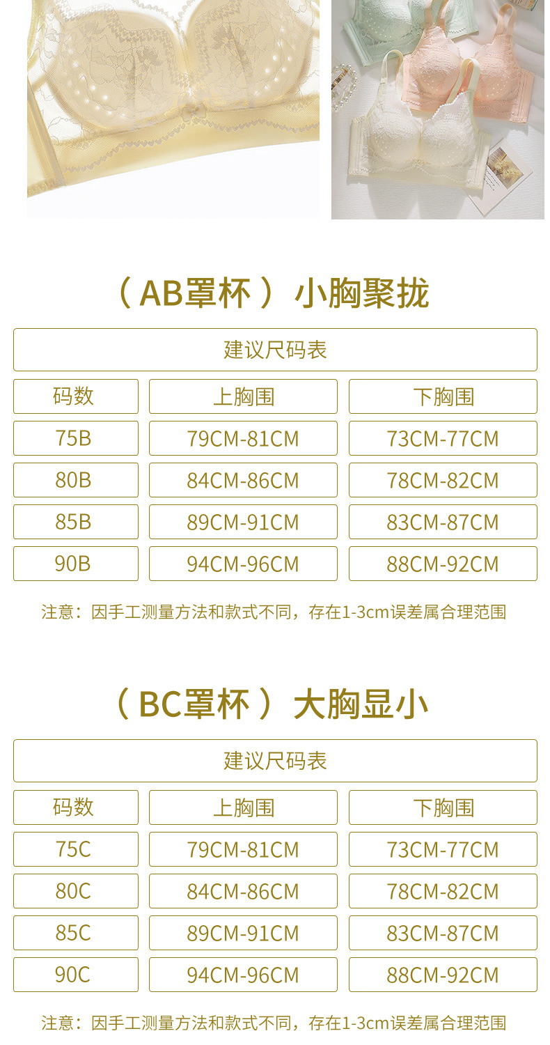 本款为女士蕾丝文胸,有二种不同模杯,32-40码AB通用中厚杯温感内里布料、34-40码BC通用洞洞杯,有黑/香槟/粉肤/绿色/紫色共五个颜色,固定可调节防滑肩带,任意裁侧翼边布,后四排扣设计,仅单件,无配套内裤。