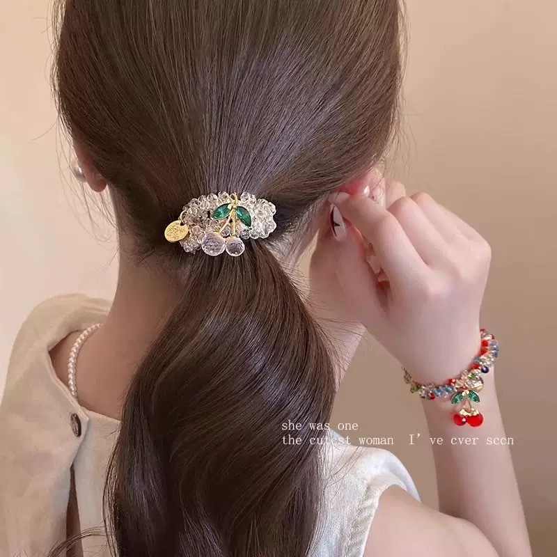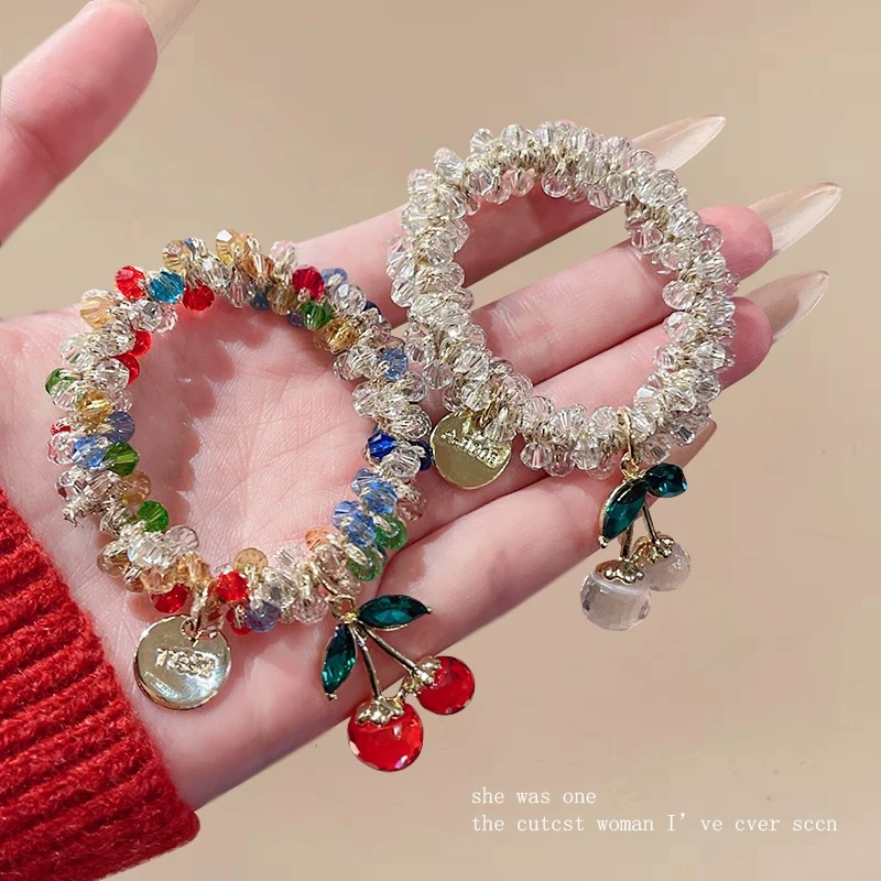한국 라인스톤 컬러 크리스탈 팔찌 이중 목적 헤어 링 헤어 로프 여자 헤어 로프 체리 고무 스트랩 페이테일 헤드웨어 여성스토어 가기