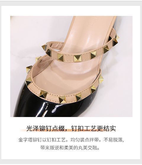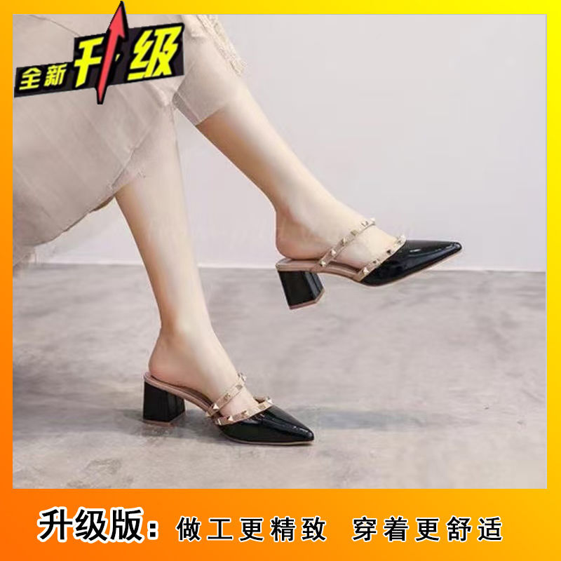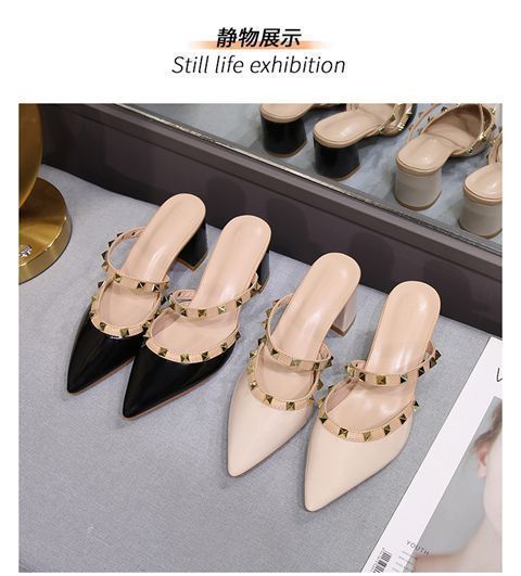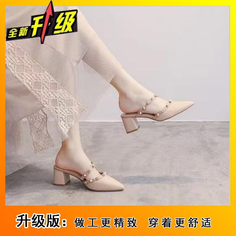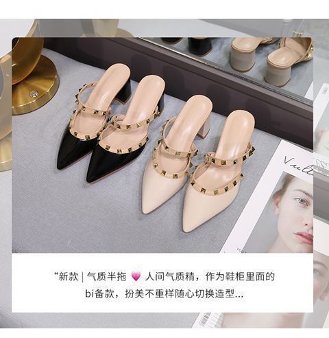 여성을 위한 뾰족한 굽의 고급 리벳 슈퍼 핫 하프 슬리퍼 2025 새로운 슬립온 미드 힐 토 슬리퍼스토어 가기