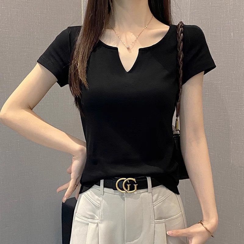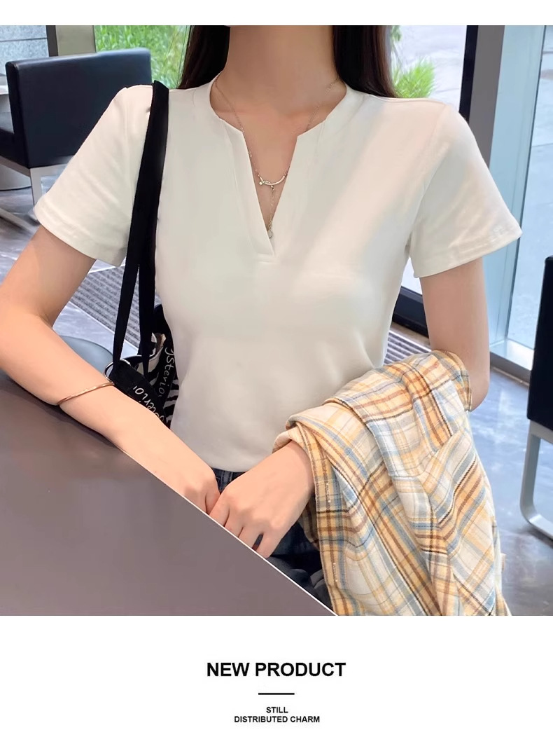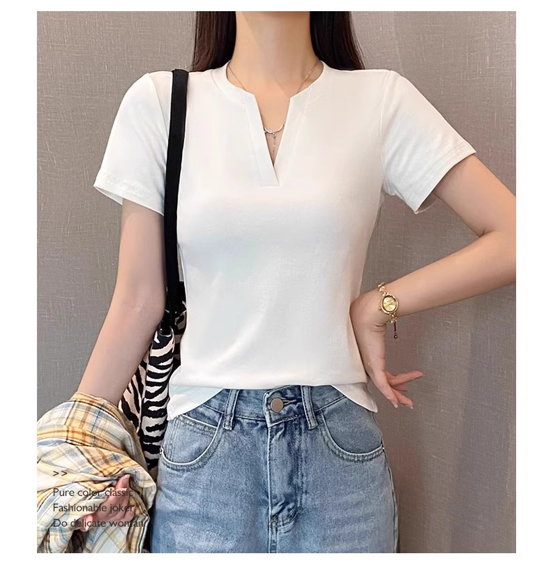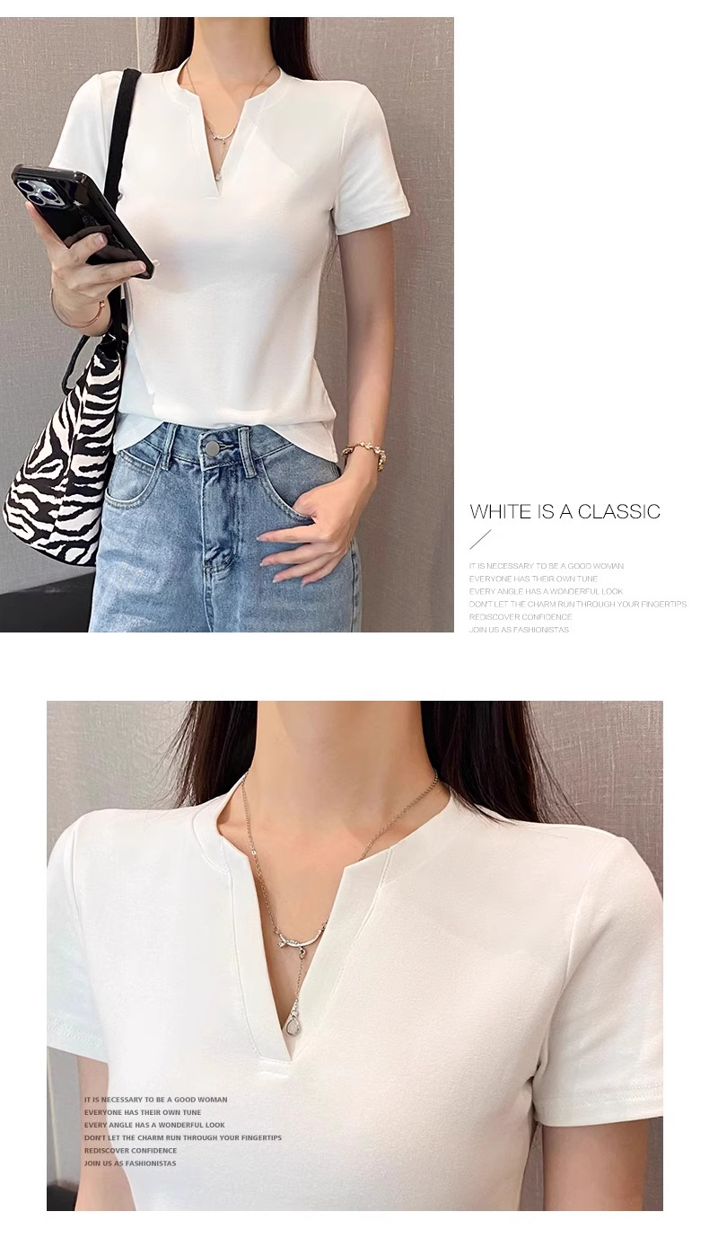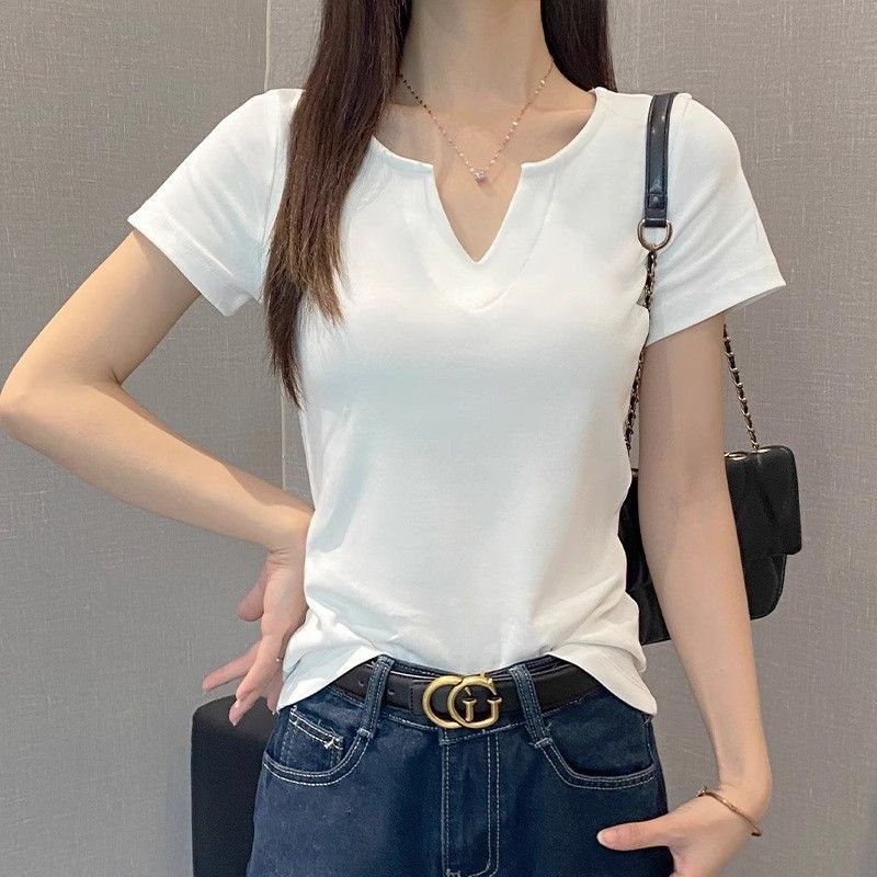 여성용 화이트 오른쪽 어깨 브이넥 반팔 티셔츠 2025 봄 여름 신상 슬림핏 이너 레이어드 셔츠 디자인 탑스토어 가기