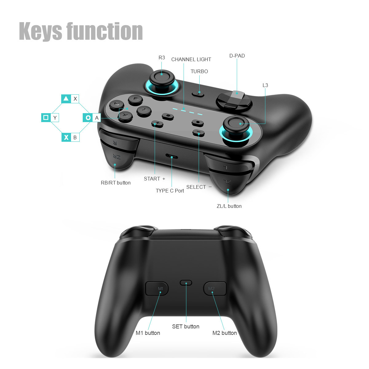 产品规格:支持六轴、双震动、TURBO连打功能、RGB光圈、背键可编程、内置600毫安聚合物锂电池、TURBO速度和振动强弱均可调节