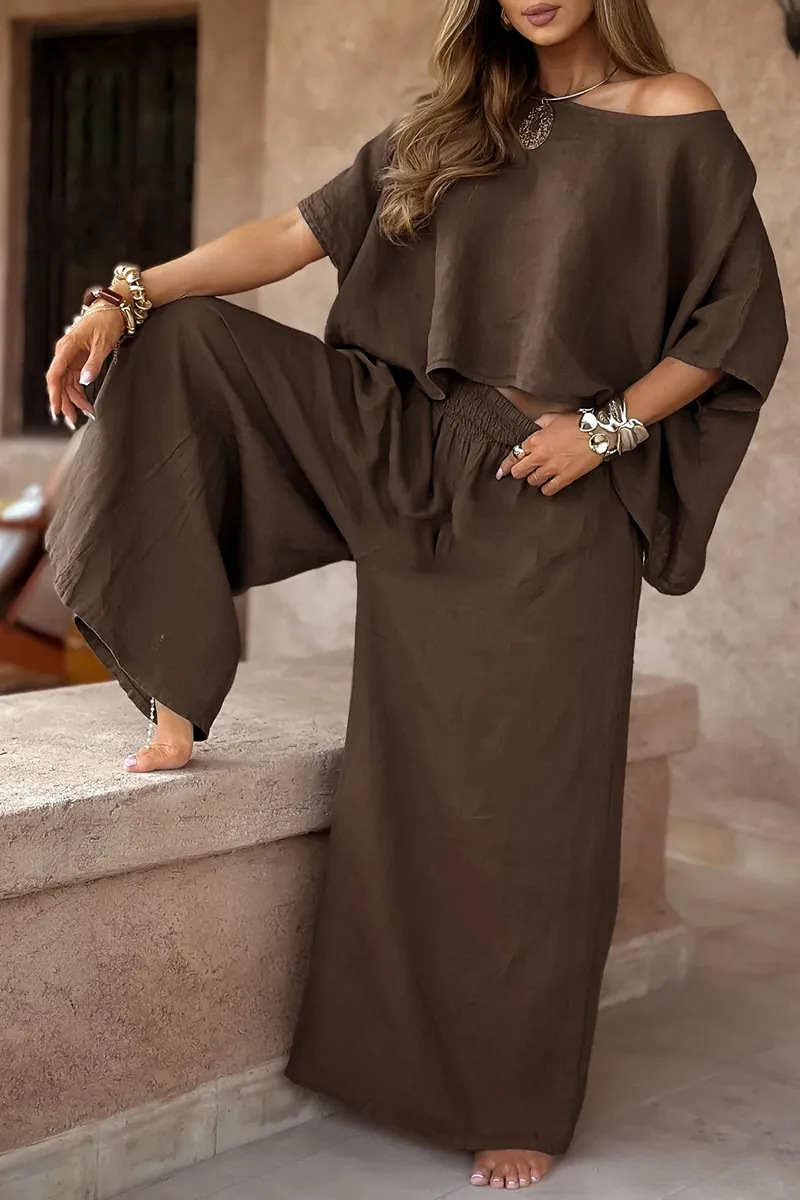 2025 유럽과 미국의 국경 간 아마존 독립 역 단색 폭발 캐주얼 느슨한 둥근 목 어깨 여름 여성 세트스토어 가기