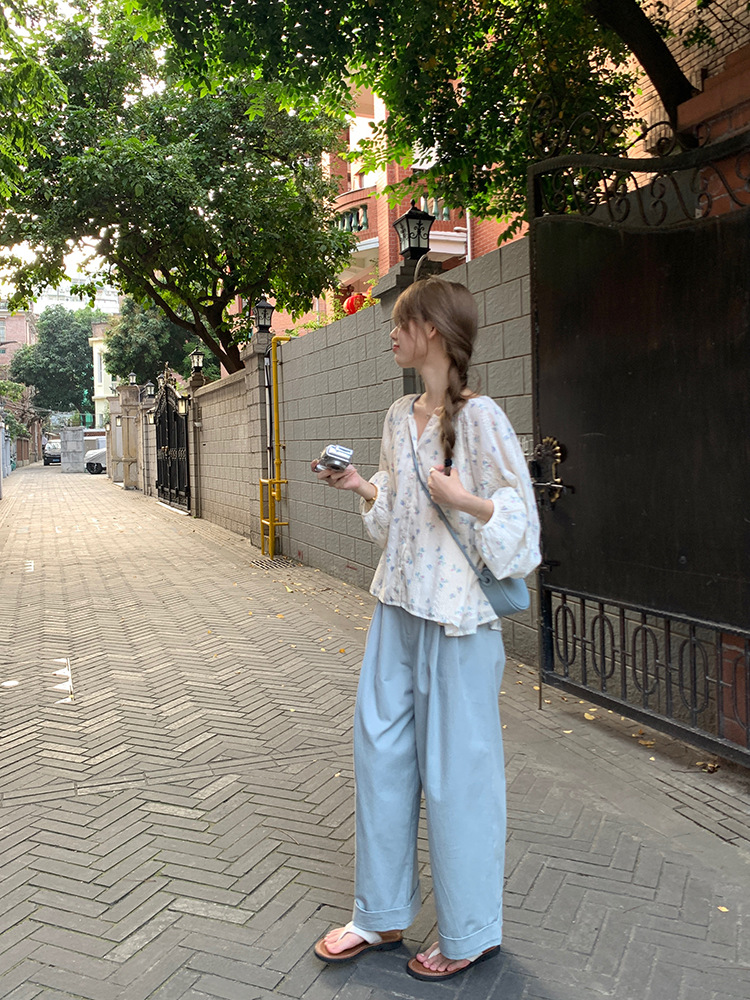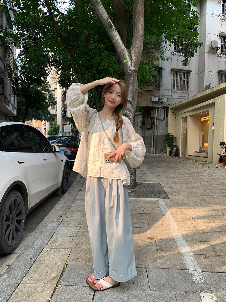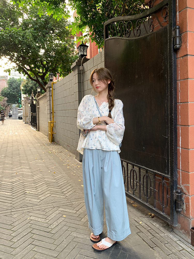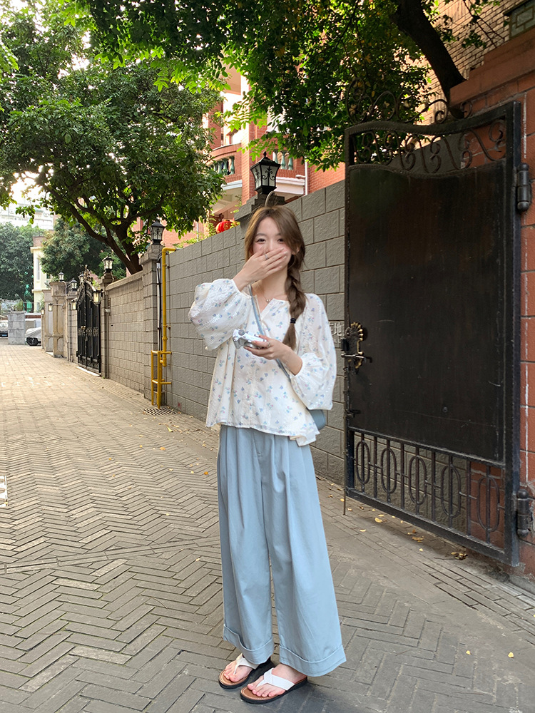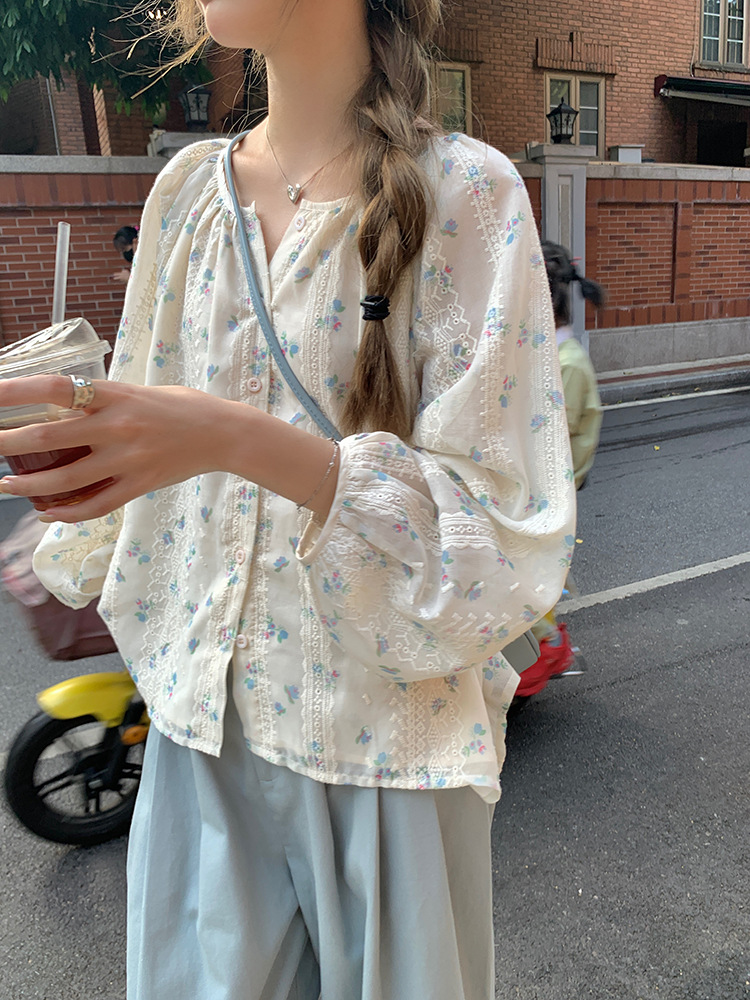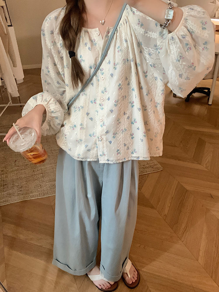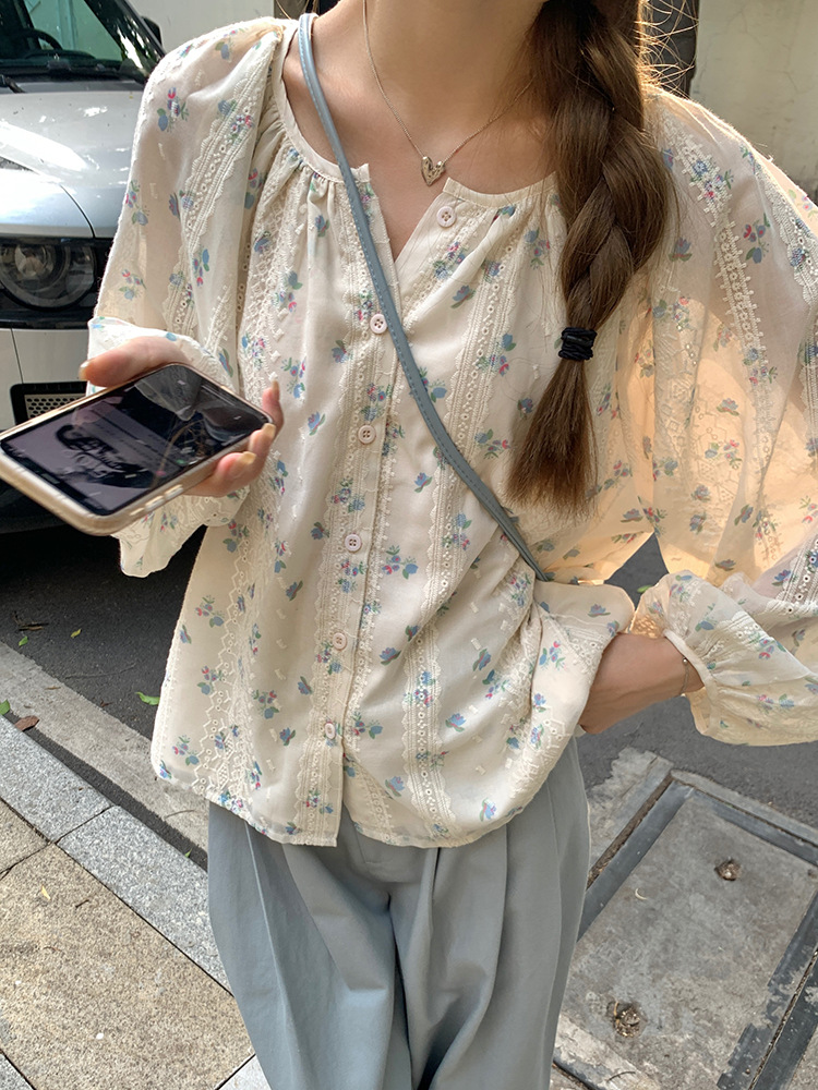 작고 상큼한 연령 감소 탑, 꽃무늬 긴팔 셔츠, 작은 사람들을 위한 루즈하고 슬림한 라운드 넥, 달콤하고 여성스러운 쉬폰 셔츠